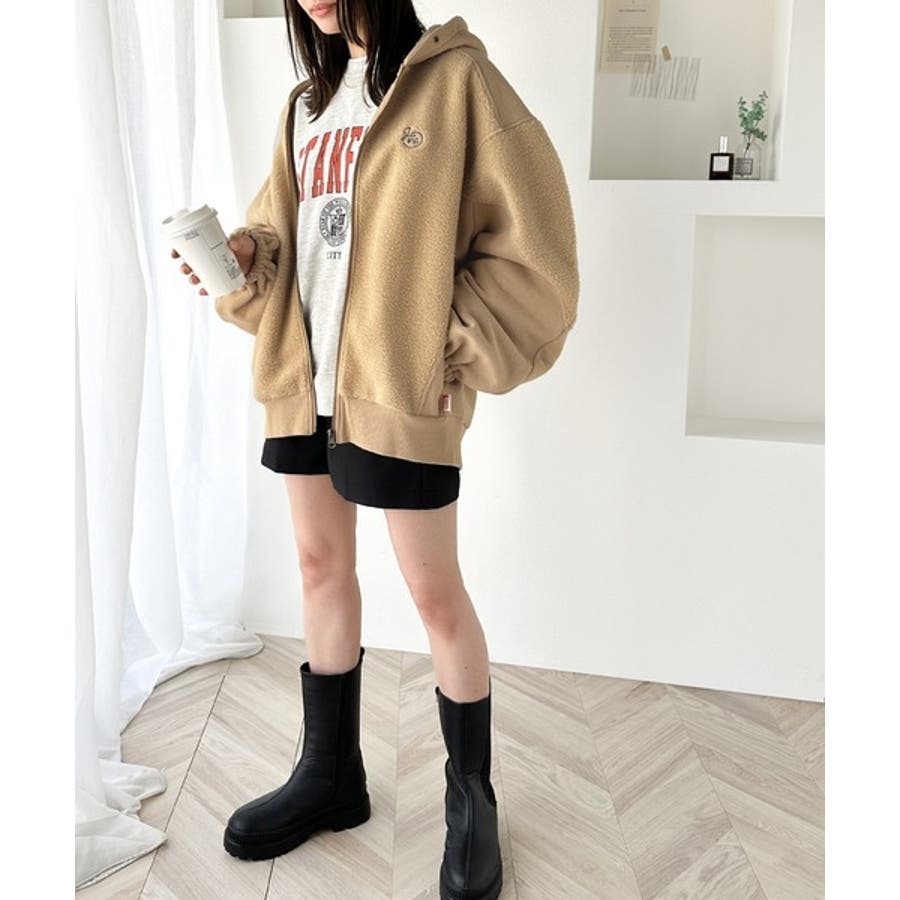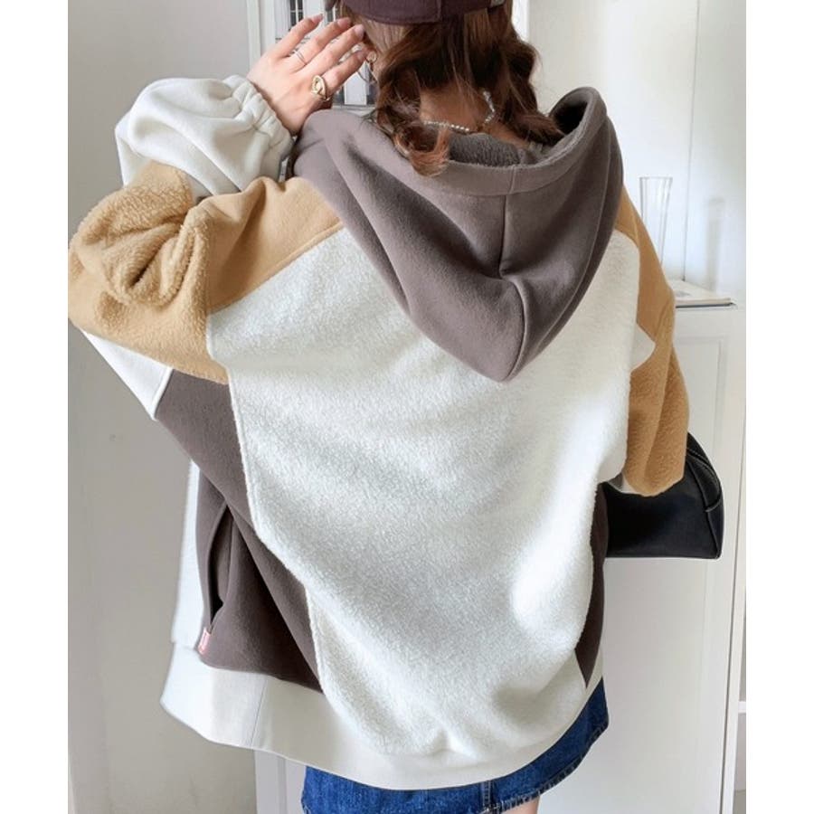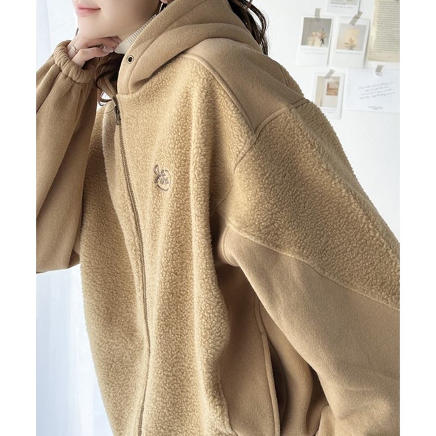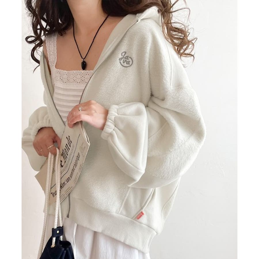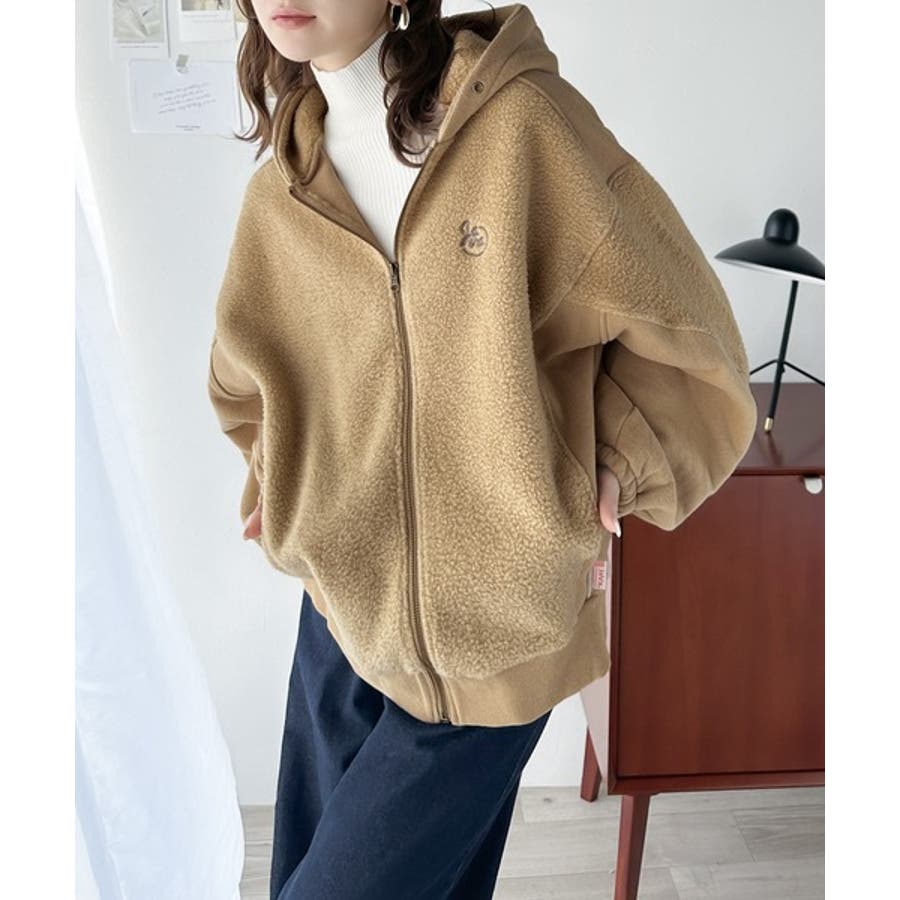 表と裏(ボア)で切り替えた異素材組み合わせのフードジップパーカー。