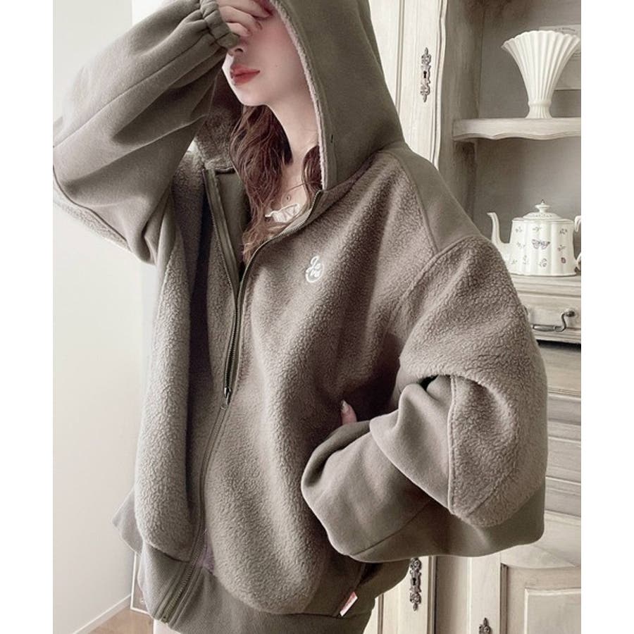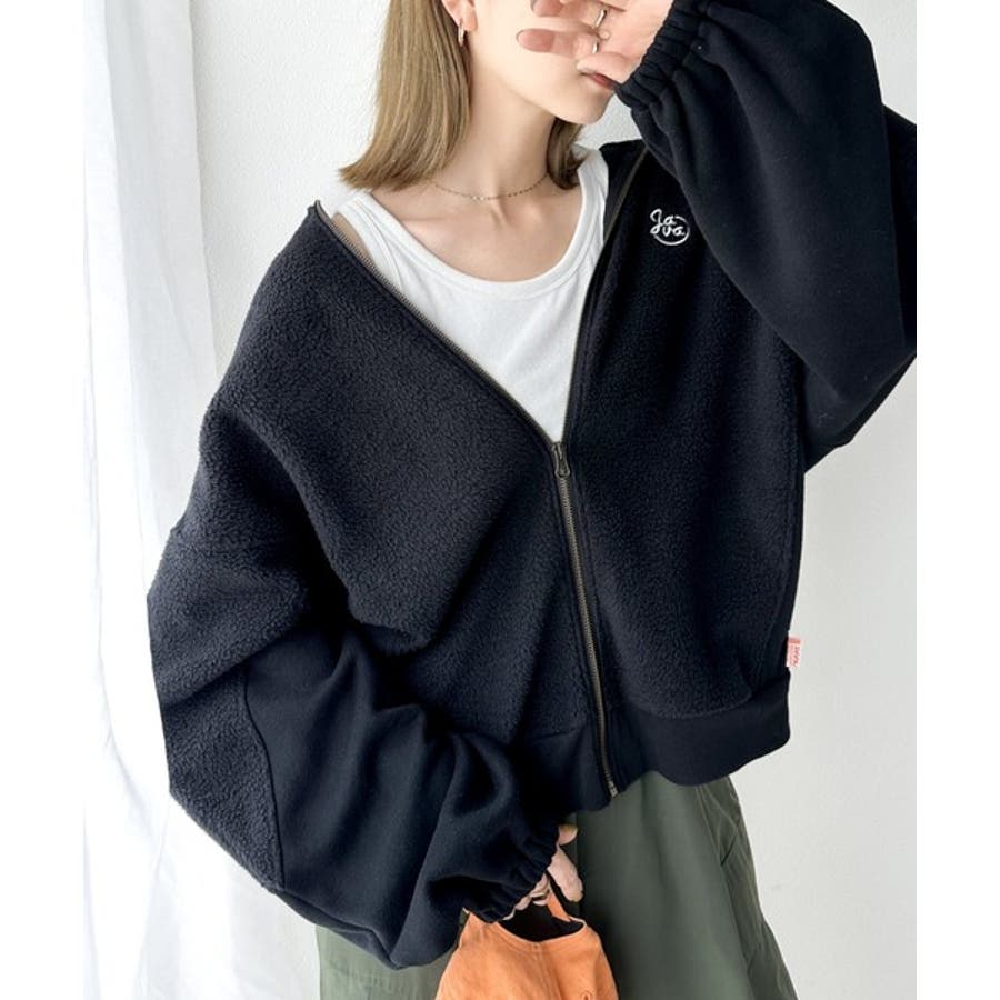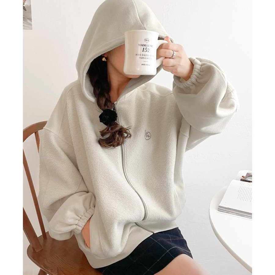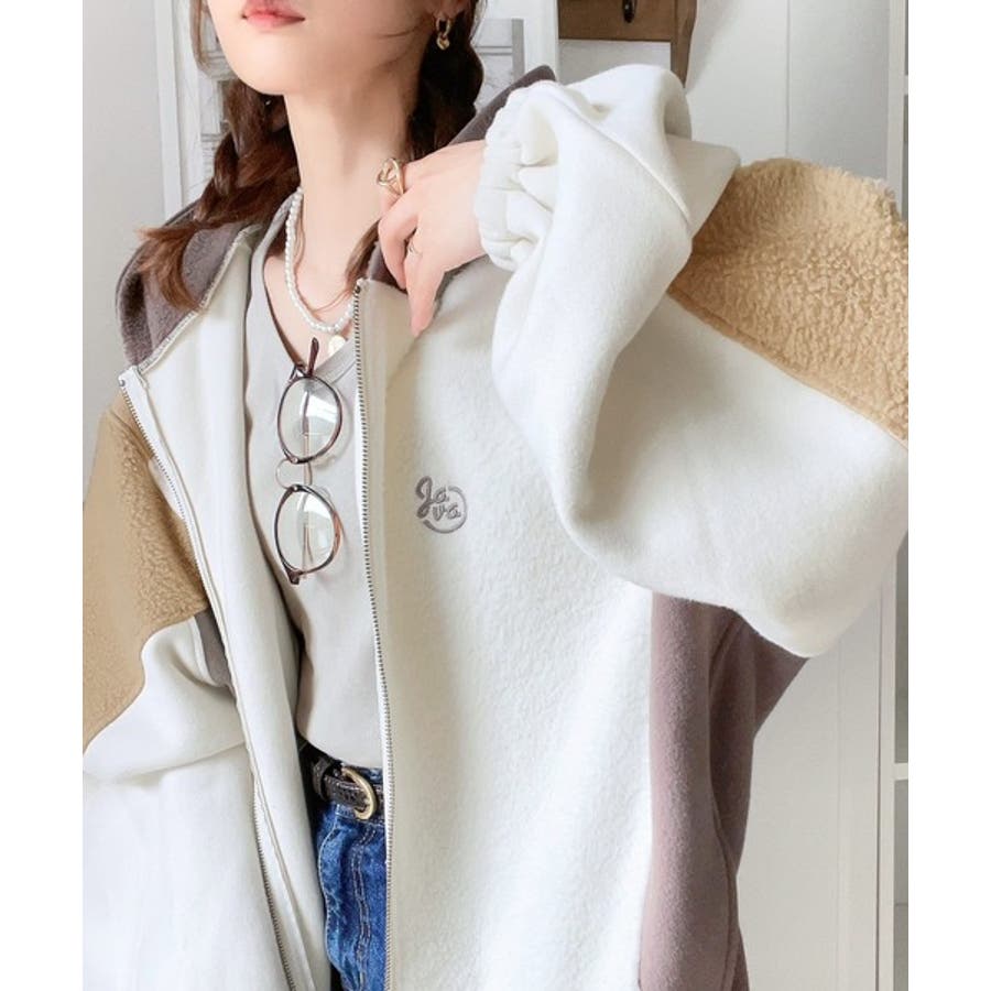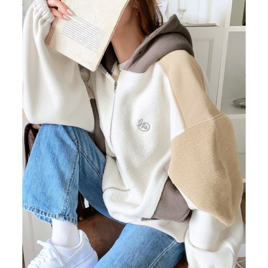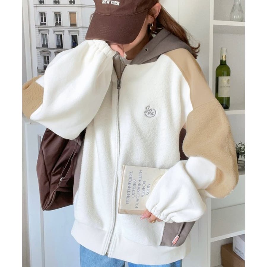 表と裏(ボア)で切り替えた異素材組み合わせのフードジップパーカー。