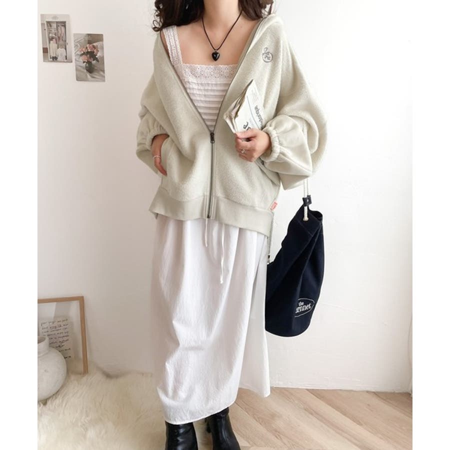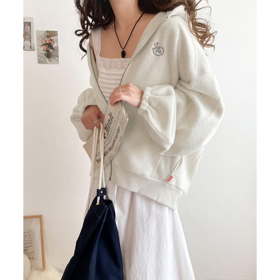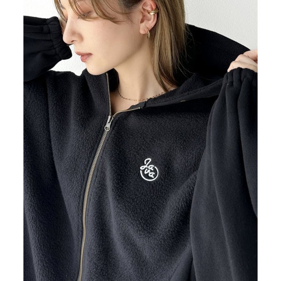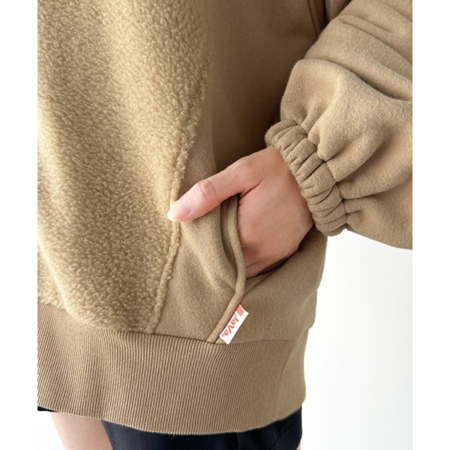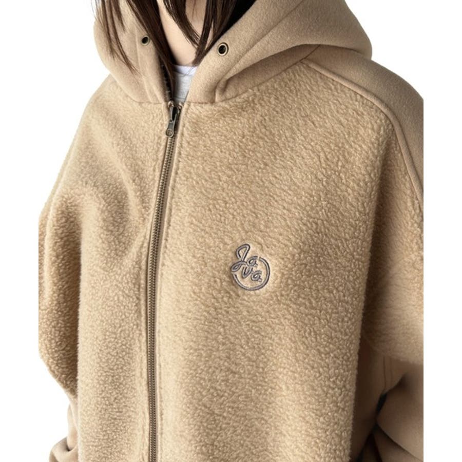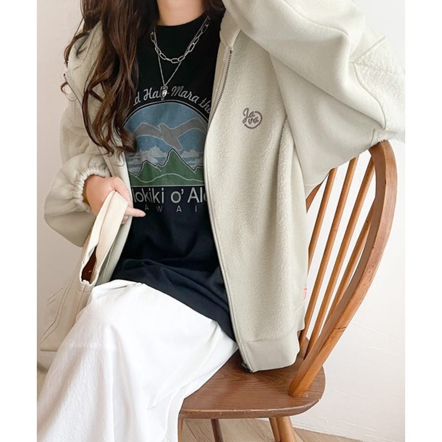 表と裏(ボア)で切り替えた異素材組み合わせのフードジップパーカー。