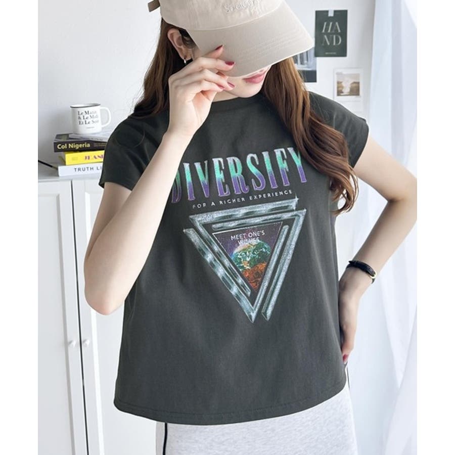 女性らしいフレンチスリーブとロックプリントがトレンド感ある甘辛コーデを演出します。