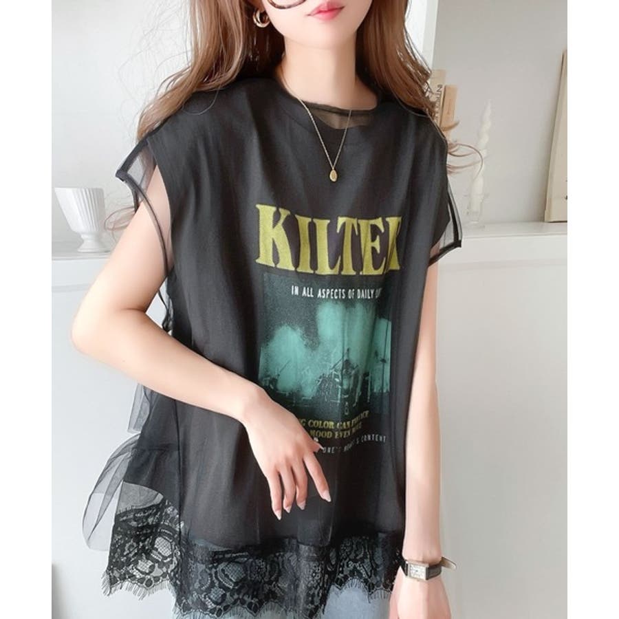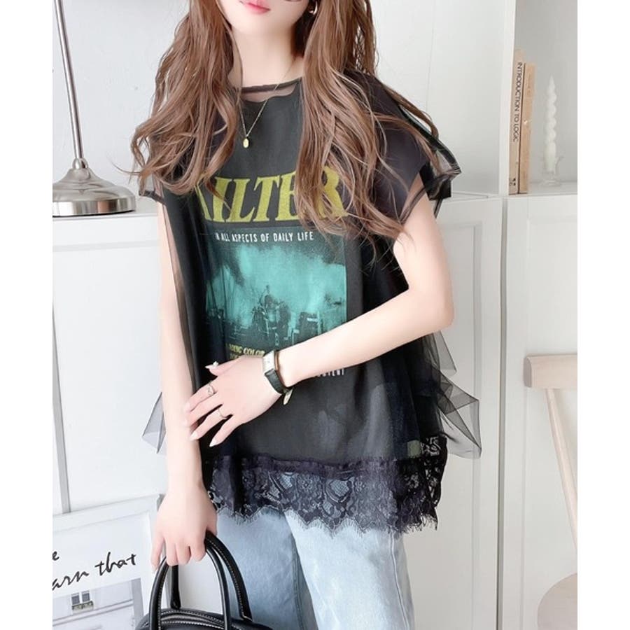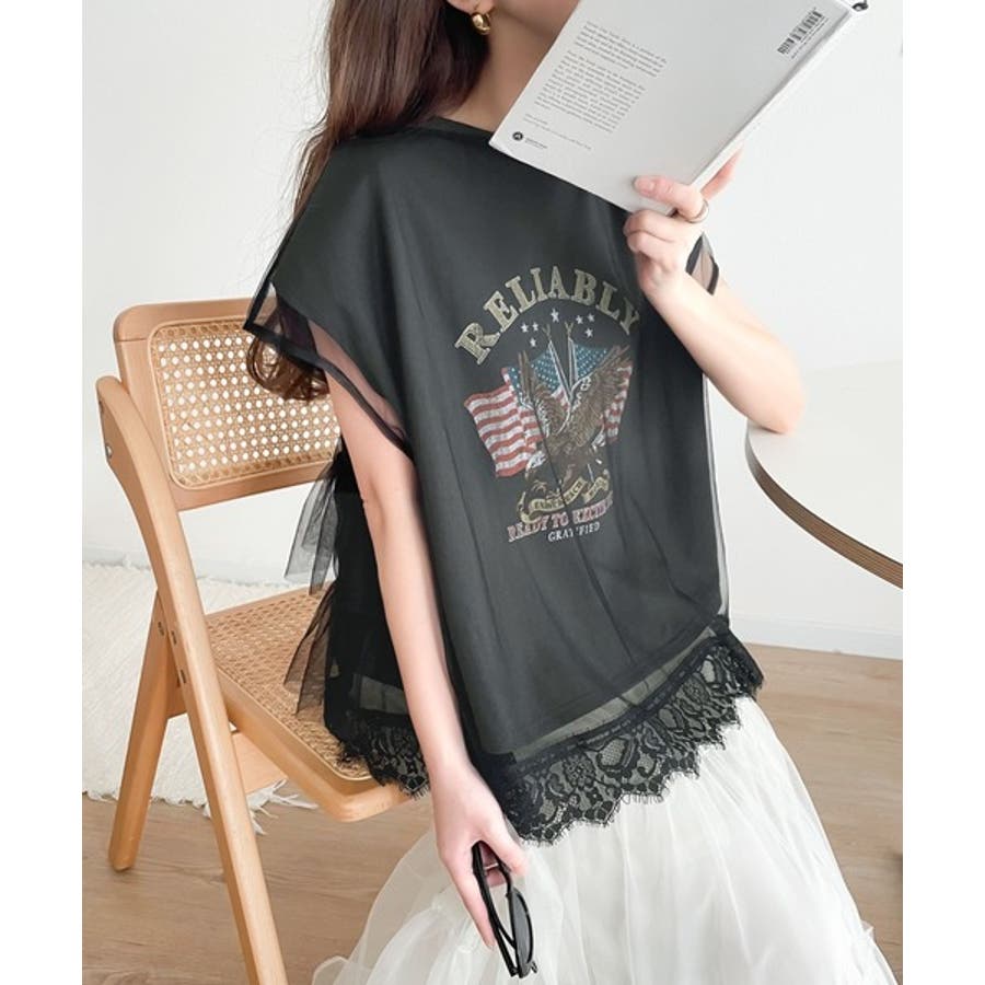 生地:〈プリントTシャツ〉本体:綿100% リブ部分:綿98%、ポリウレタン2% 〈チュールプルオーバー〉本体:ナイロン65%、ポリエステル35% レース部分:ナイロン100%