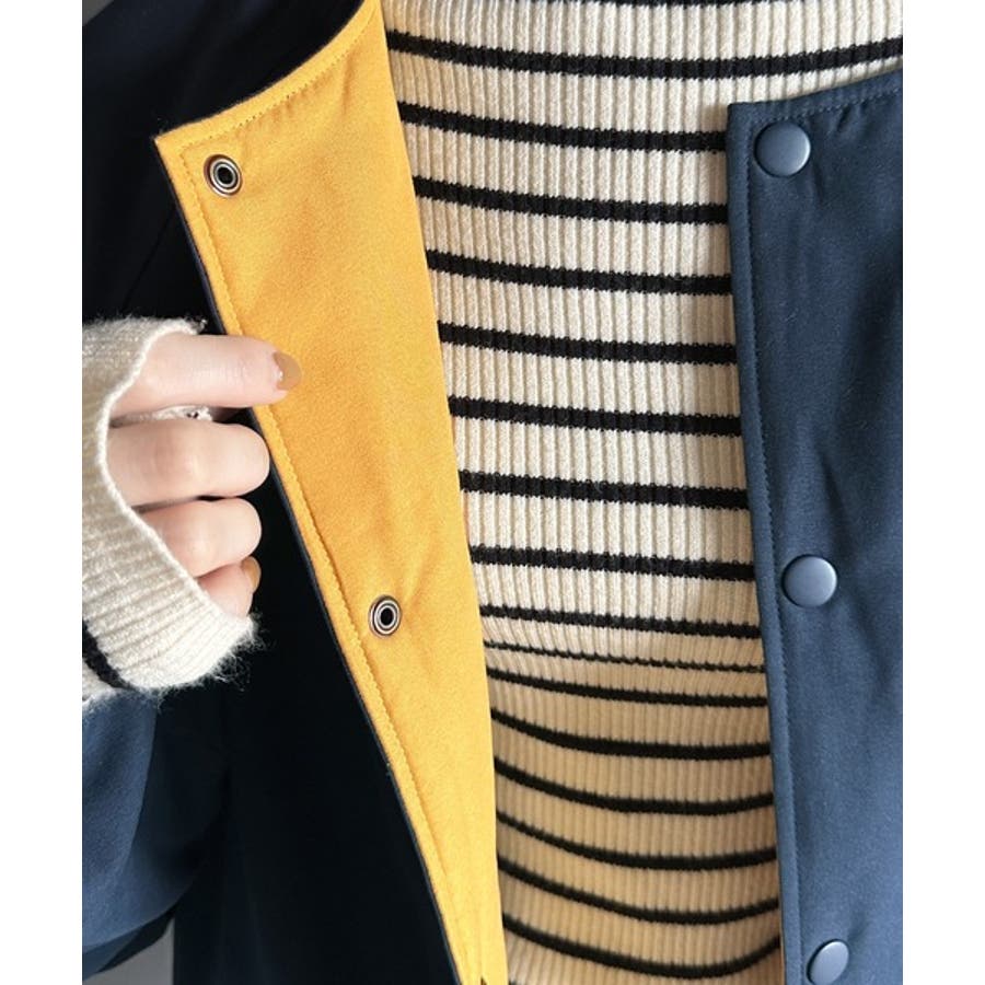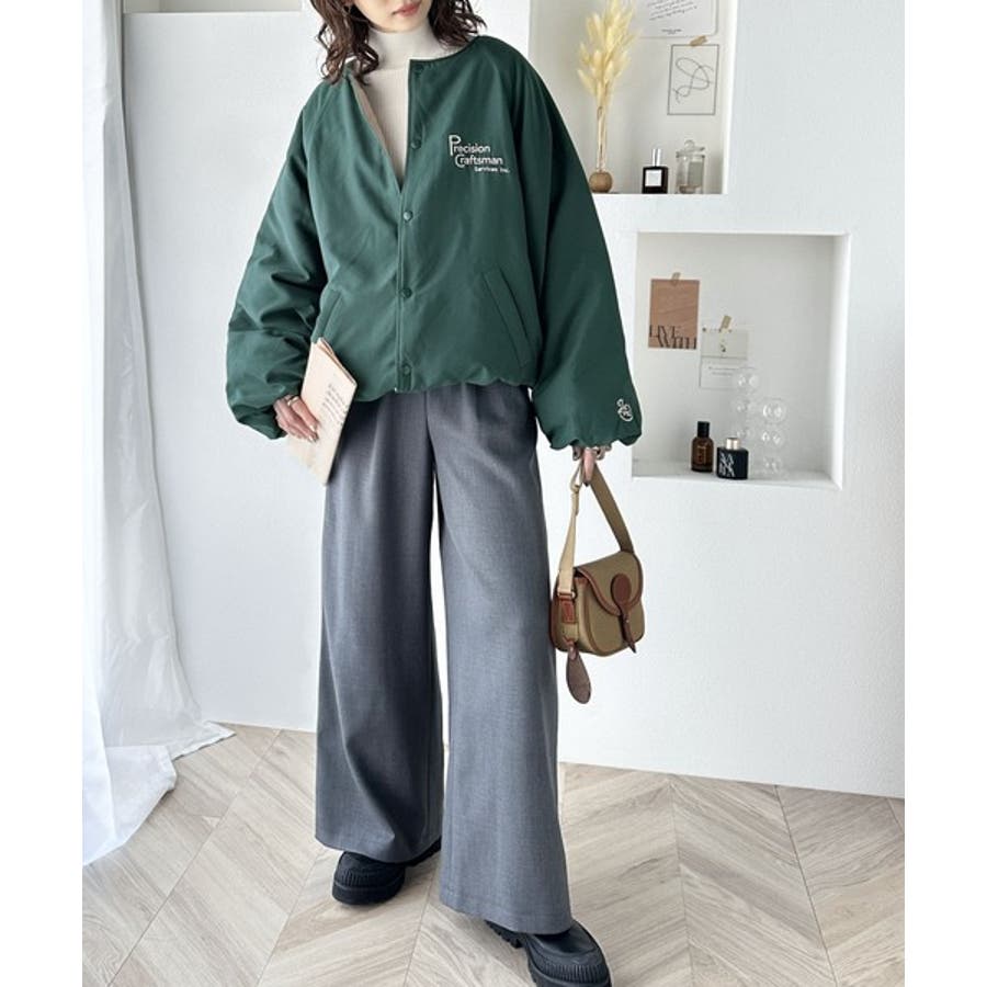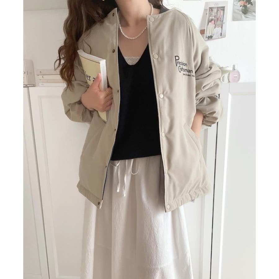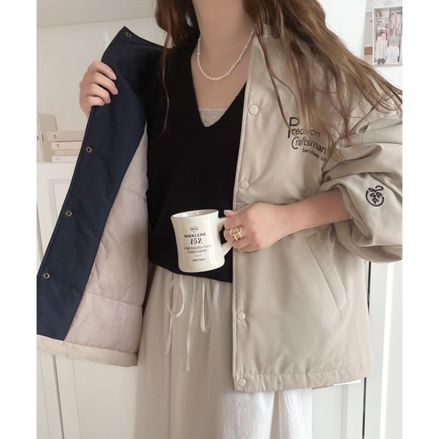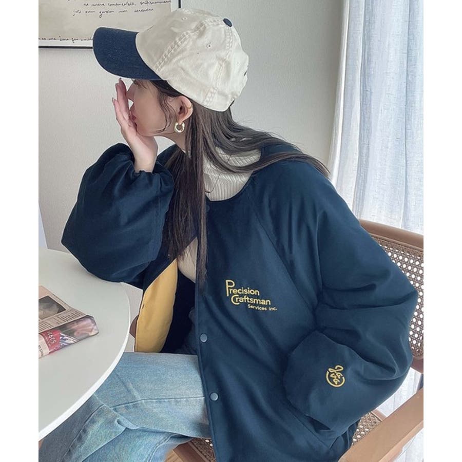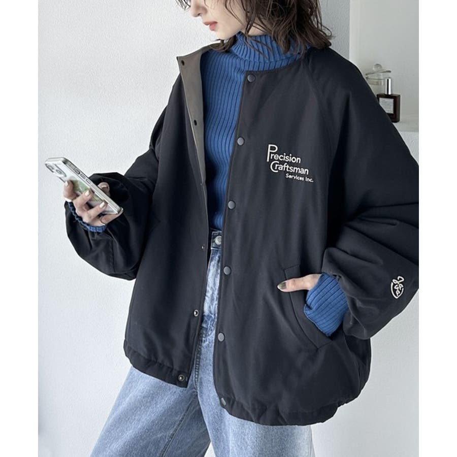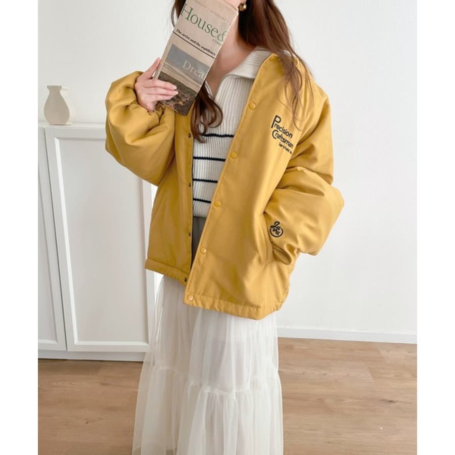 見返しと同じ色の配色刺繍がポイントの中綿入りブルゾン。