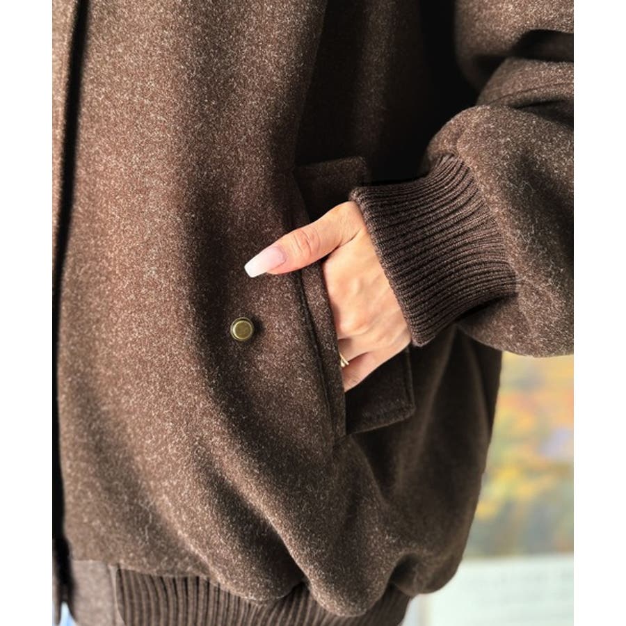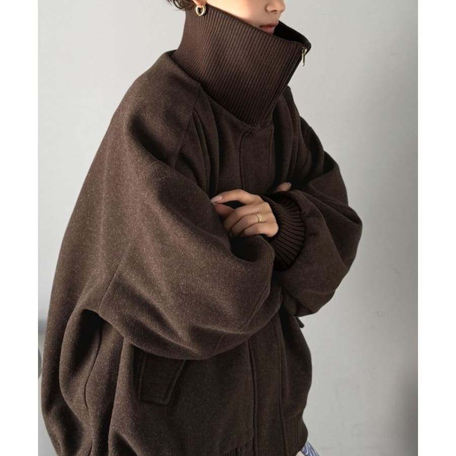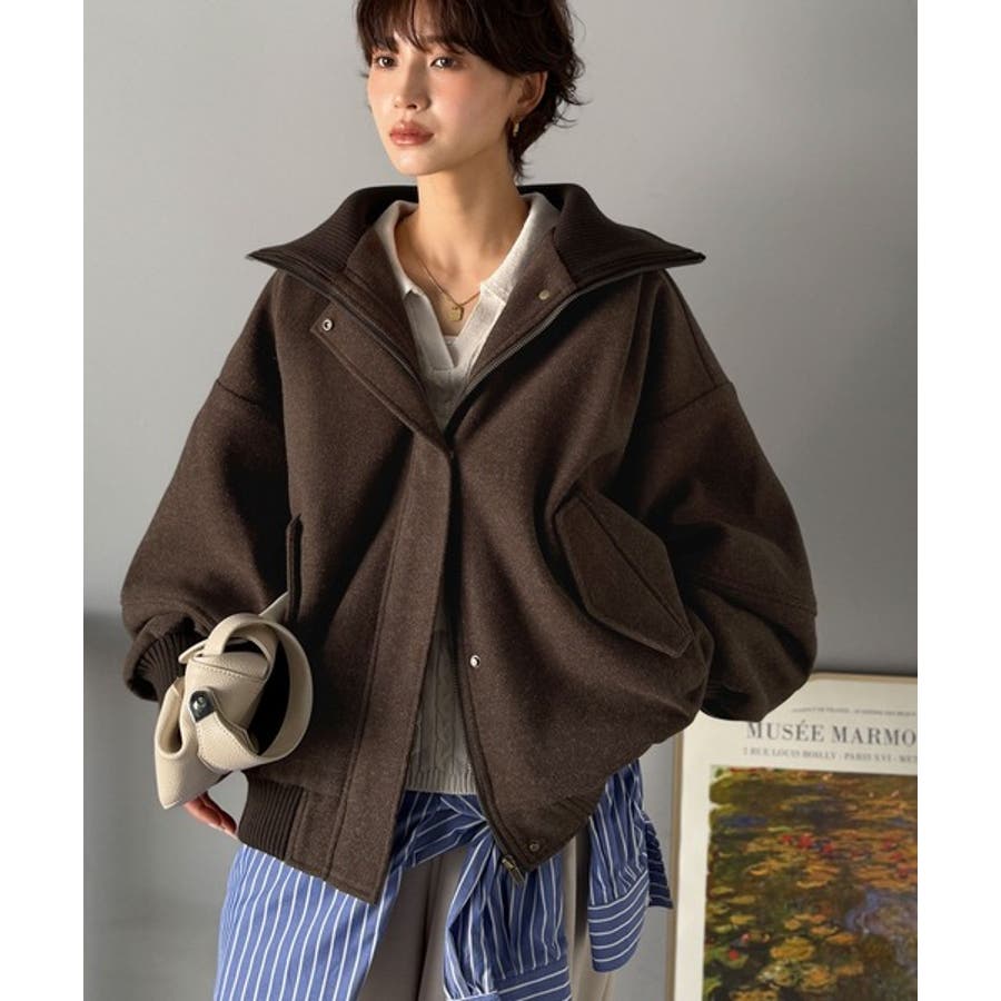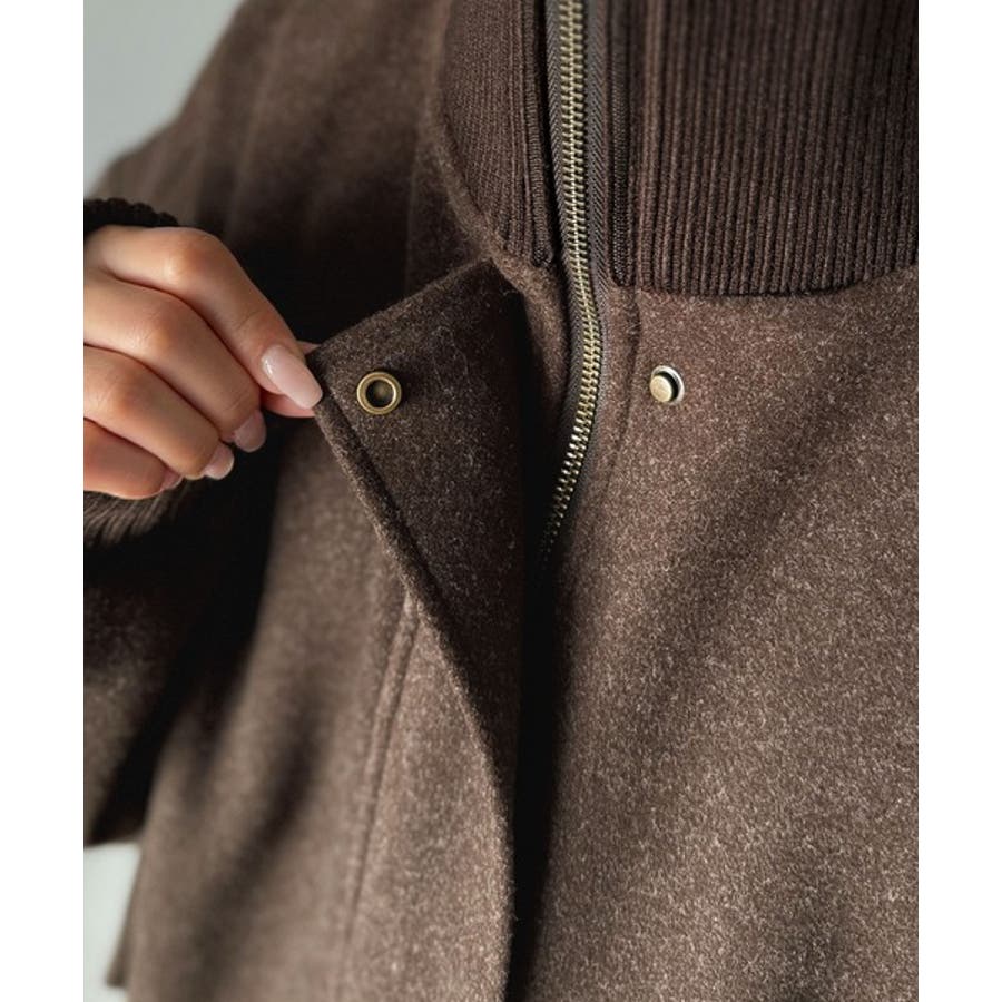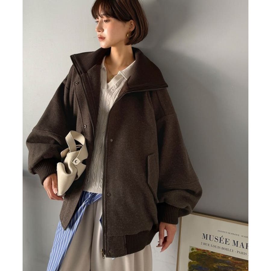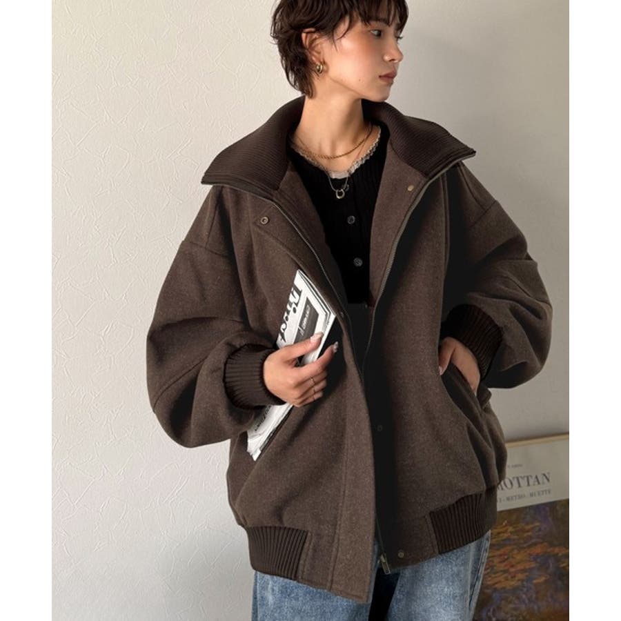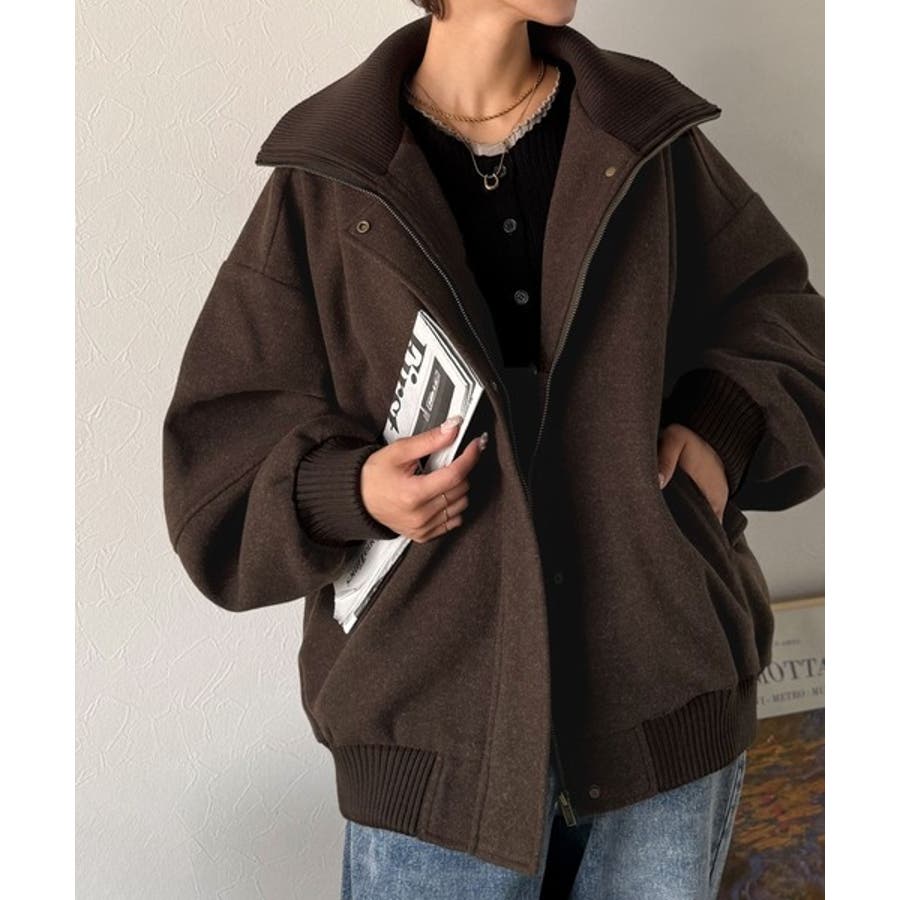 【ブラウン】デイリーに輝く一着! 襟リブニットメルトン比翼ブルゾン オーバーサイズ