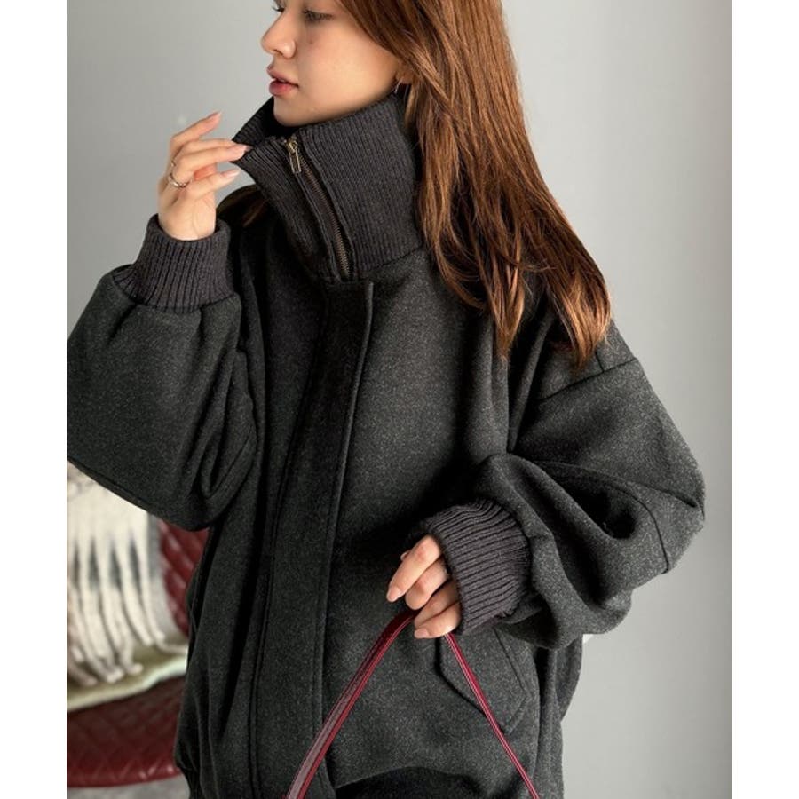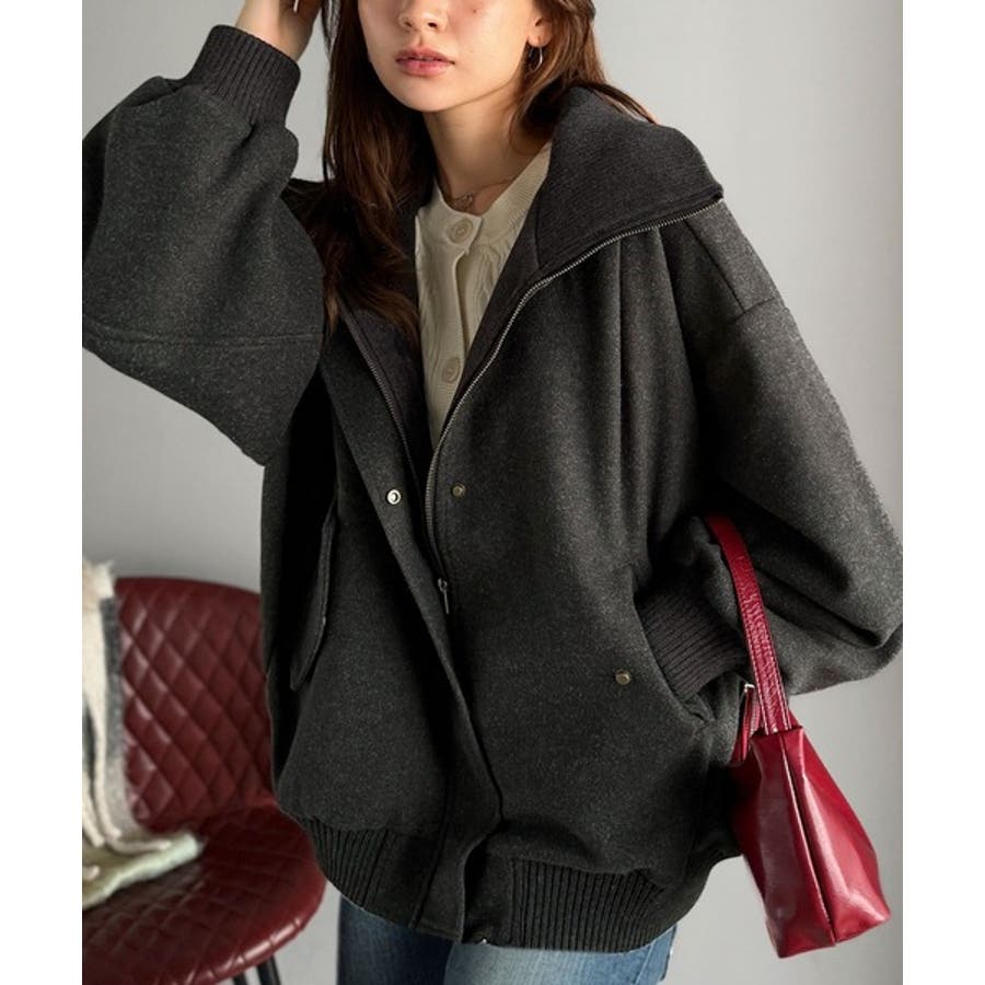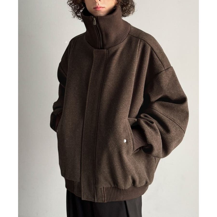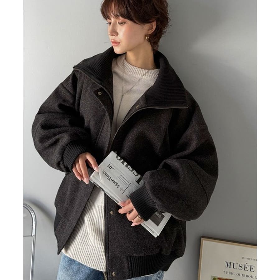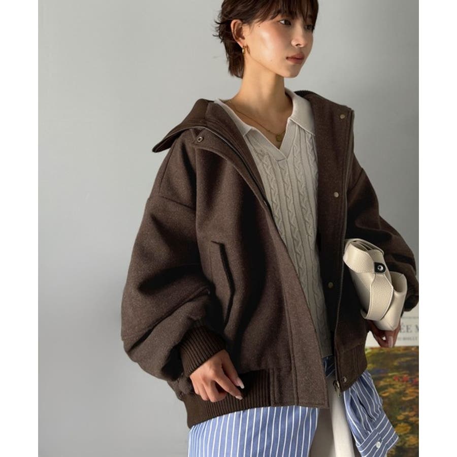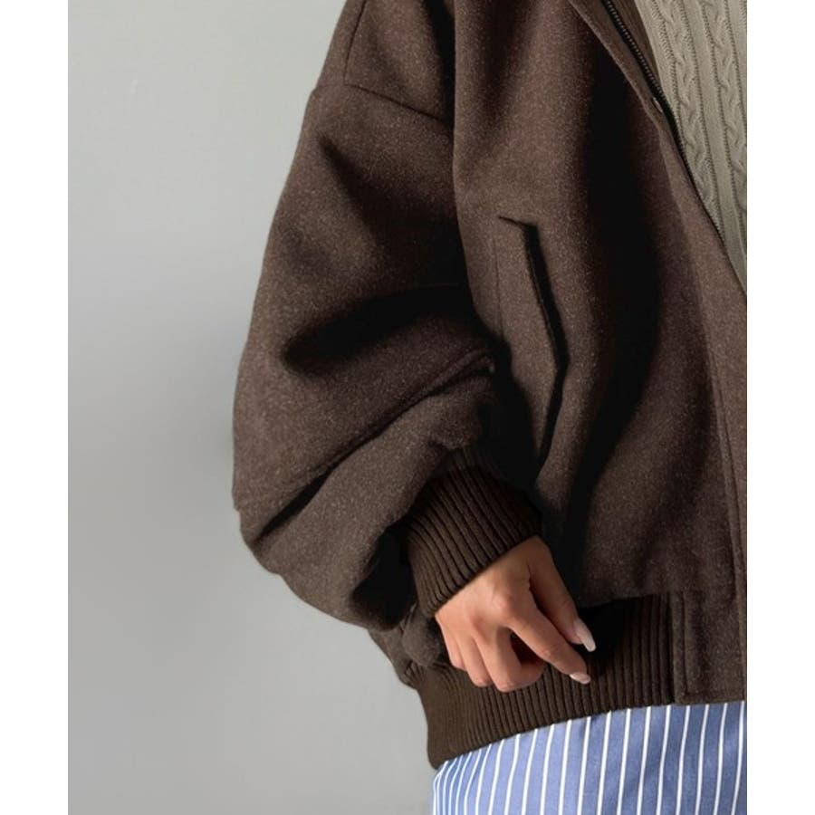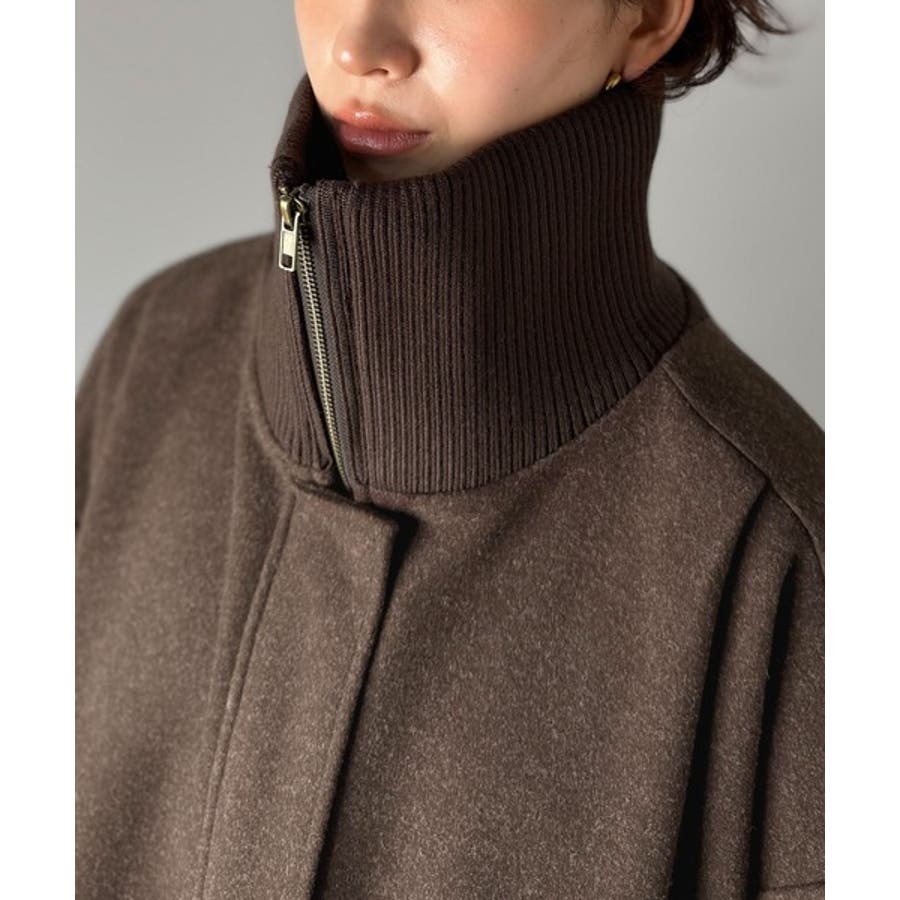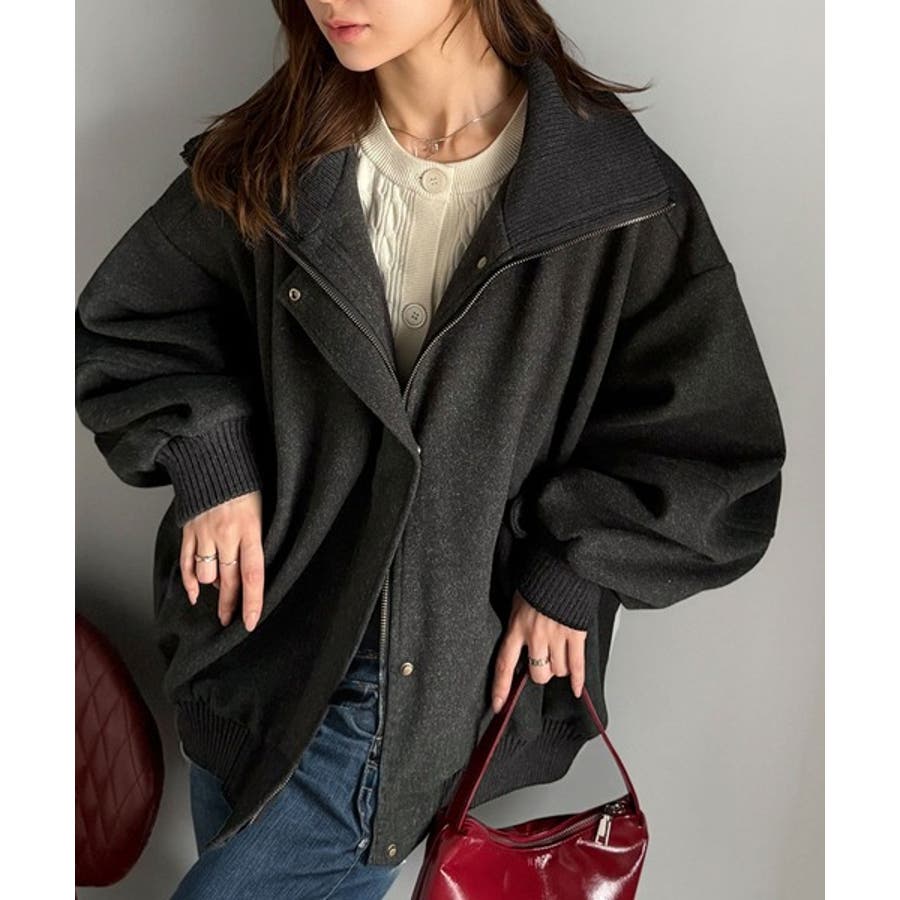 【ブラウン】デイリーに輝く一着! 襟リブニットメルトン比翼ブルゾン オーバーサイズ