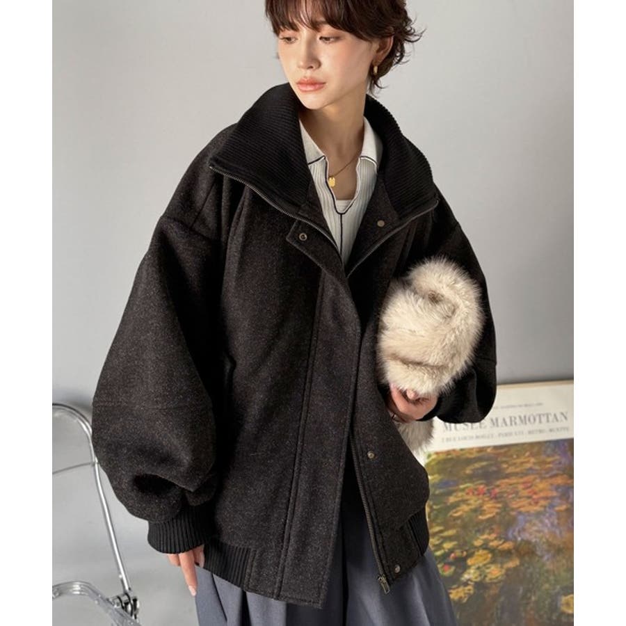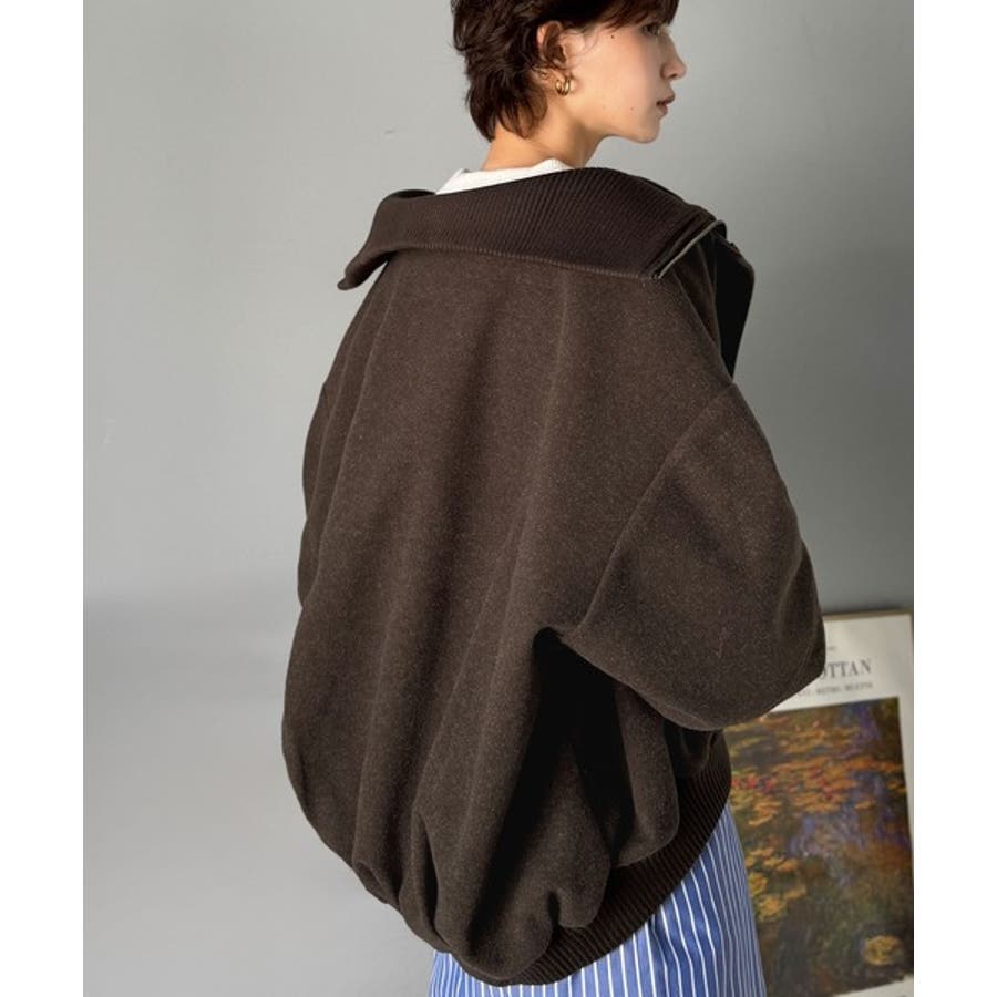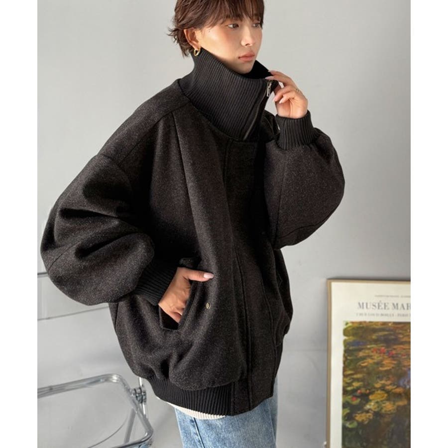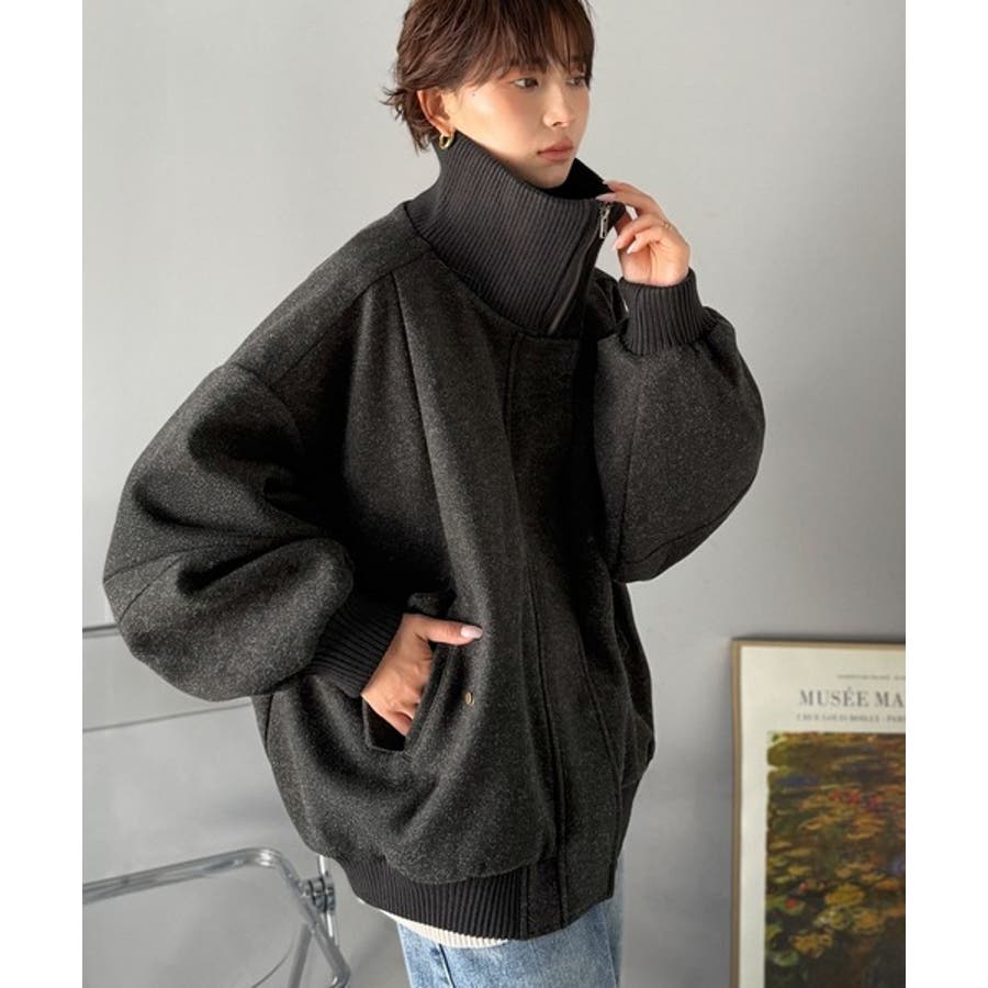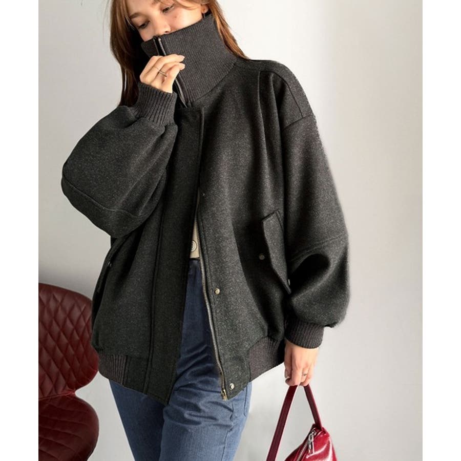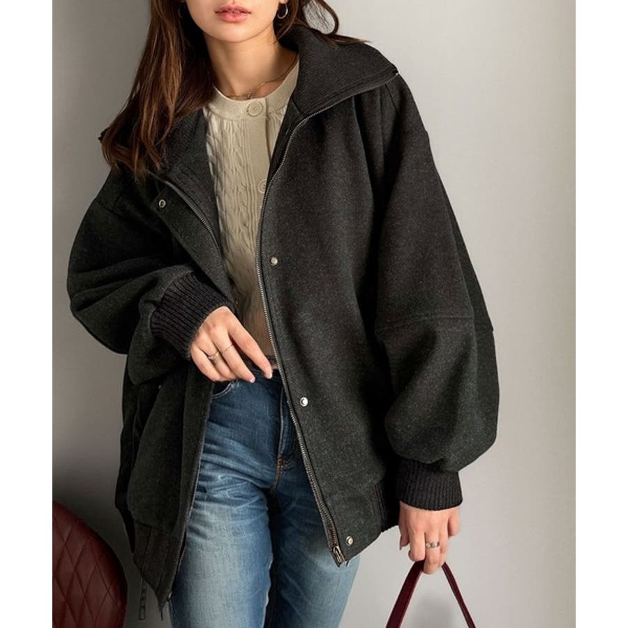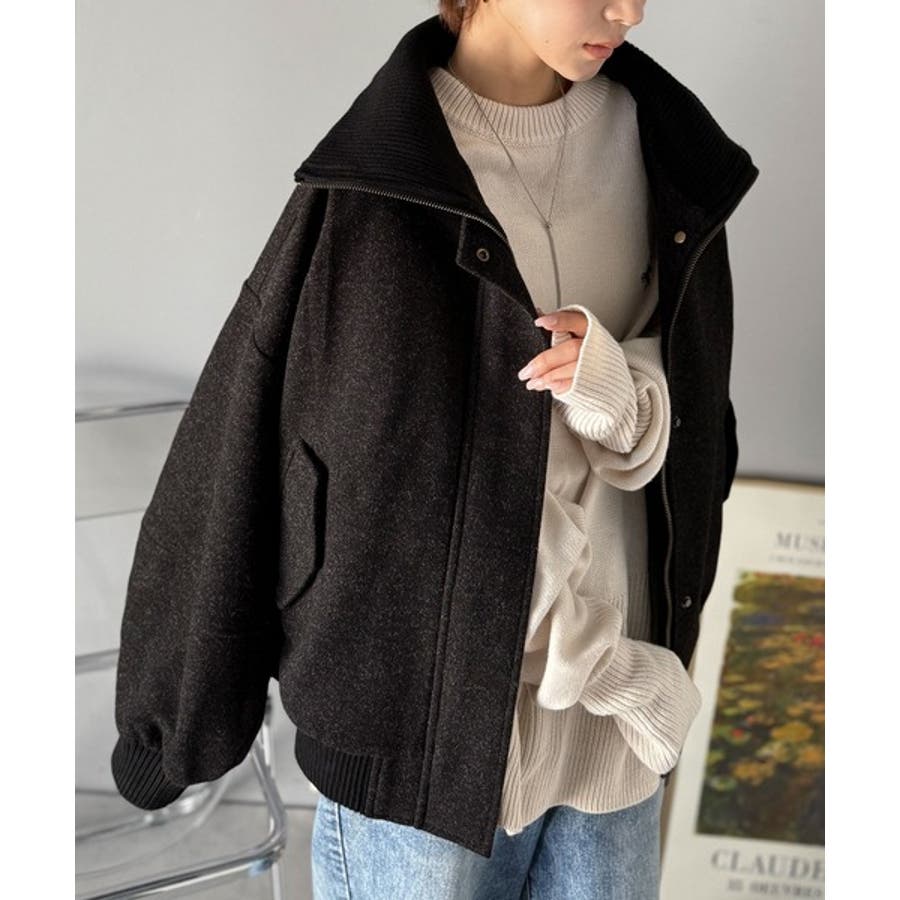 【ブラウン】デイリーに輝く一着! 襟リブニットメルトン比翼ブルゾン オーバーサイズ