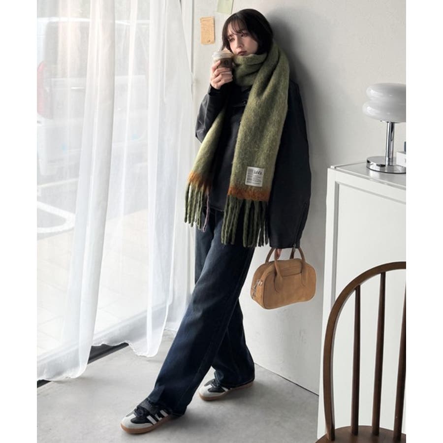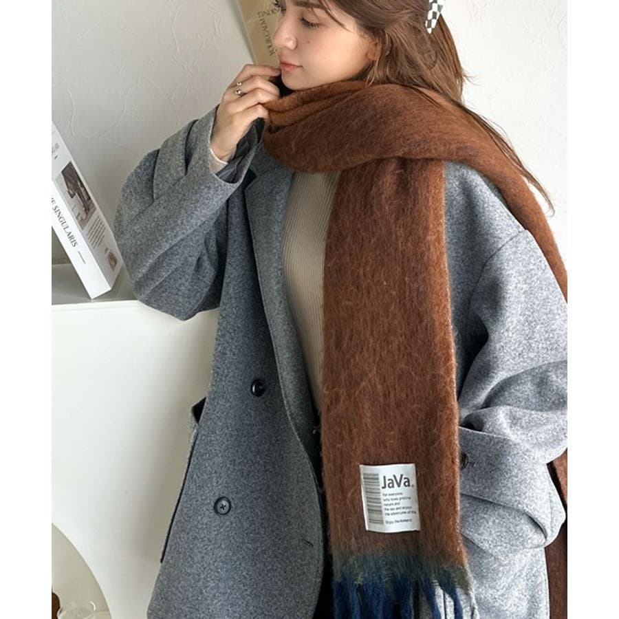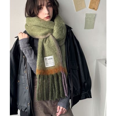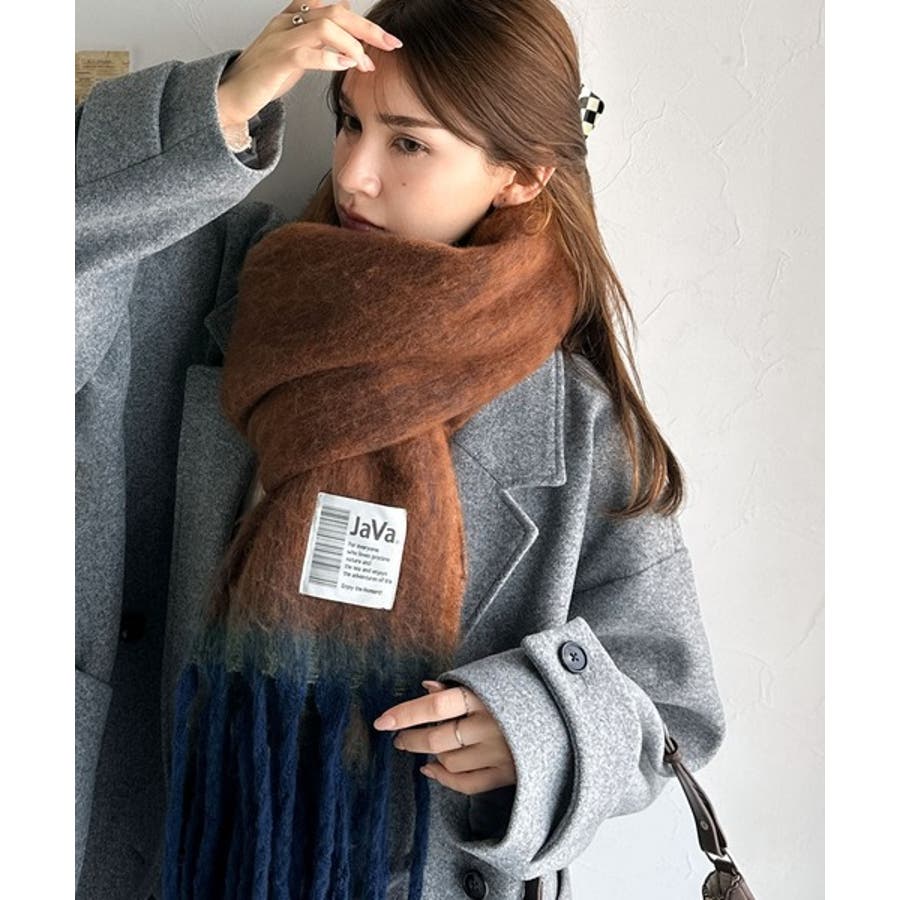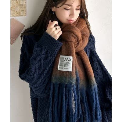 大人カラーと太めのフリンジ、JaVaのタグがポイントの大判ストールは、