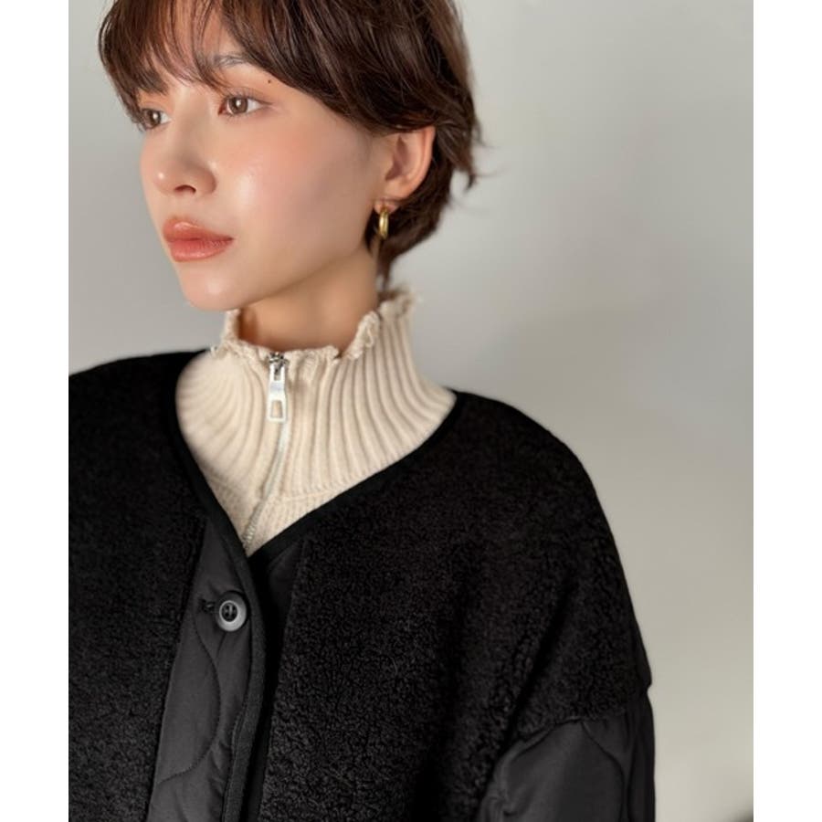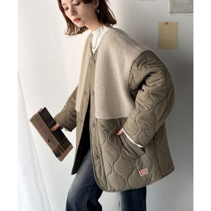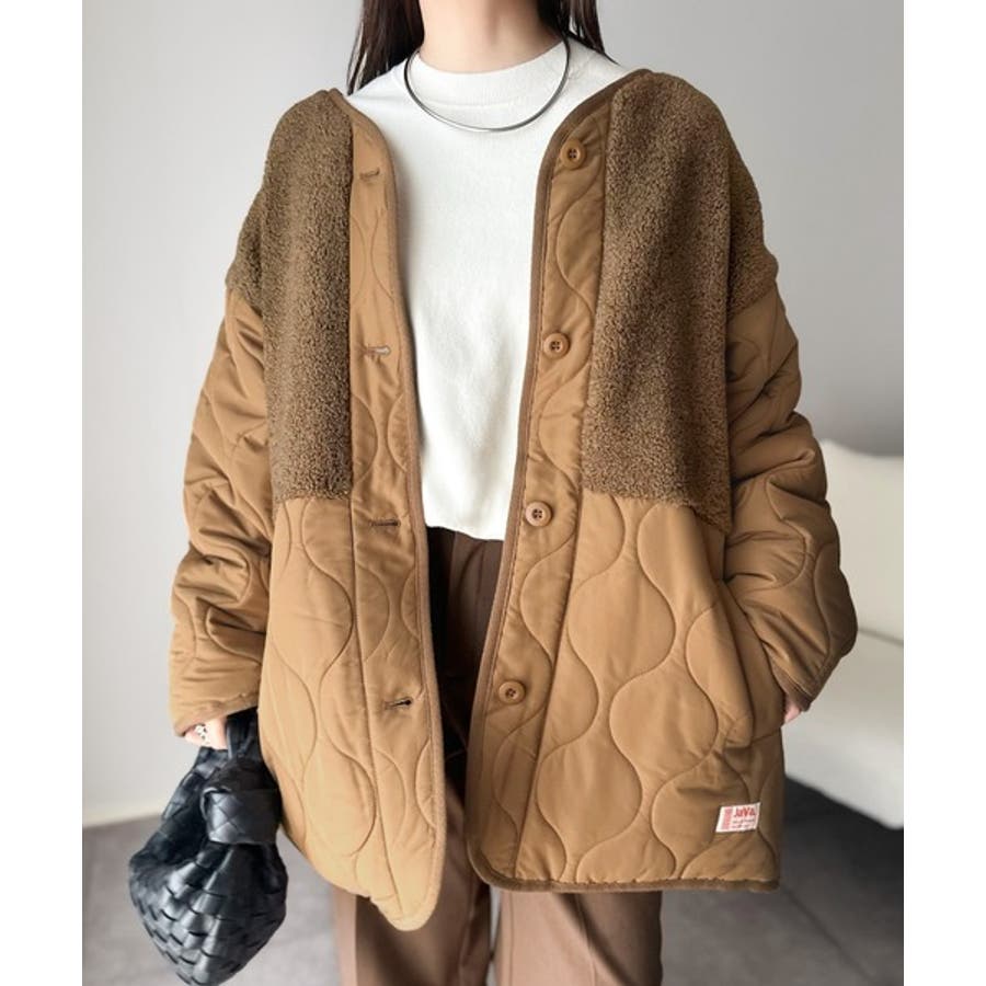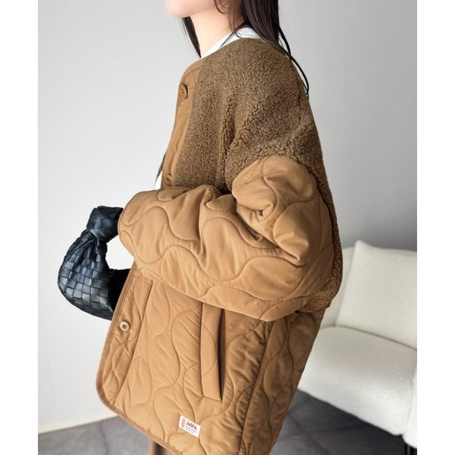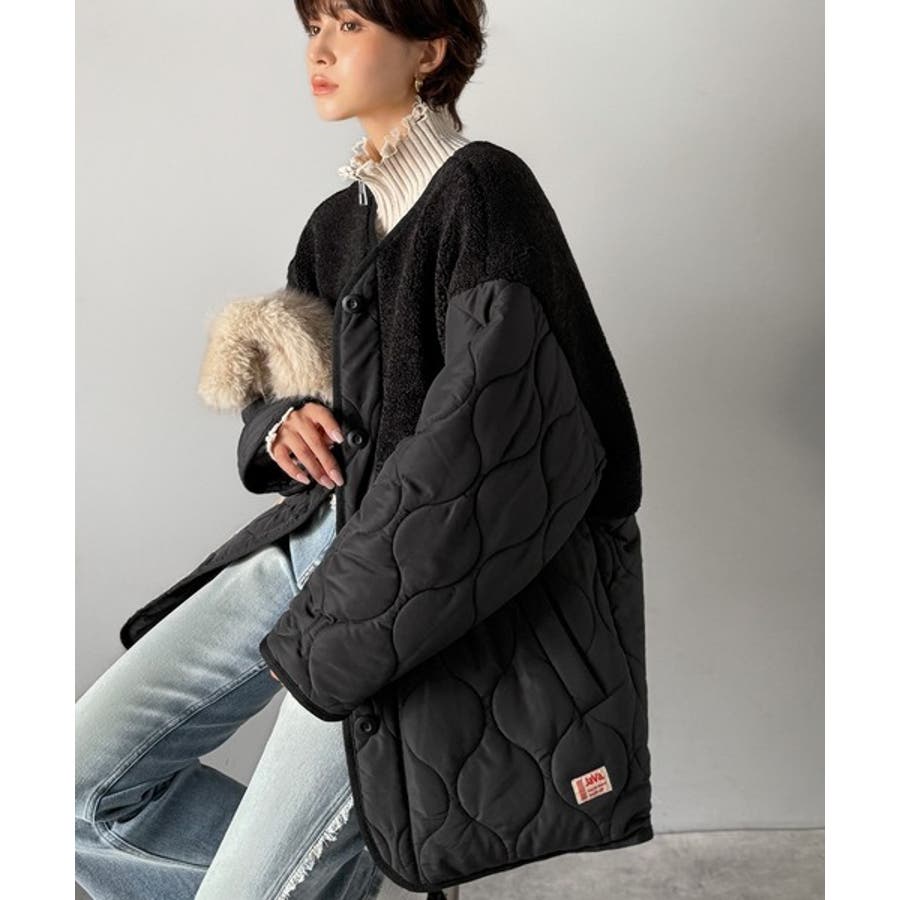 《JaVaジャバコラボ》軽くて暖かい、旬顔ボア切替♪ノーカラーひょうたんキルティ…
