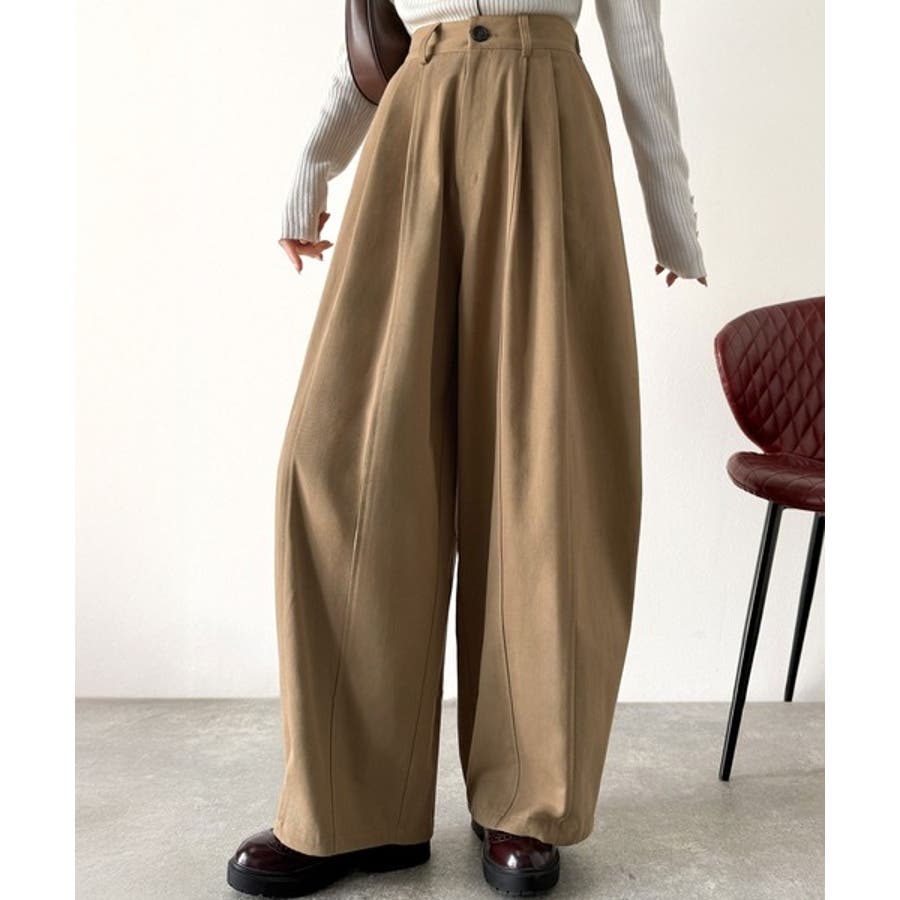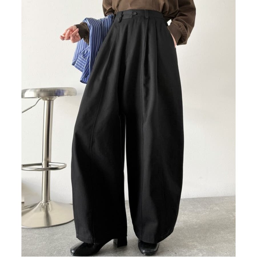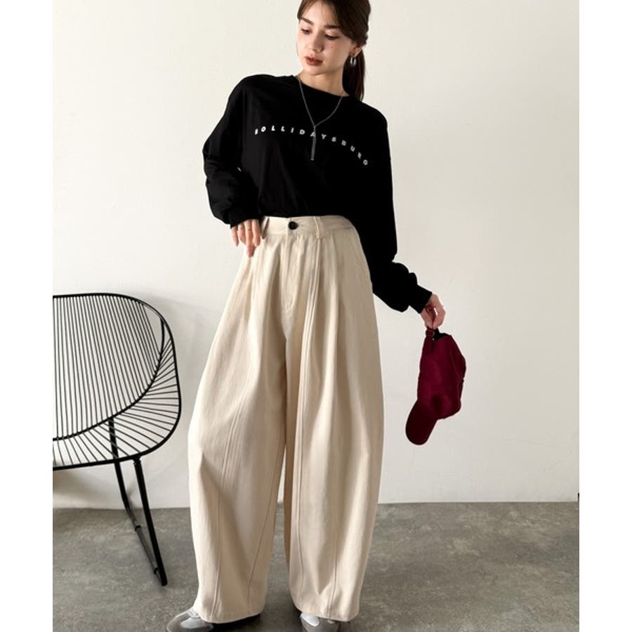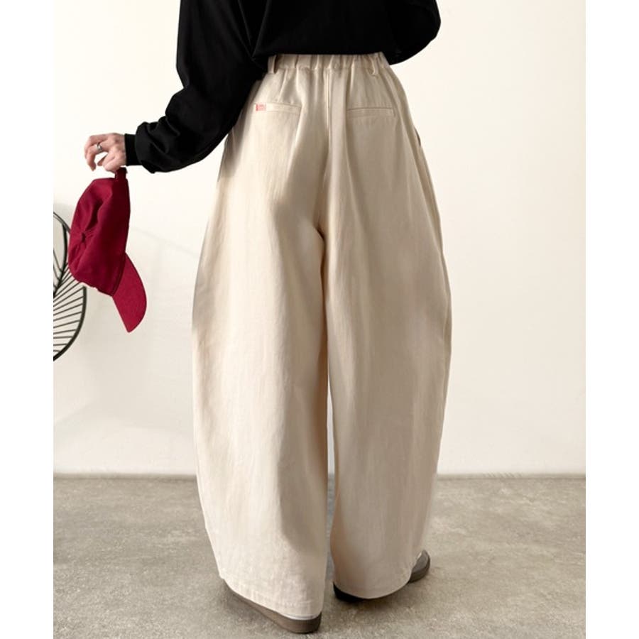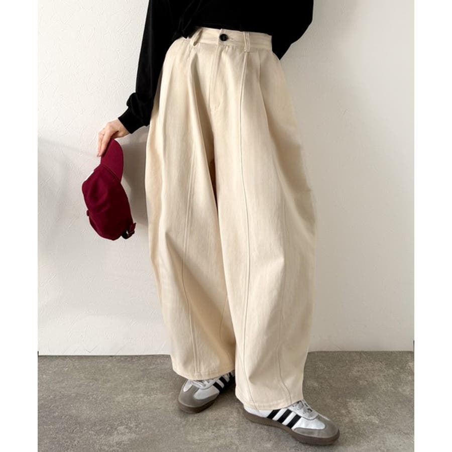 カーブで魅せる、抜け感シルエット。綿100%コットンツイルバレルレッグタックパン…