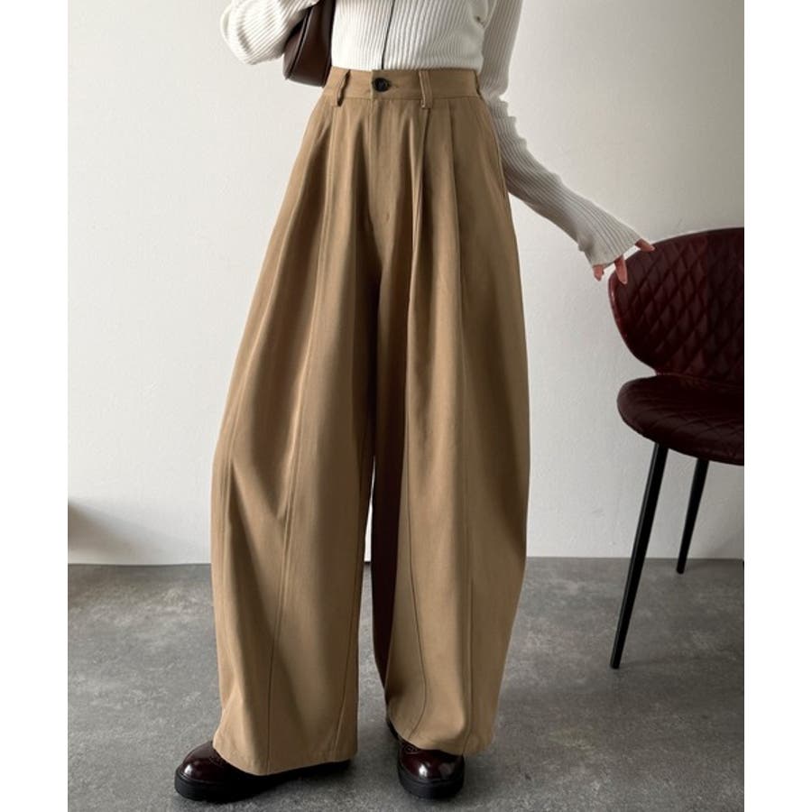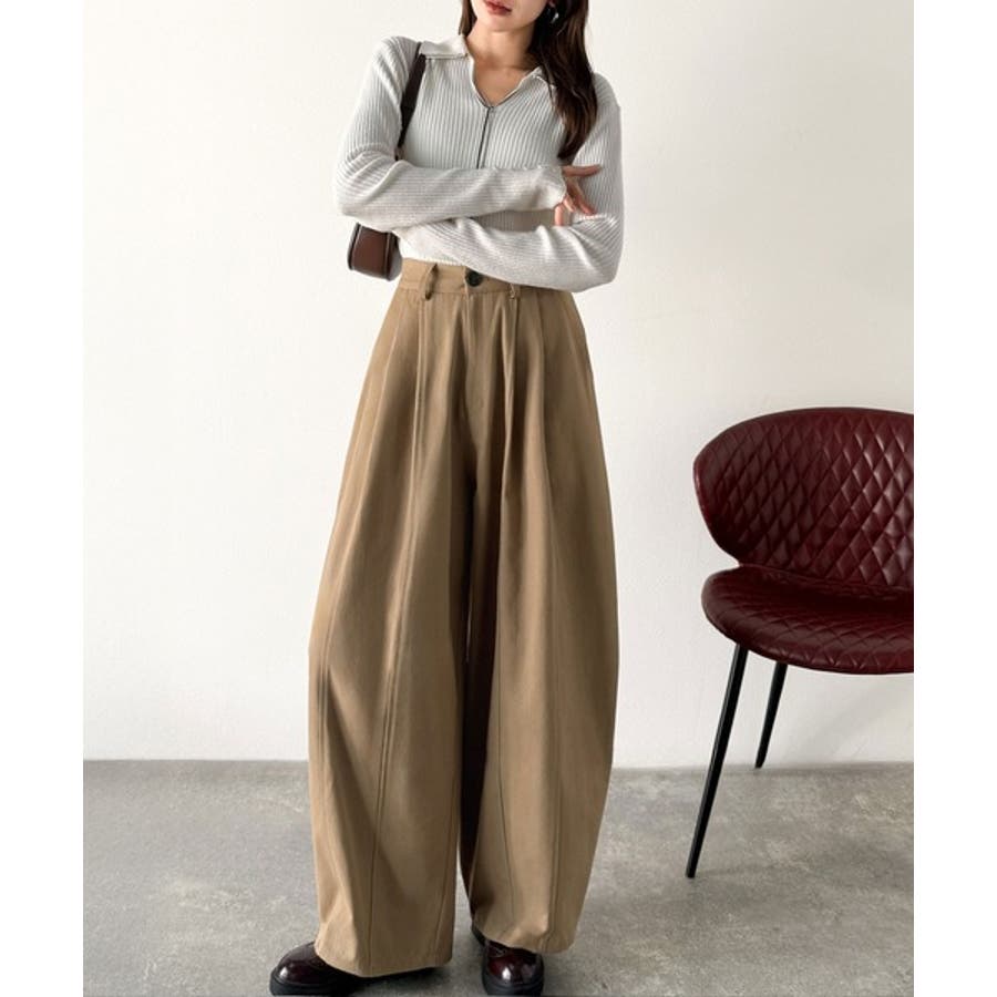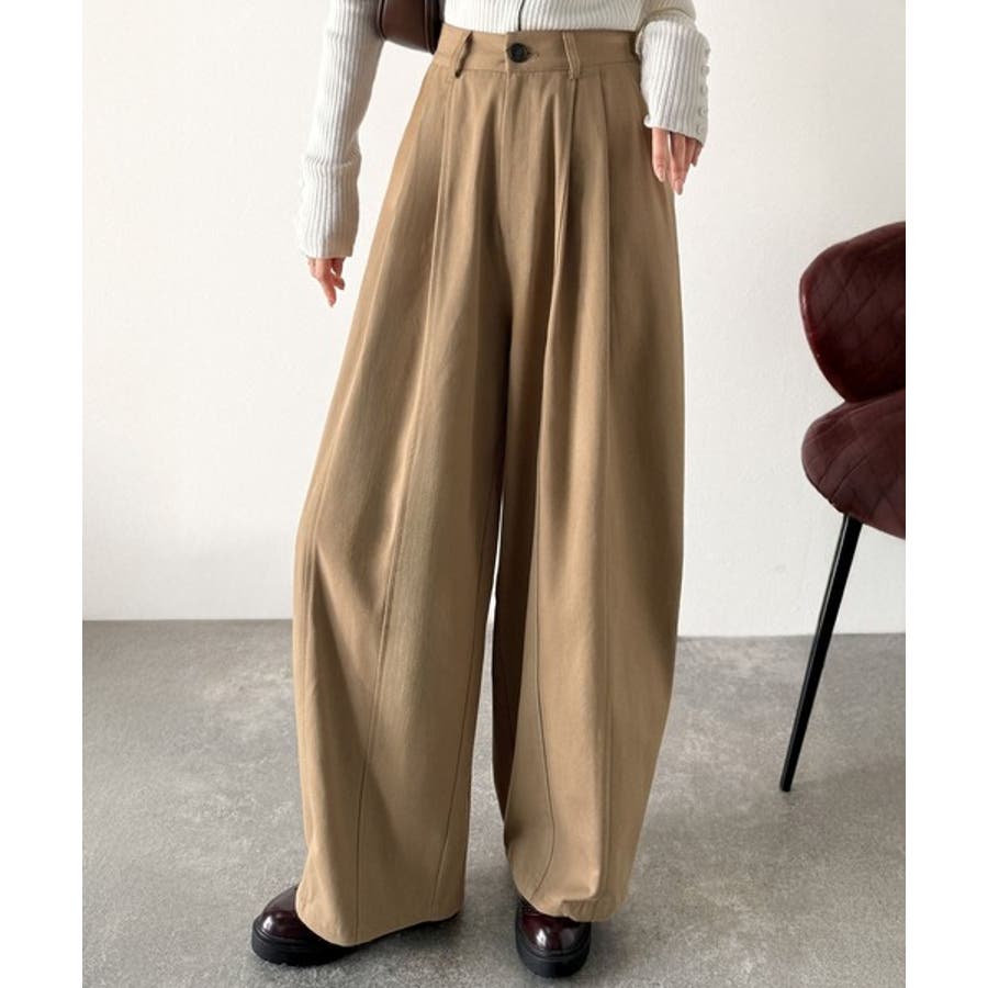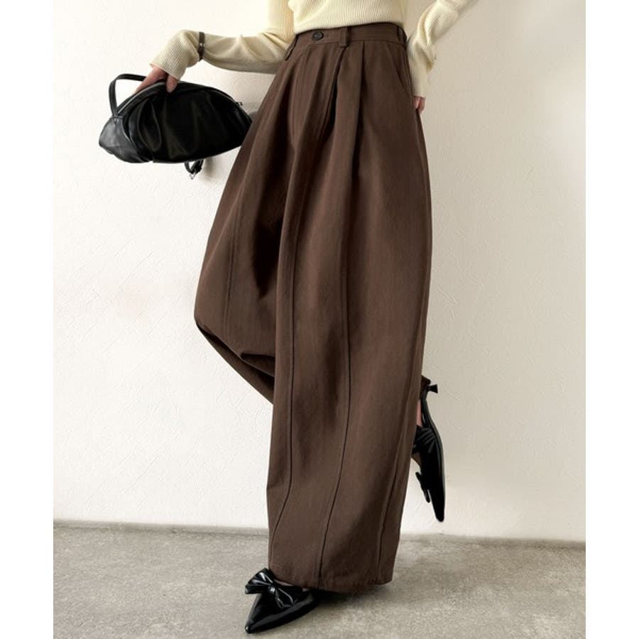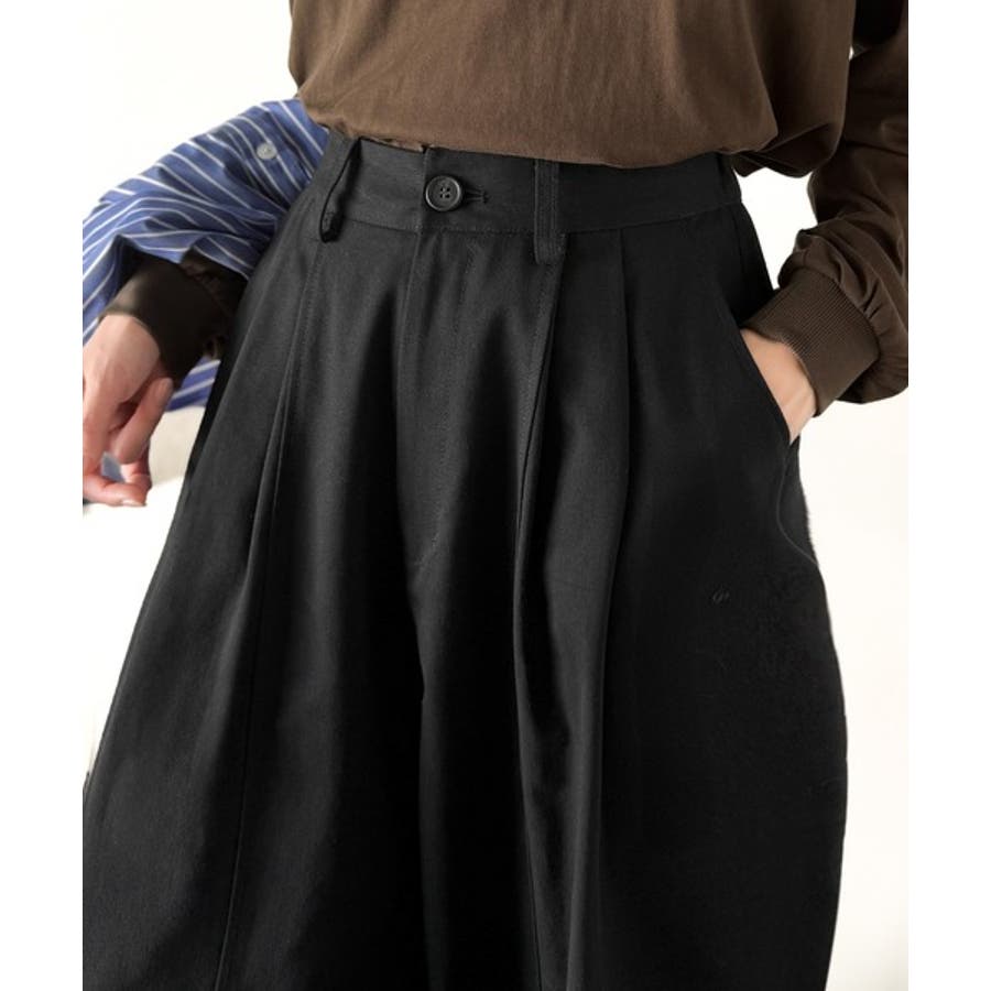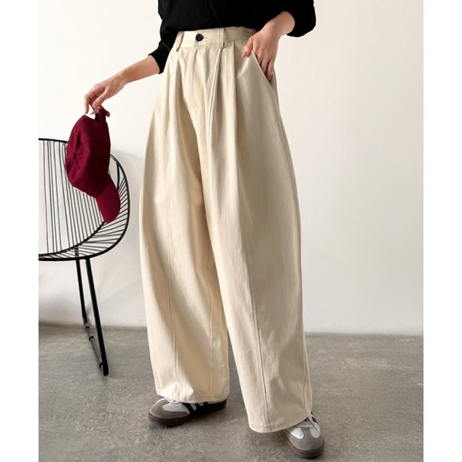 カーブで魅せる、抜け感シルエット。綿100%コットンツイルバレルレッグタックパン…