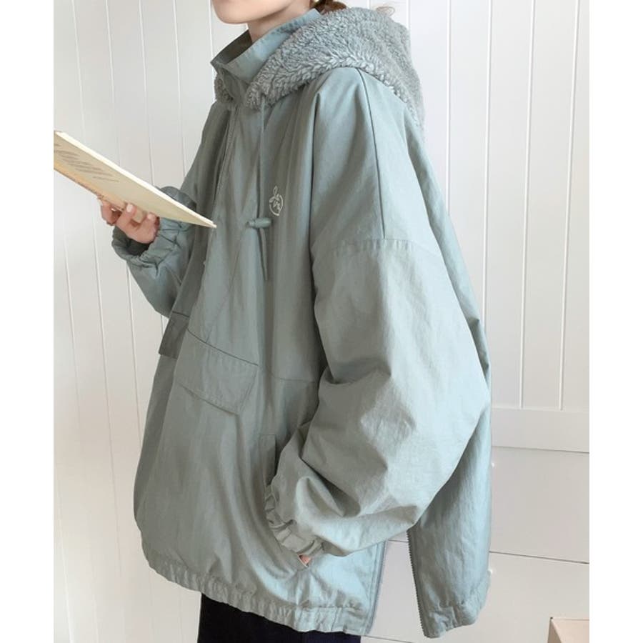 生地は シャリ感があります。身頃もゆったりしていて 袖もゆったりで 着やすいです。フードだけ ボア素材なところがアクセントになっています。寒い日は ジッパーを閉めれば防寒対策は完璧です。