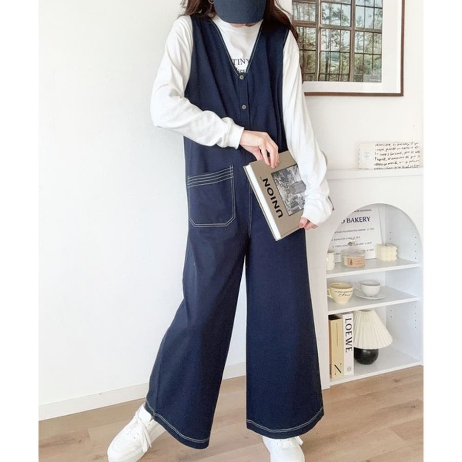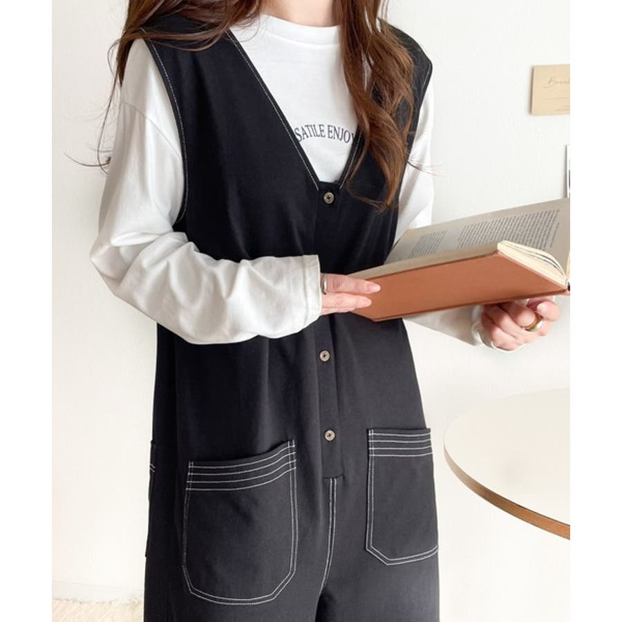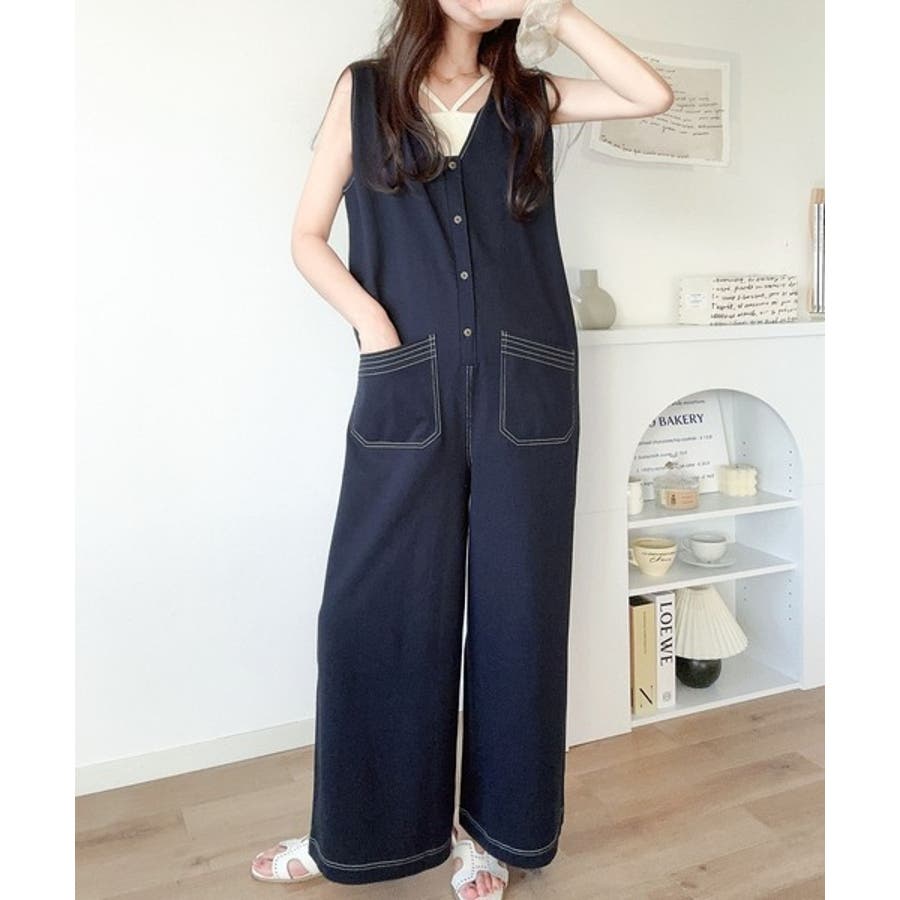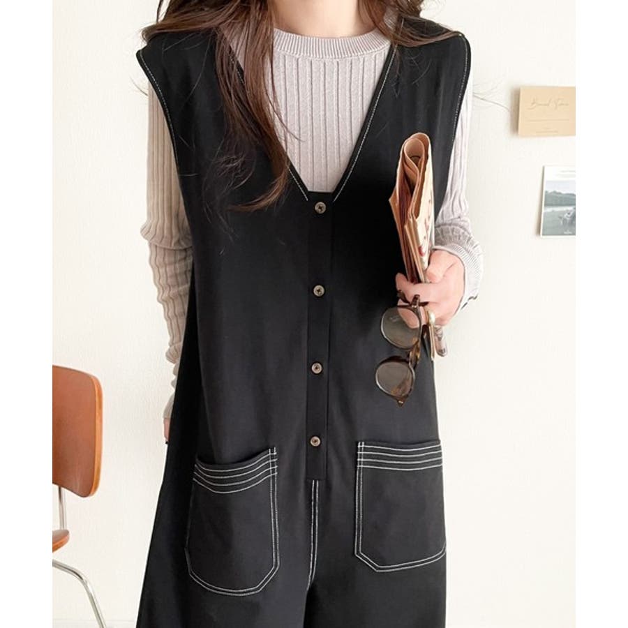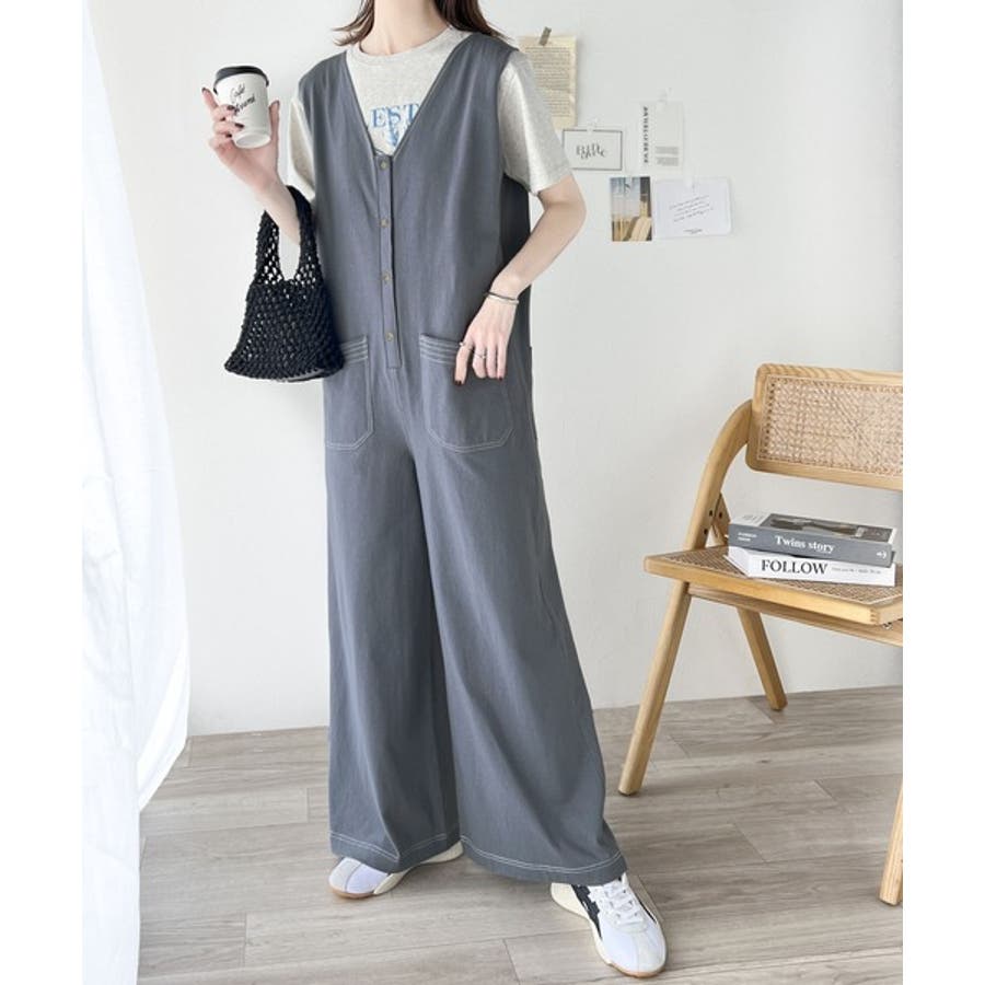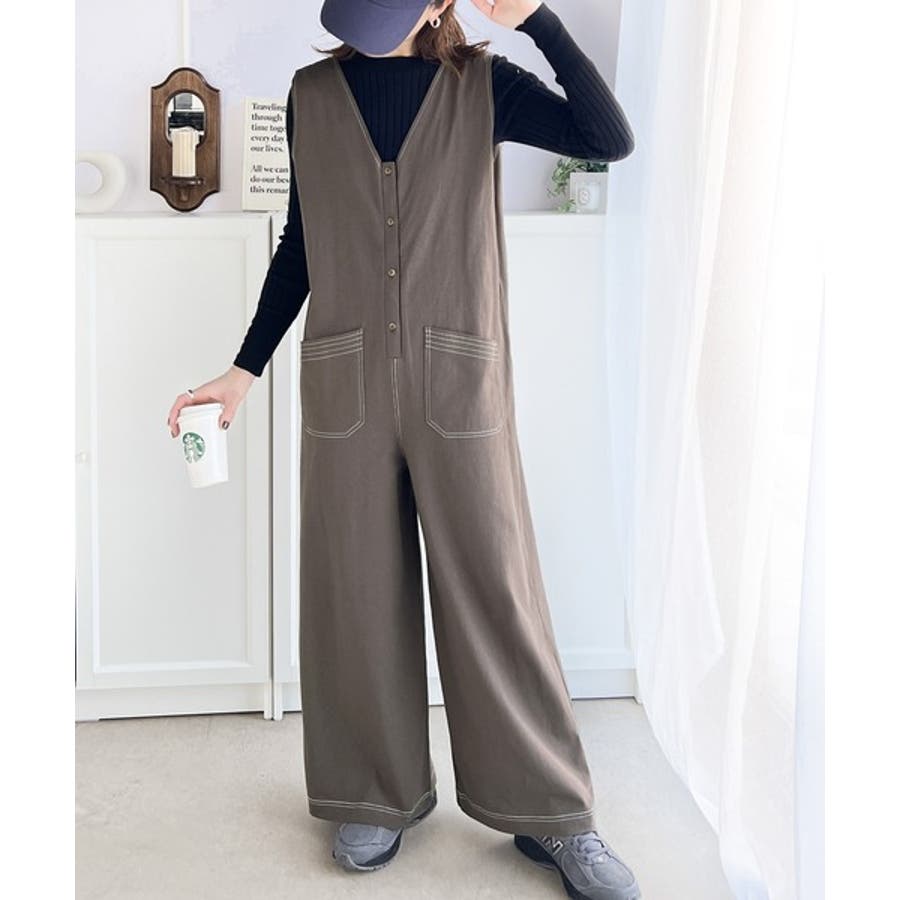 一枚で上級カジュアルstyle。綿100%配色ステッチオールインワン