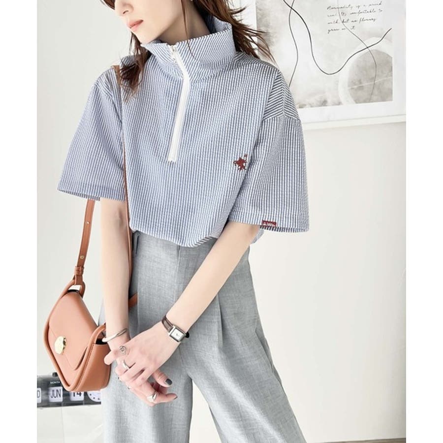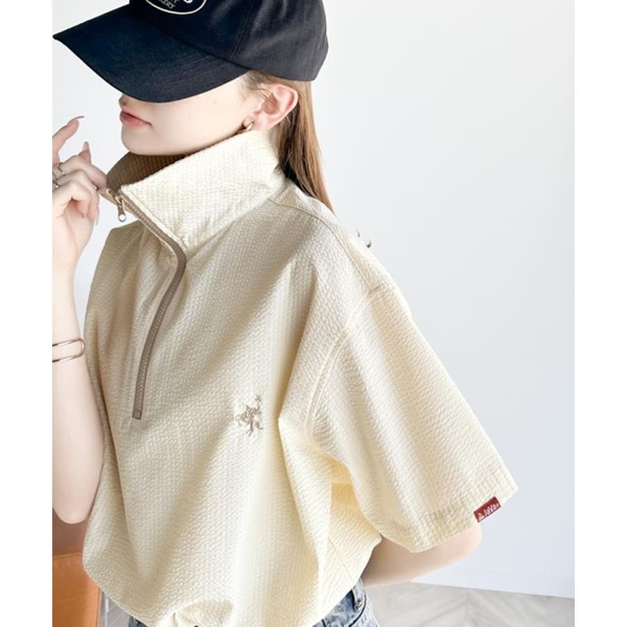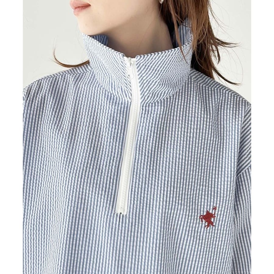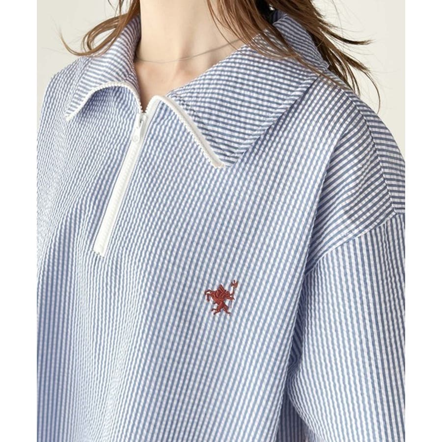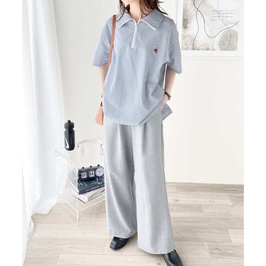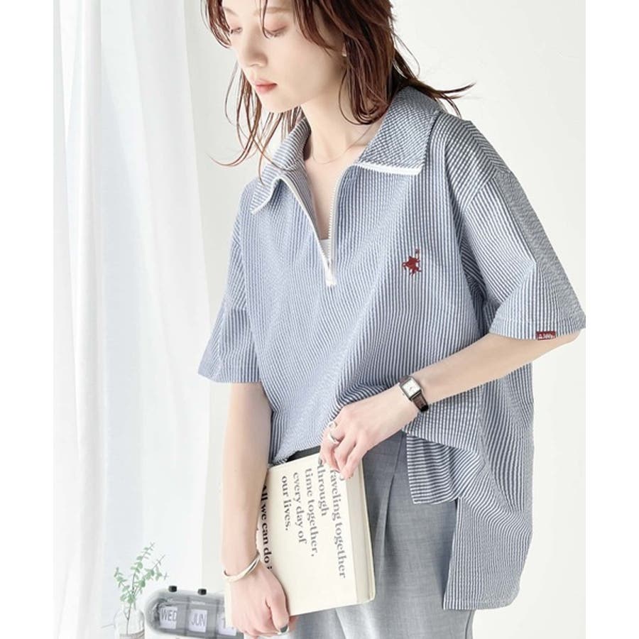 一点投入で好印象コーデ。胸刺繍サッカー素材ハーフジッププルオーバー