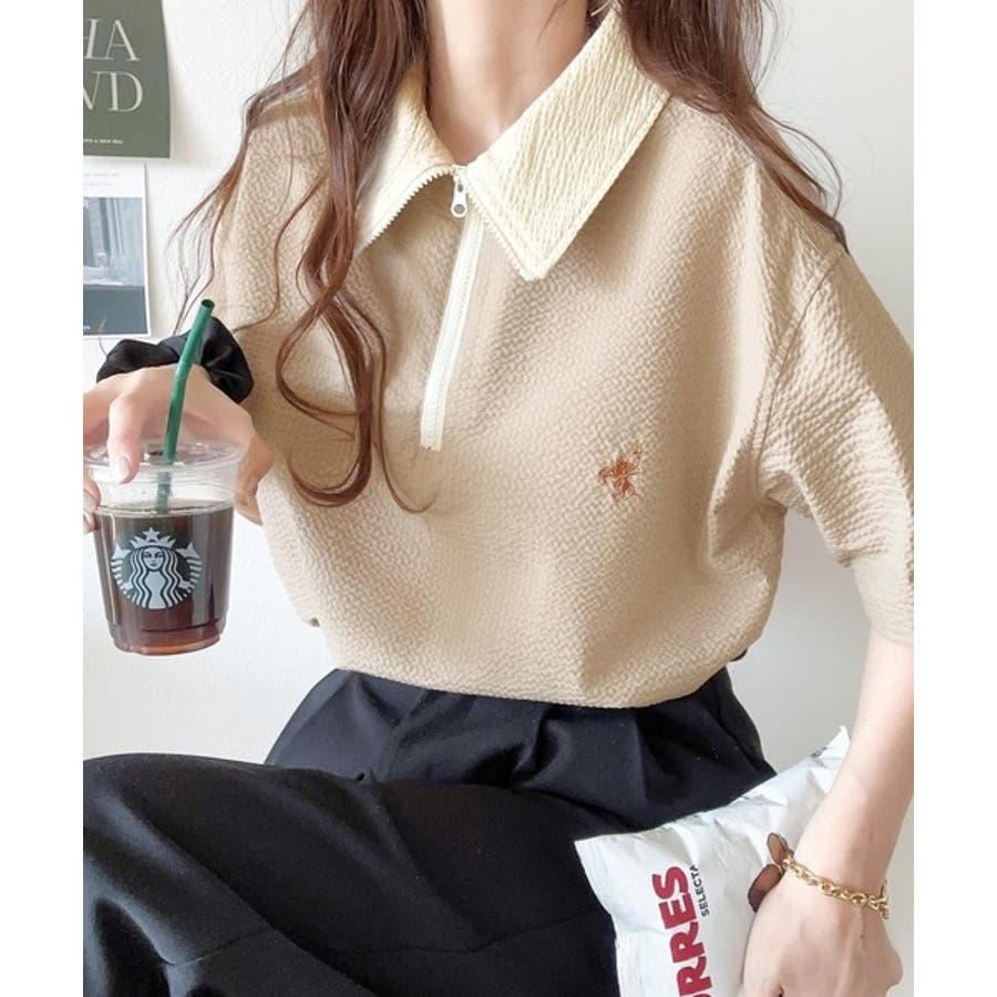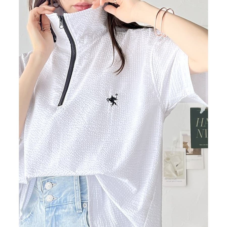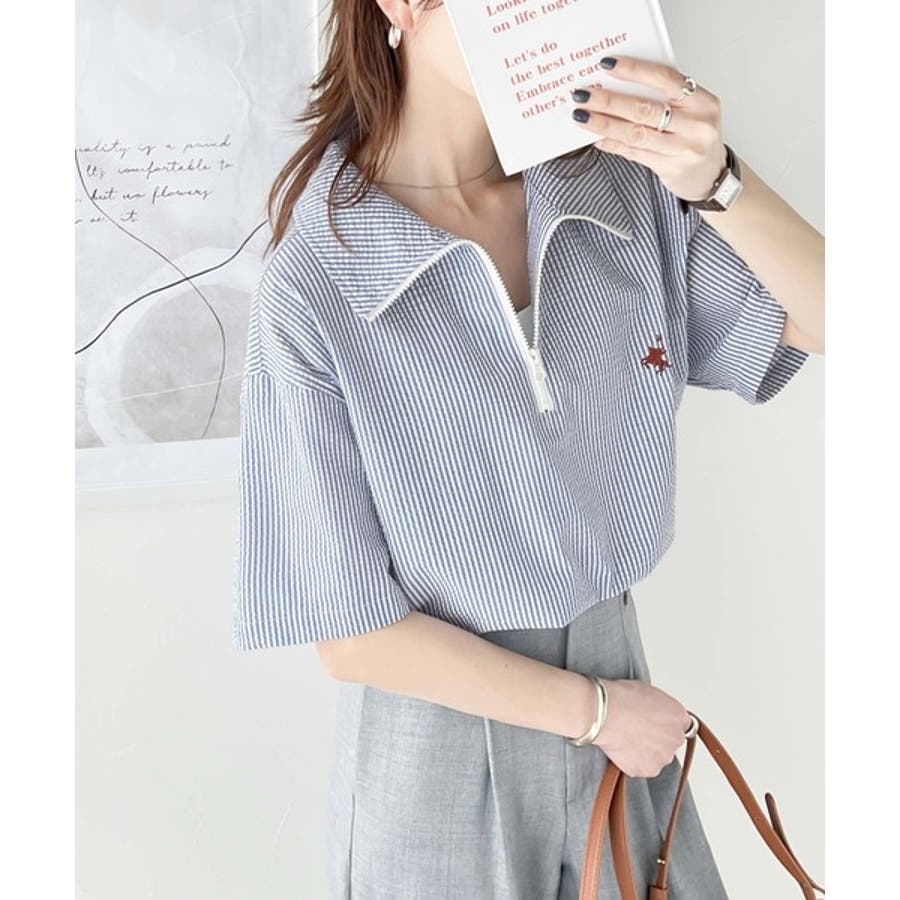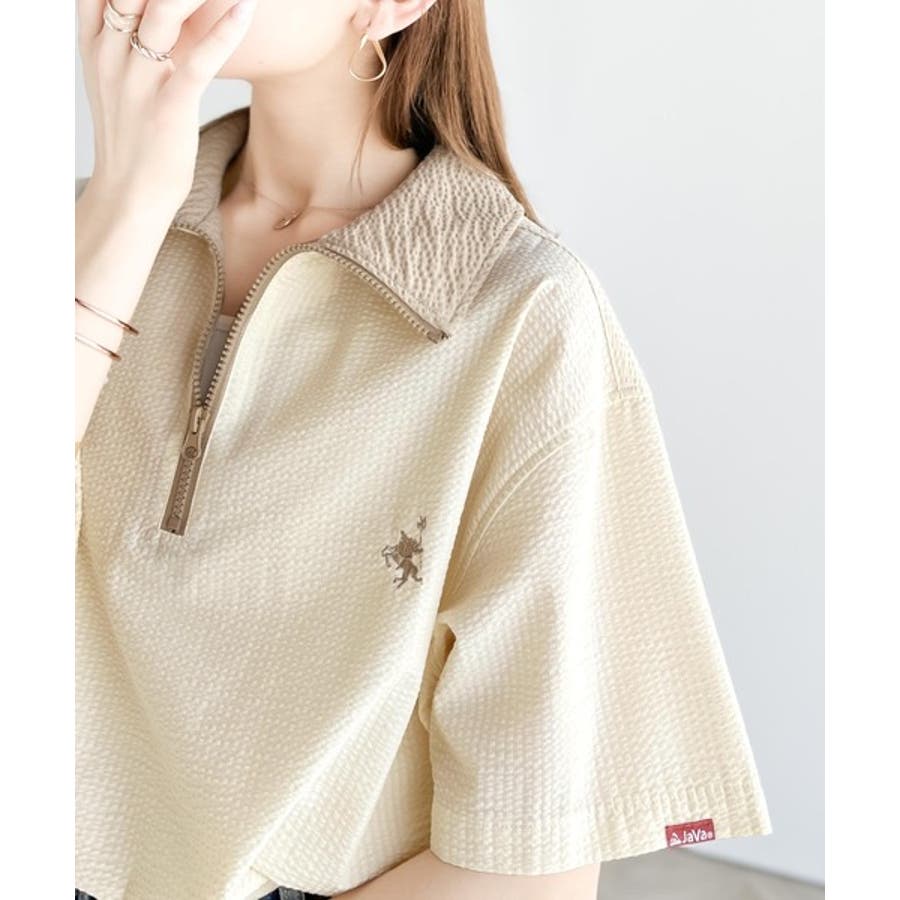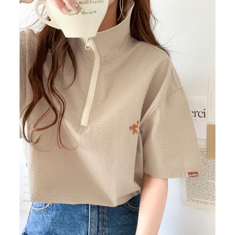 一点投入で好印象コーデ。胸刺繍サッカー素材ハーフジッププルオーバー
