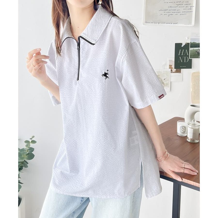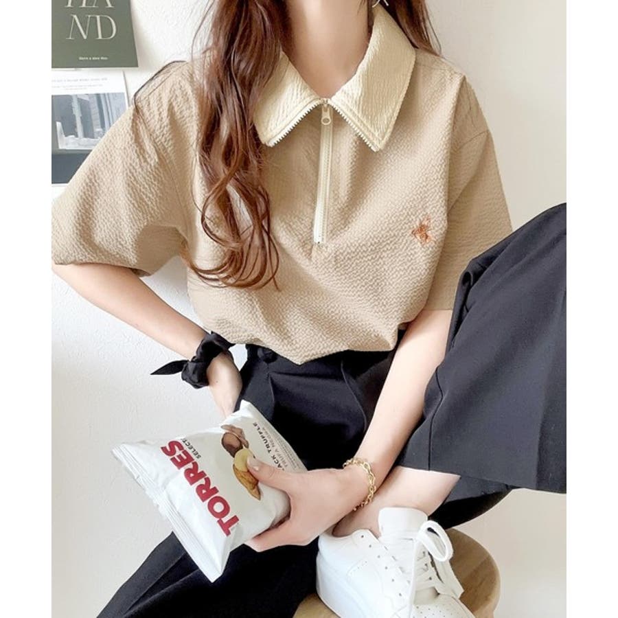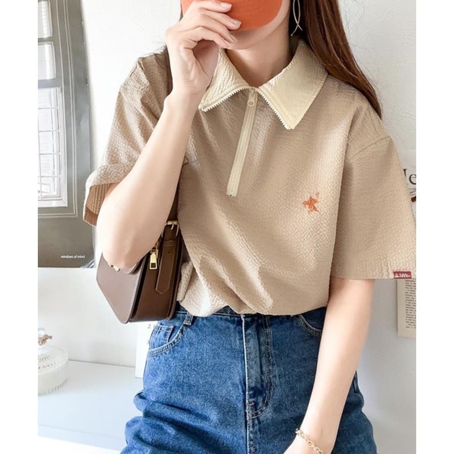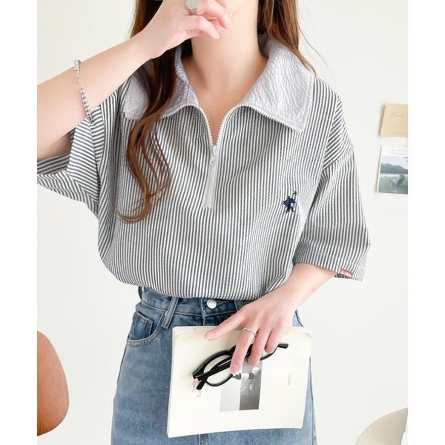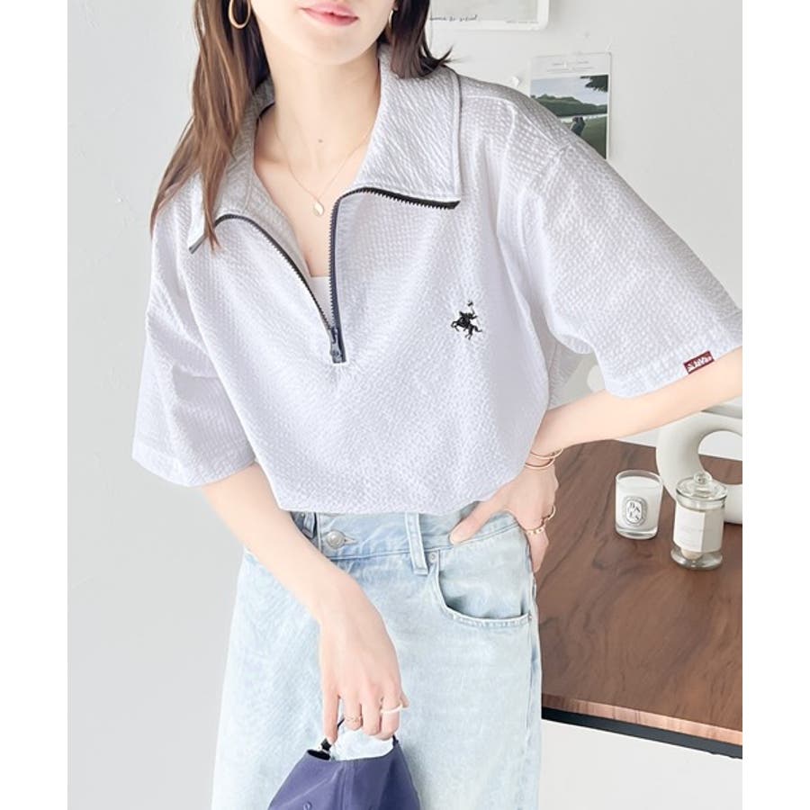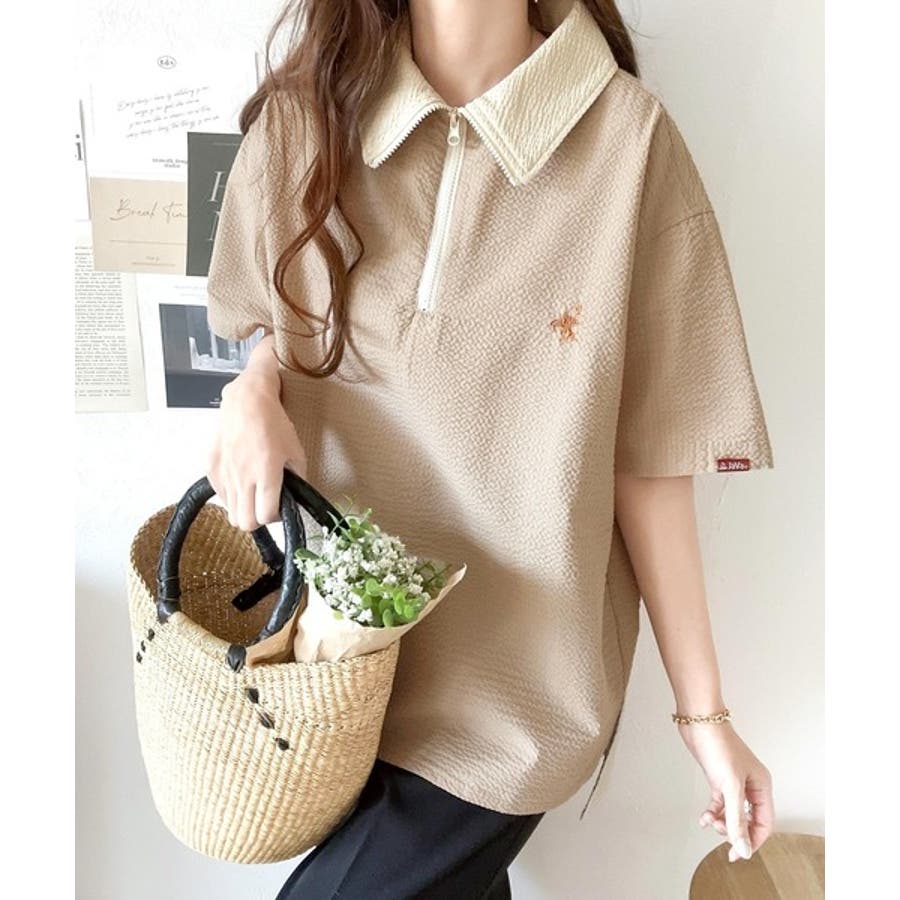 一点投入で好印象コーデ。胸刺繍サッカー素材ハーフジッププルオーバー