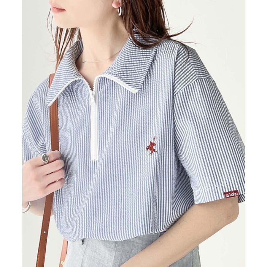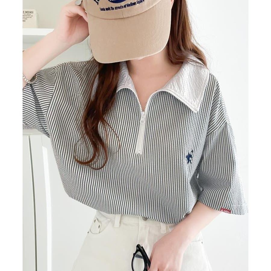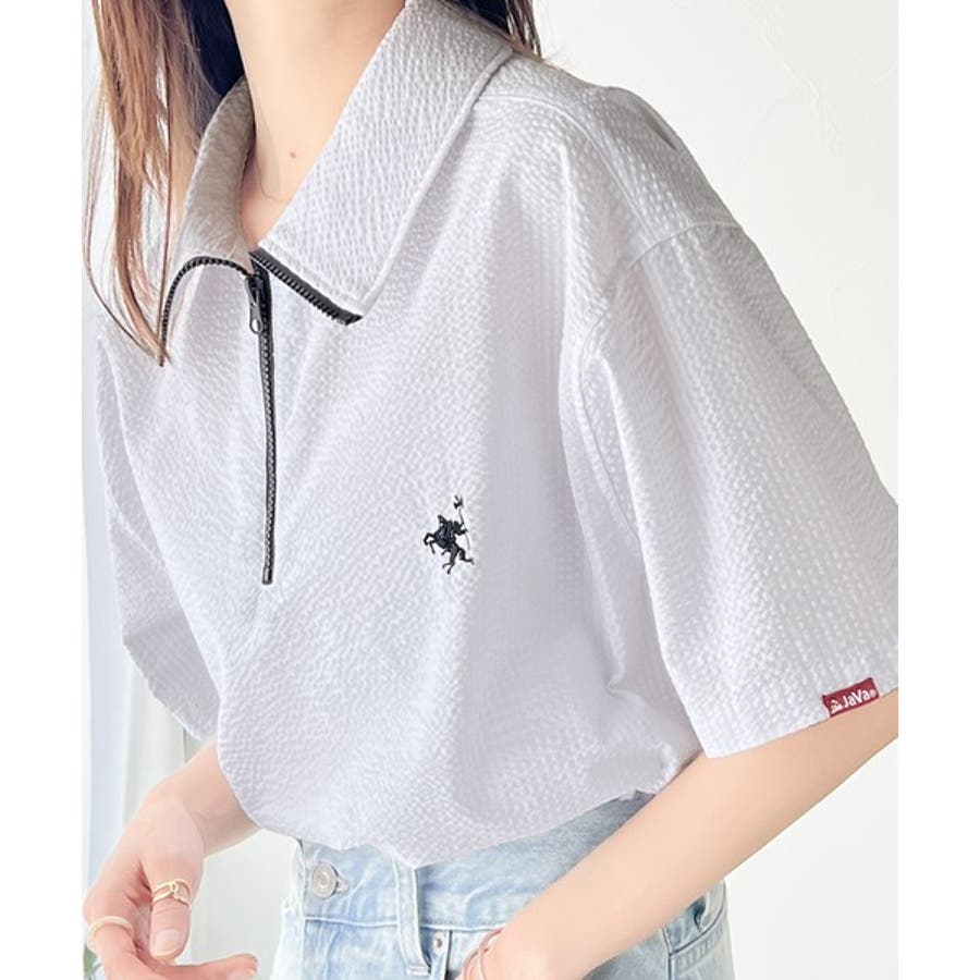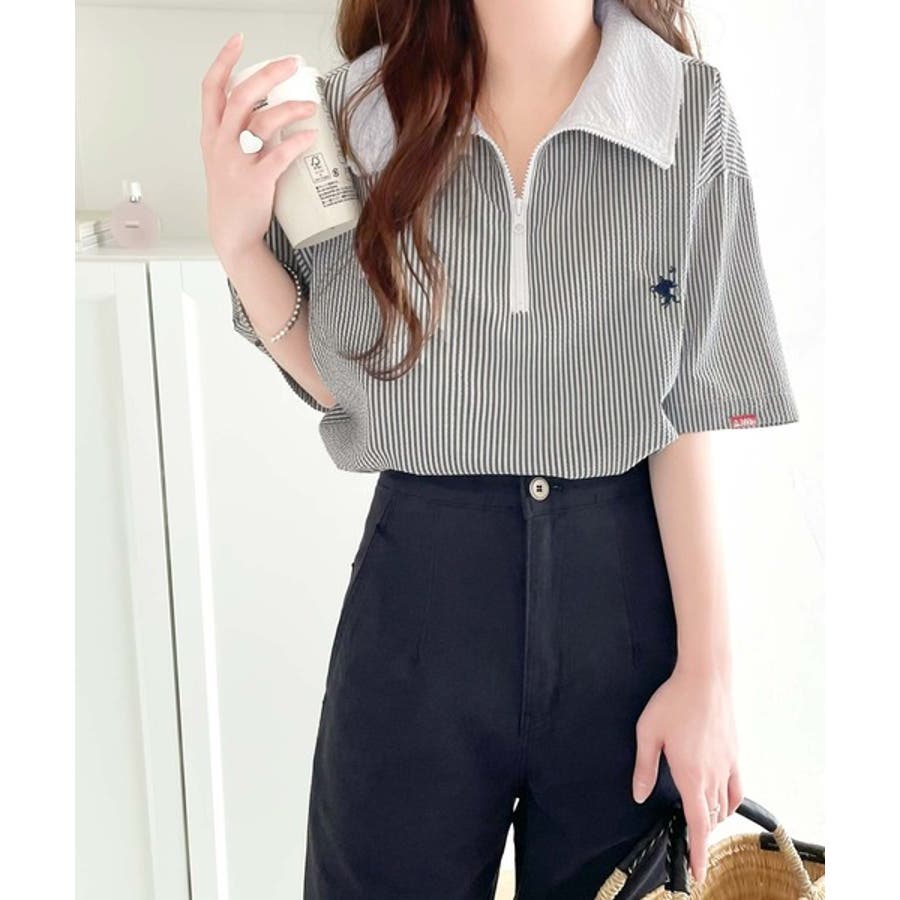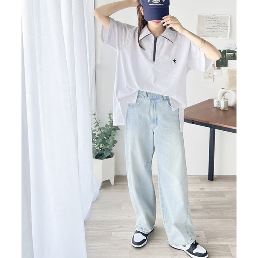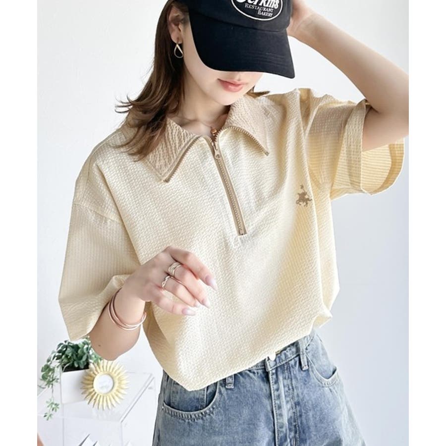 一点投入で好印象コーデ。胸刺繍サッカー素材ハーフジッププルオーバー
