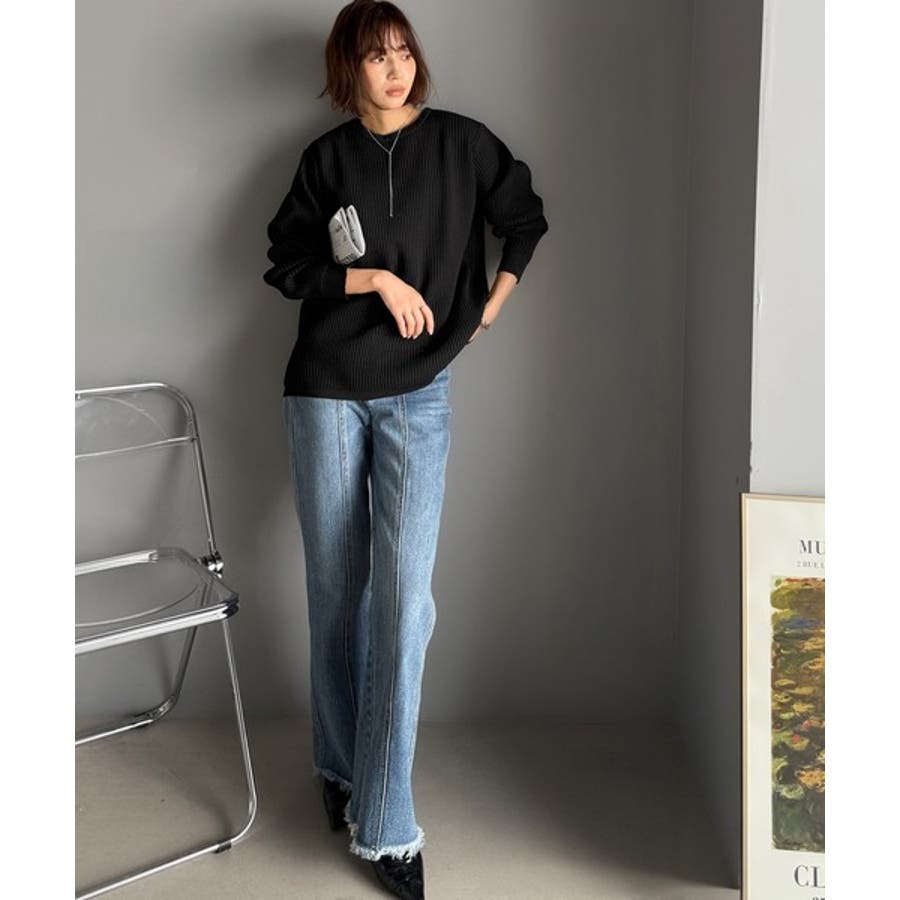 パンツにもスカートにも合わせやすい絶妙な丈感で、インでもアウトでも着こなしが決まる優秀ニット。