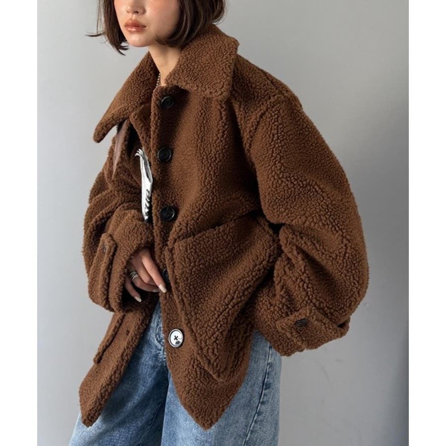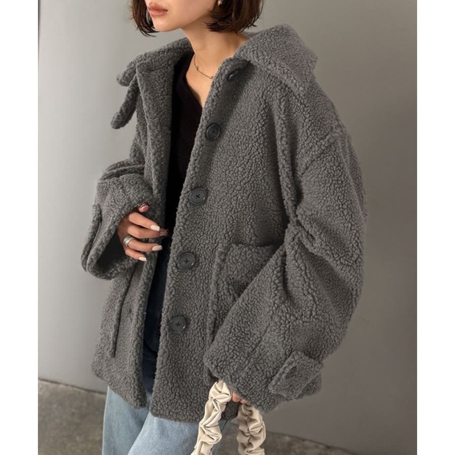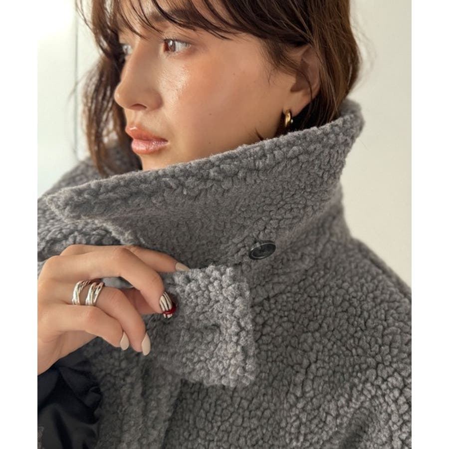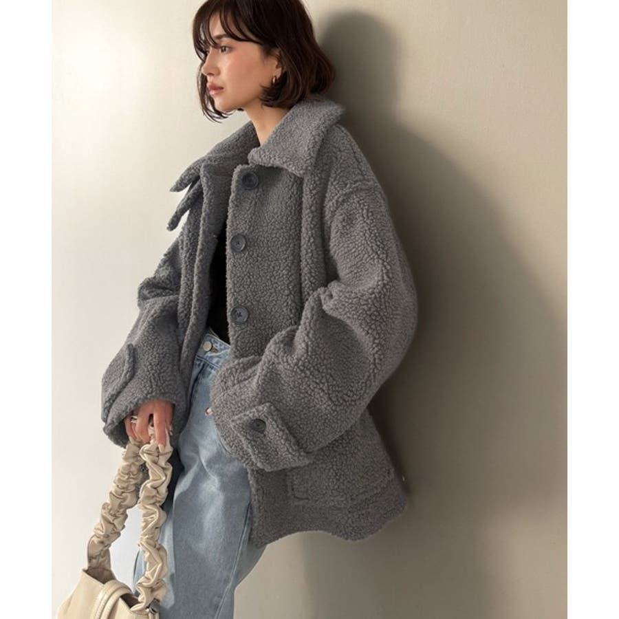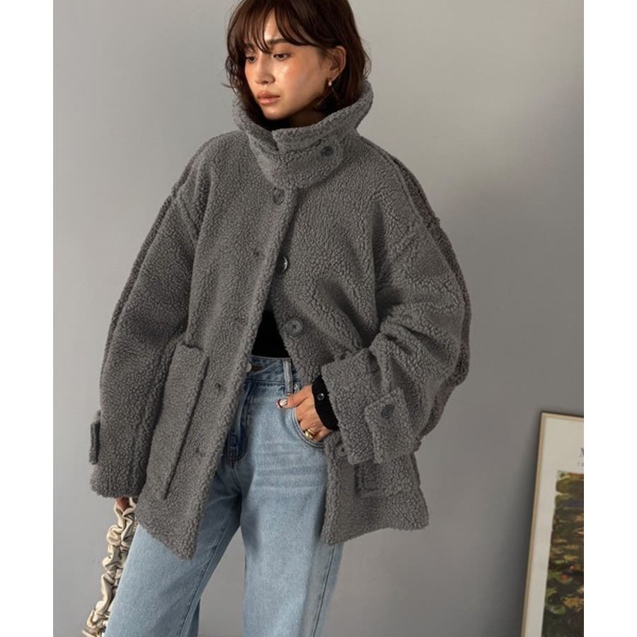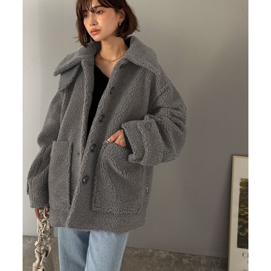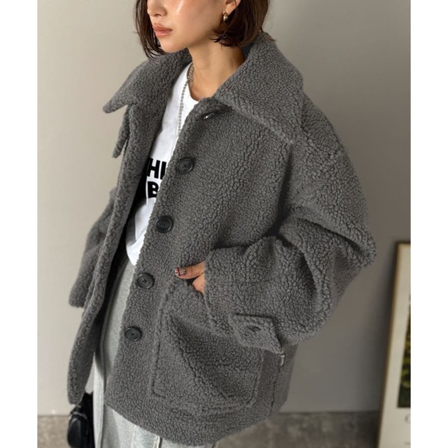 厚手の大粒ボアを使用した、大きめポケットつきショートブルゾン。
