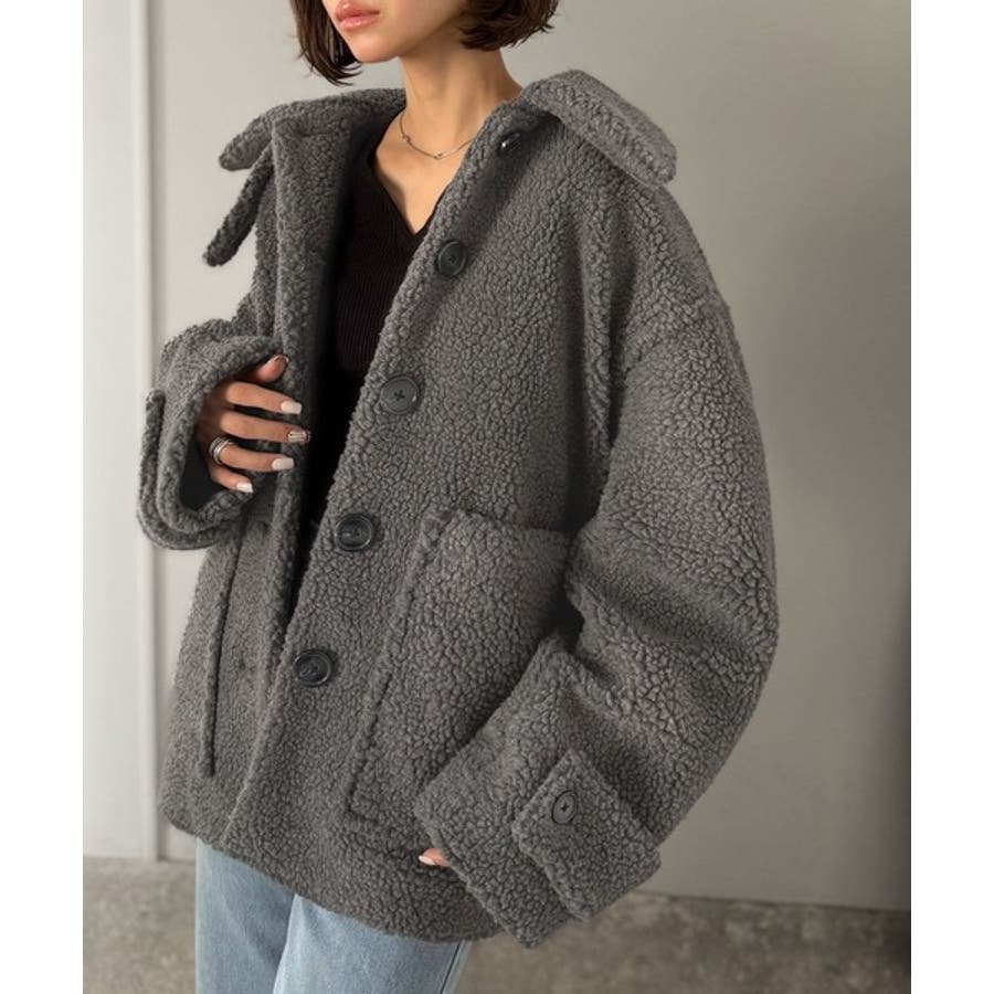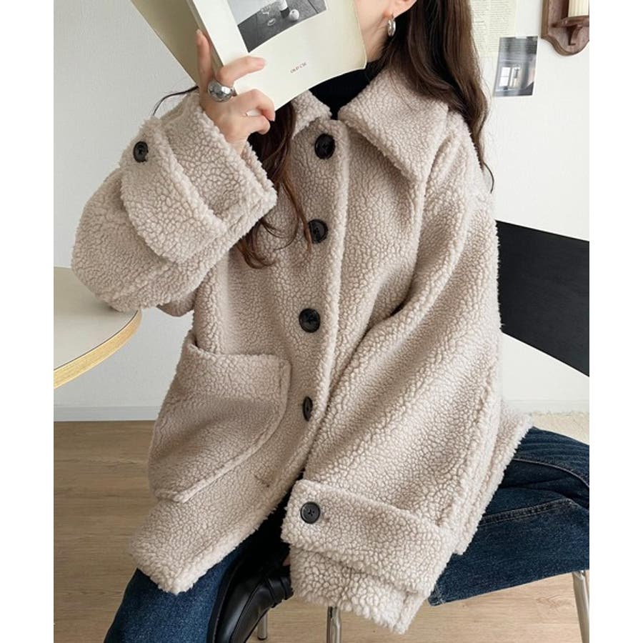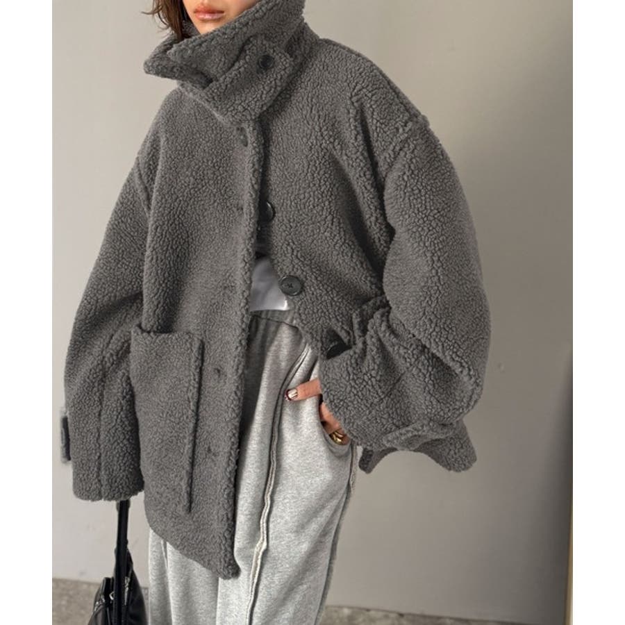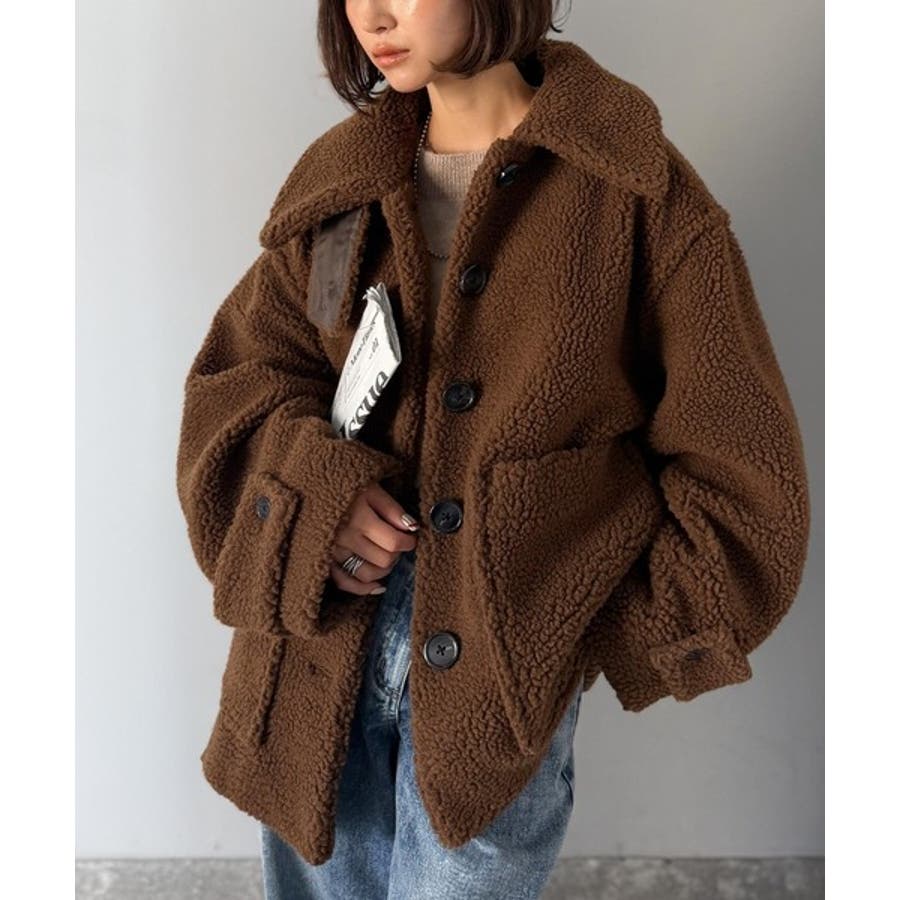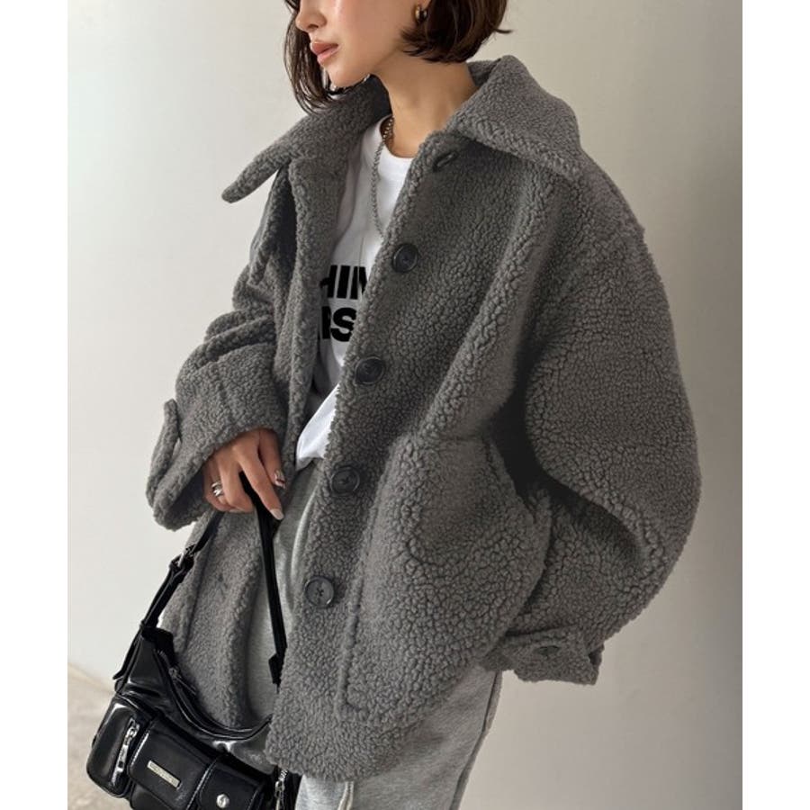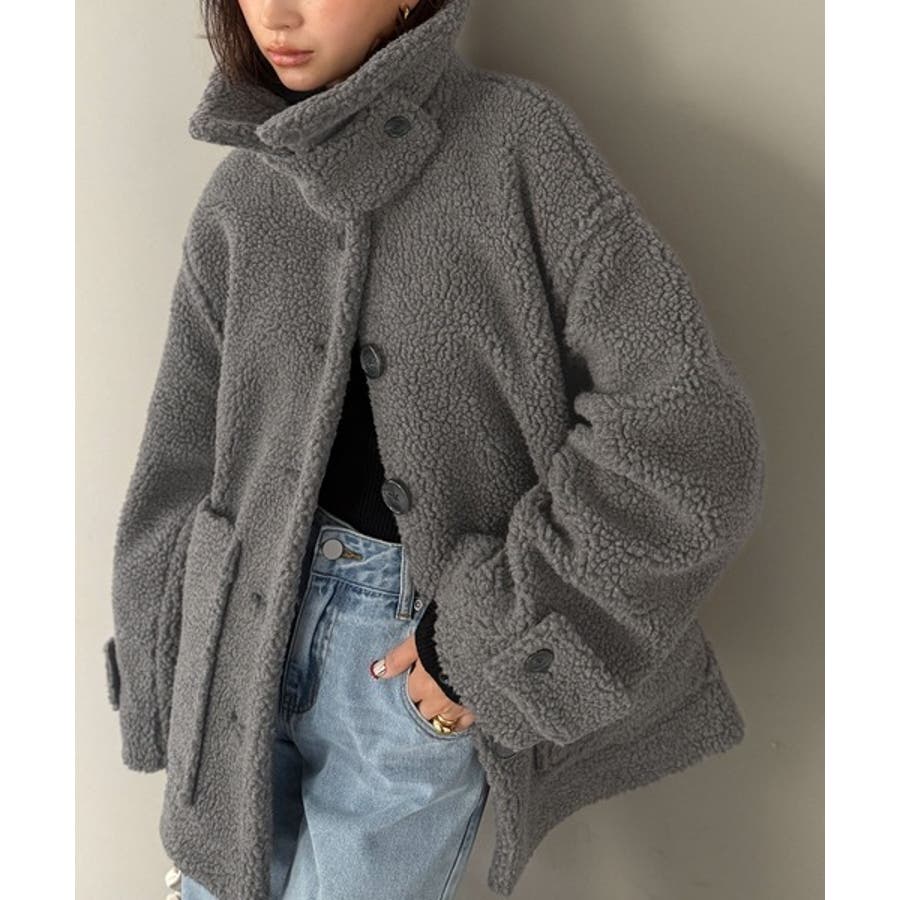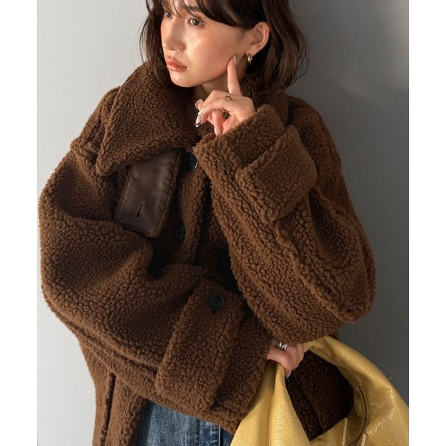 厚手の大粒ボアを使用した、大きめポケットつきショートブルゾン。