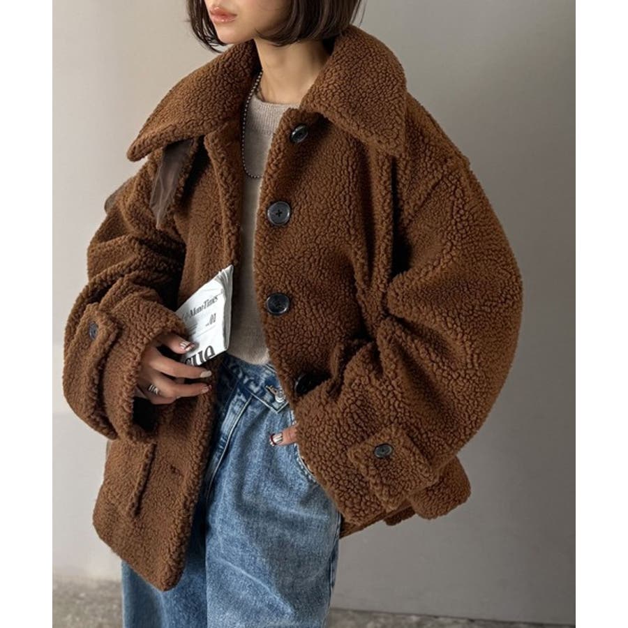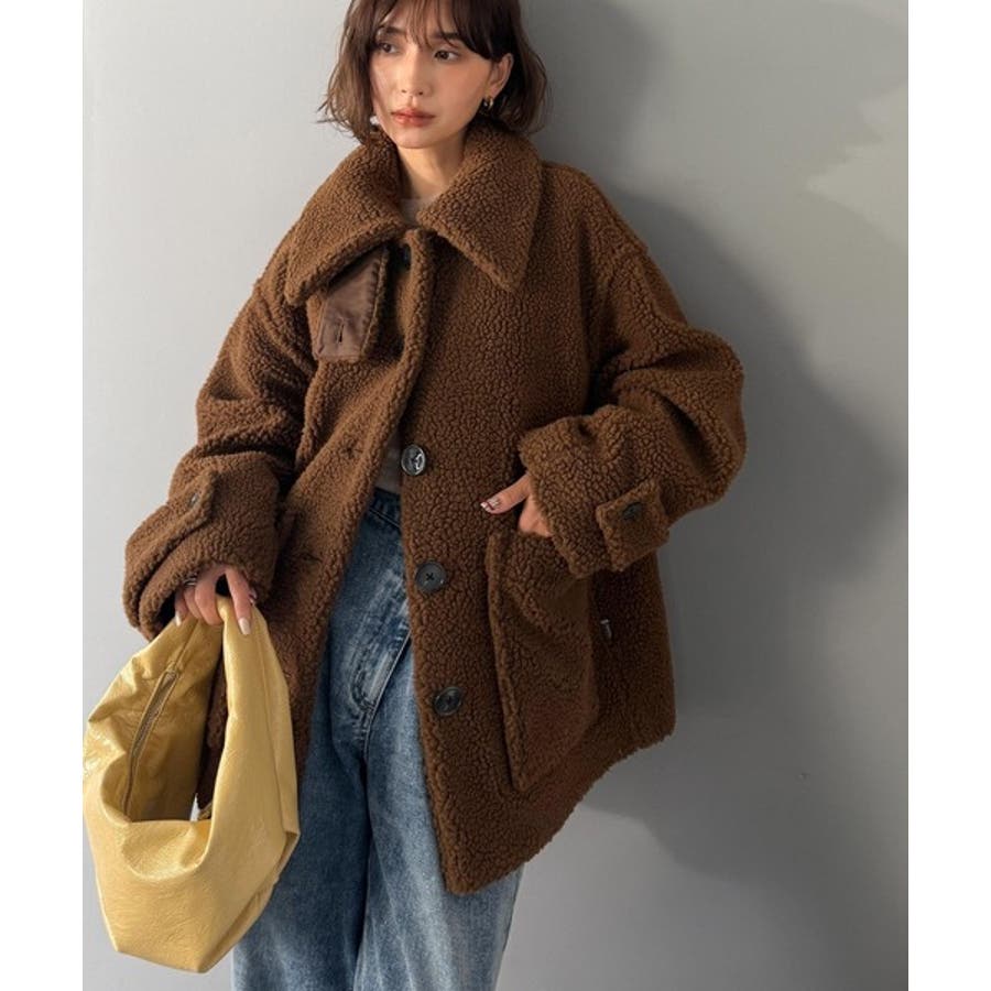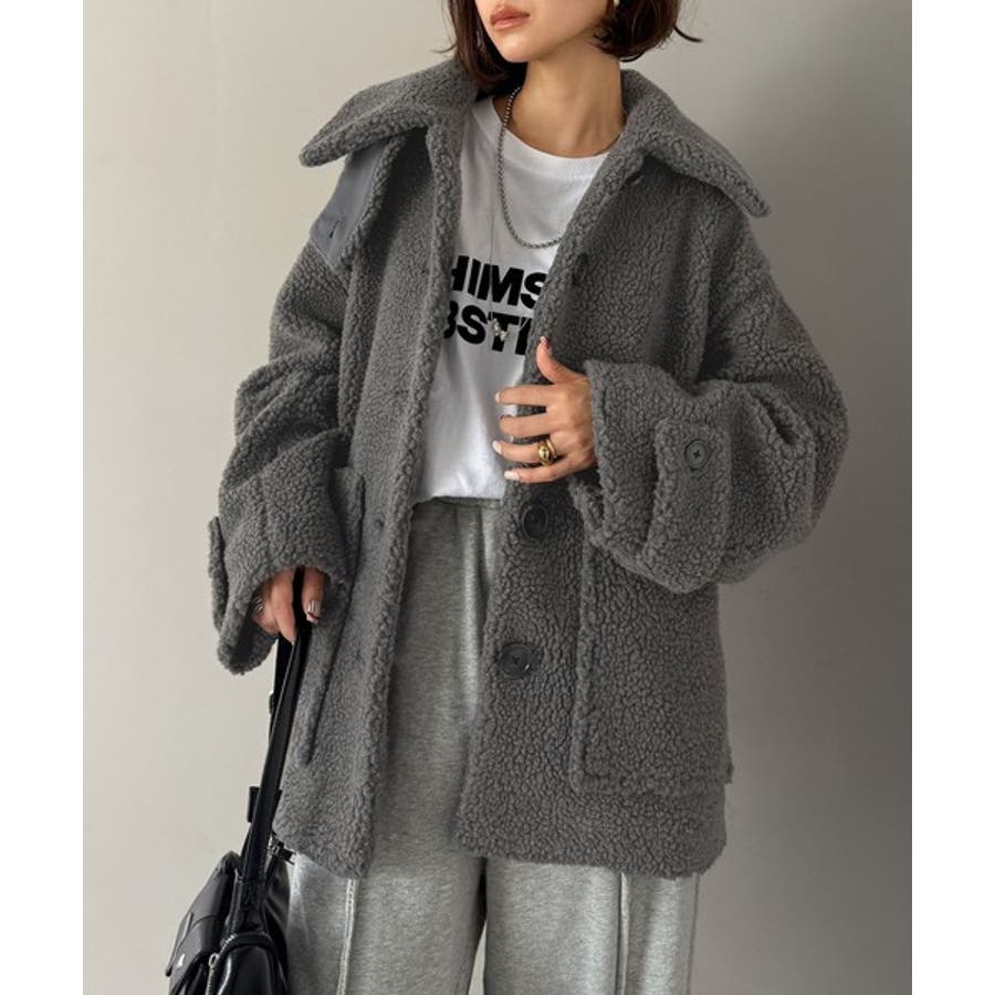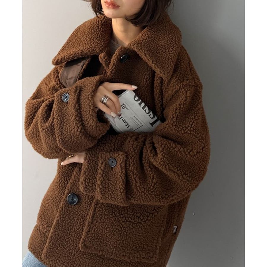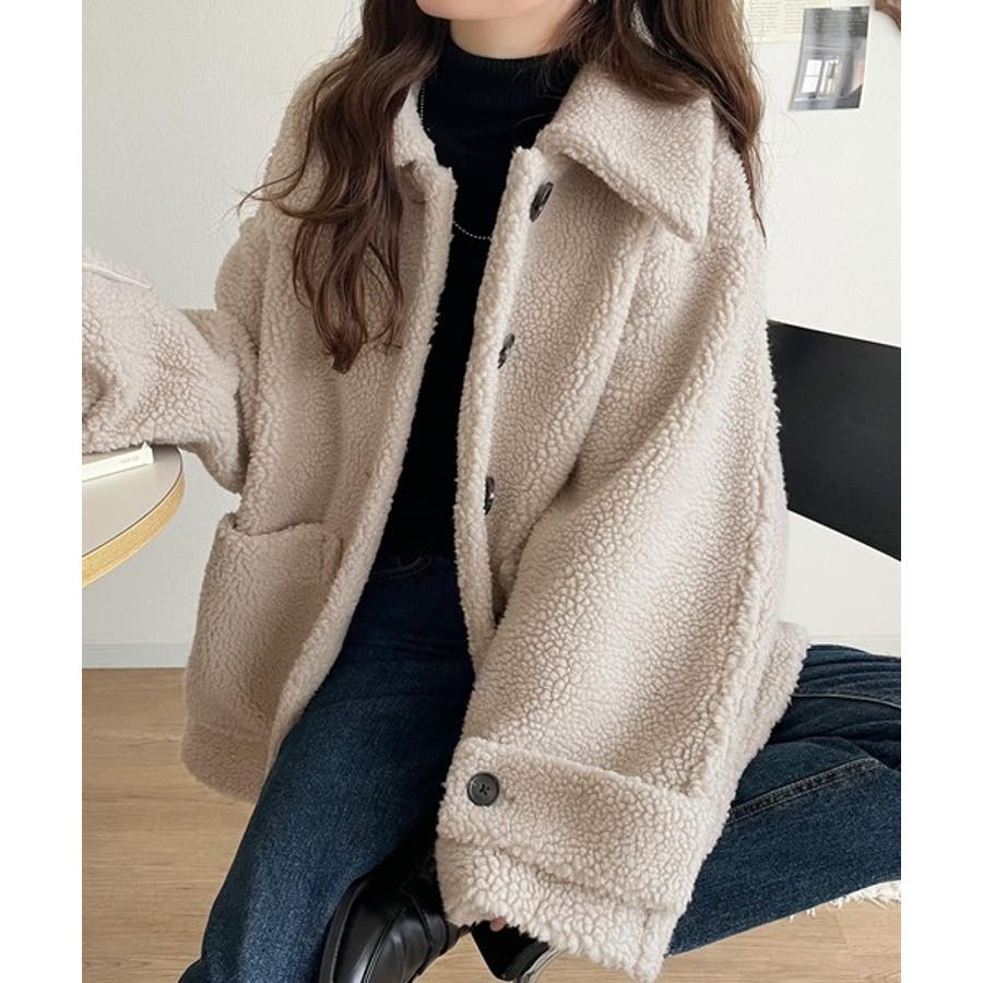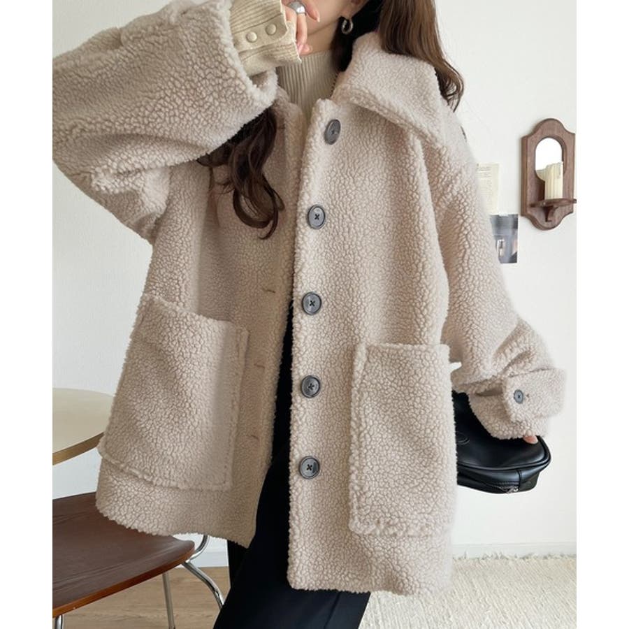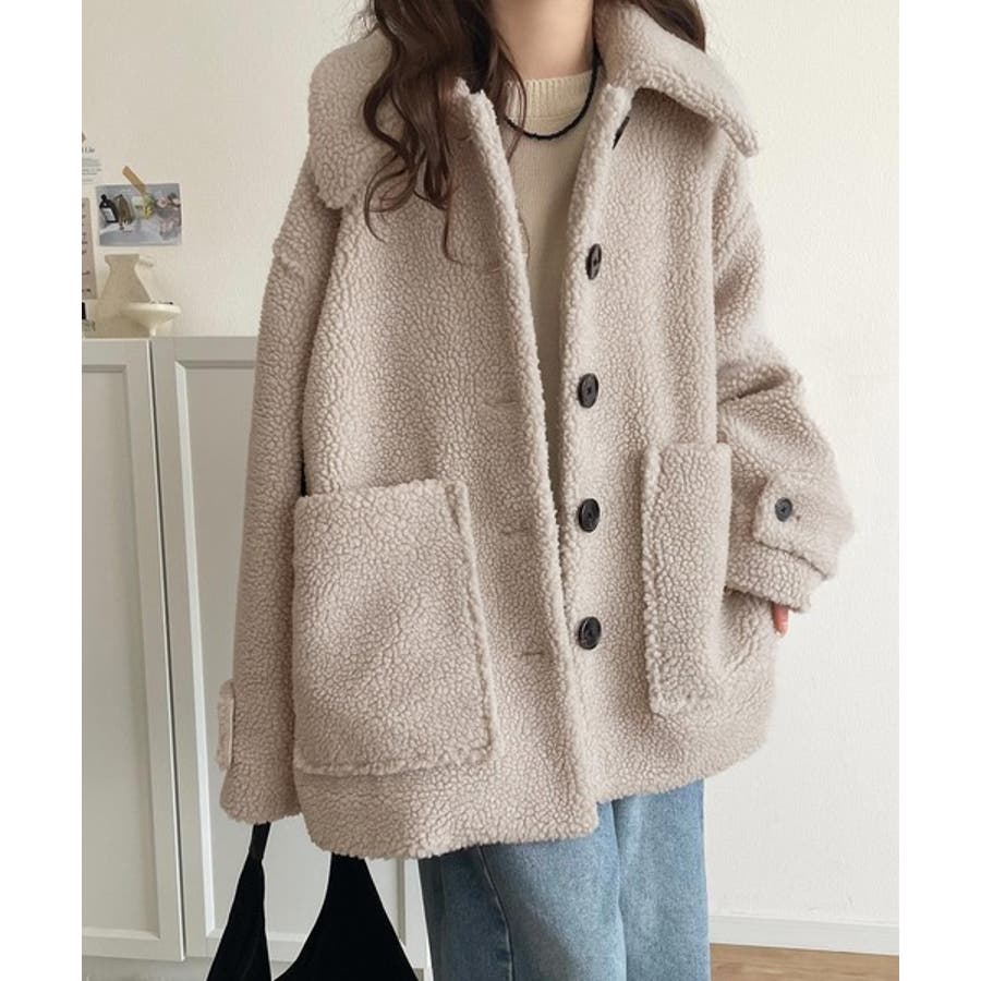 厚手の大粒ボアを使用した、大きめポケットつきショートブルゾン。