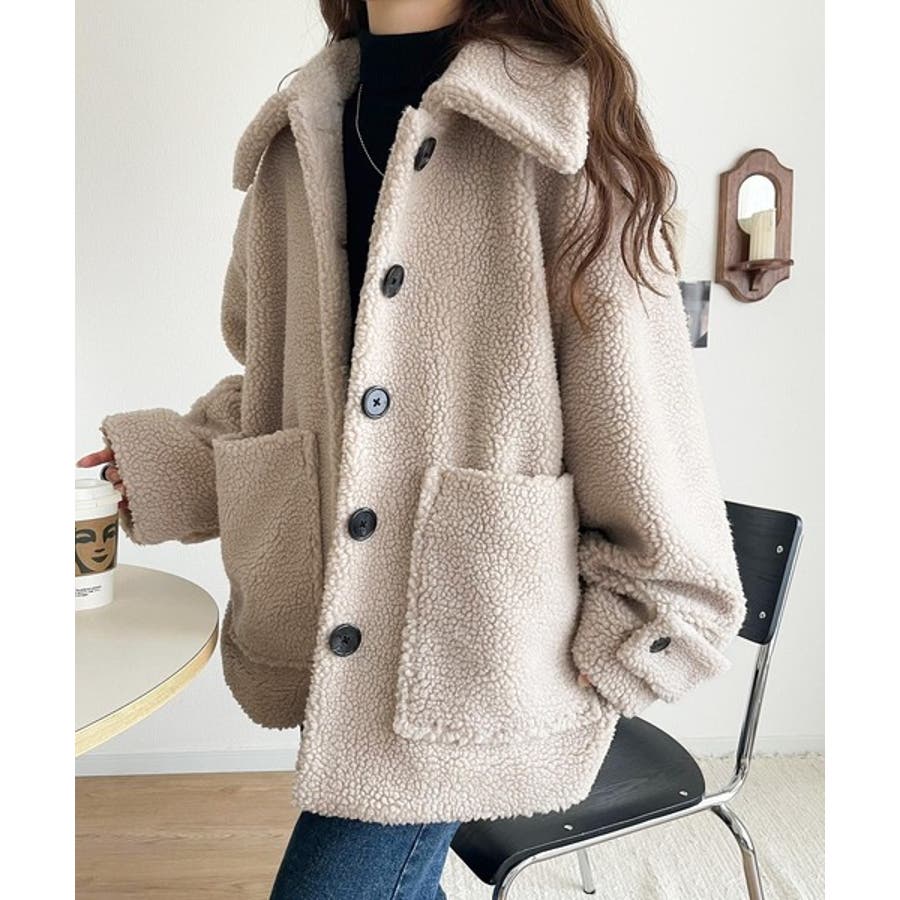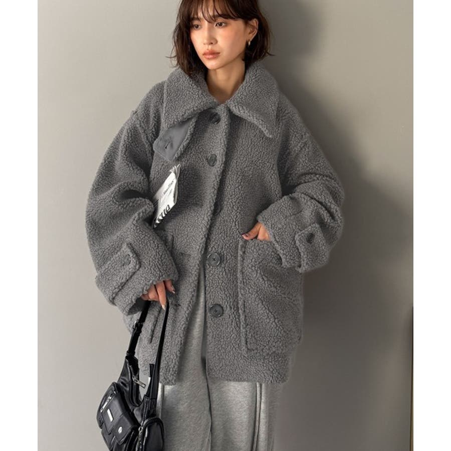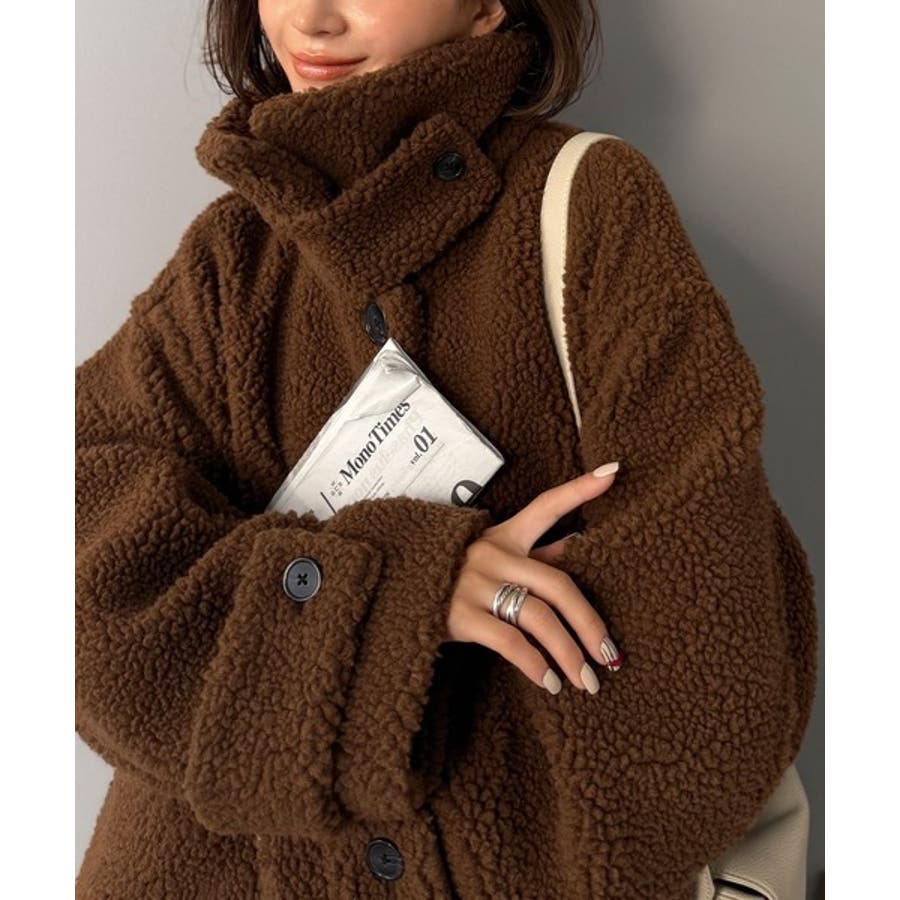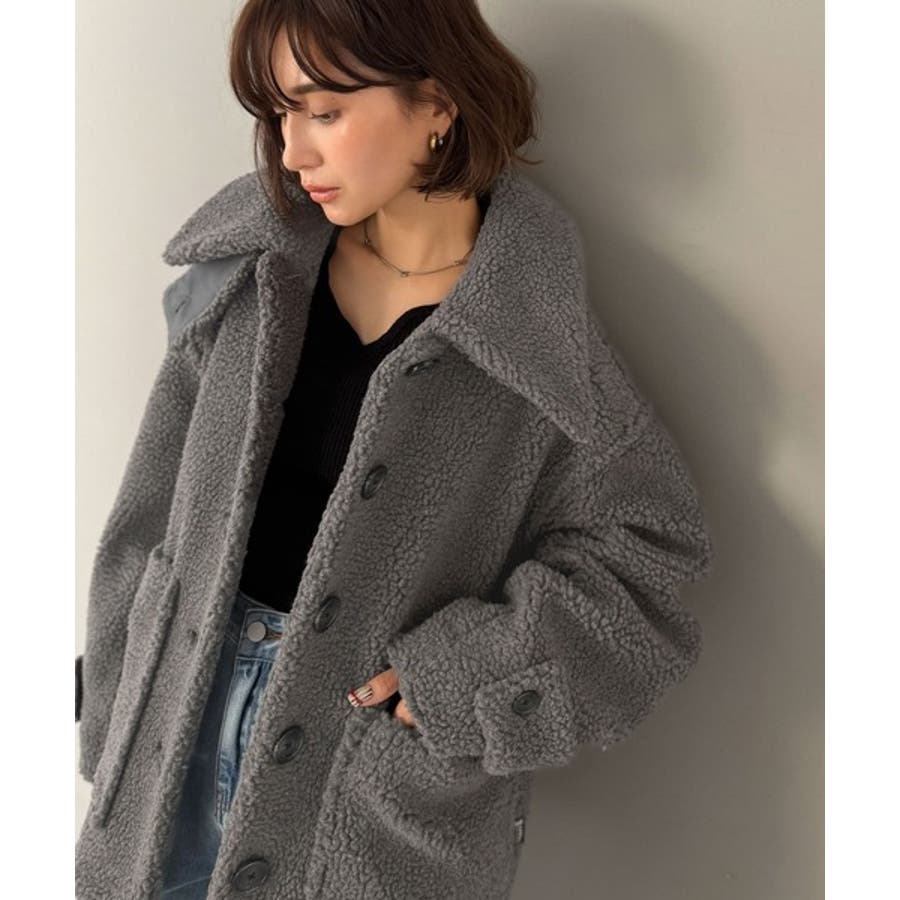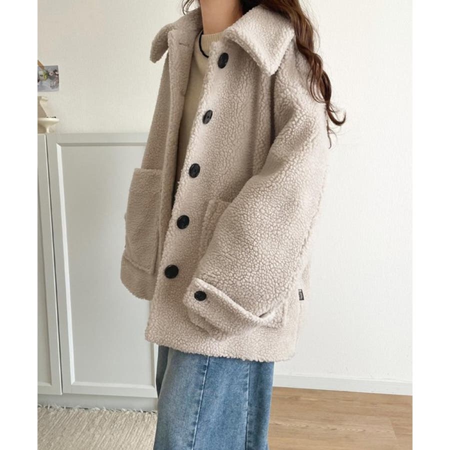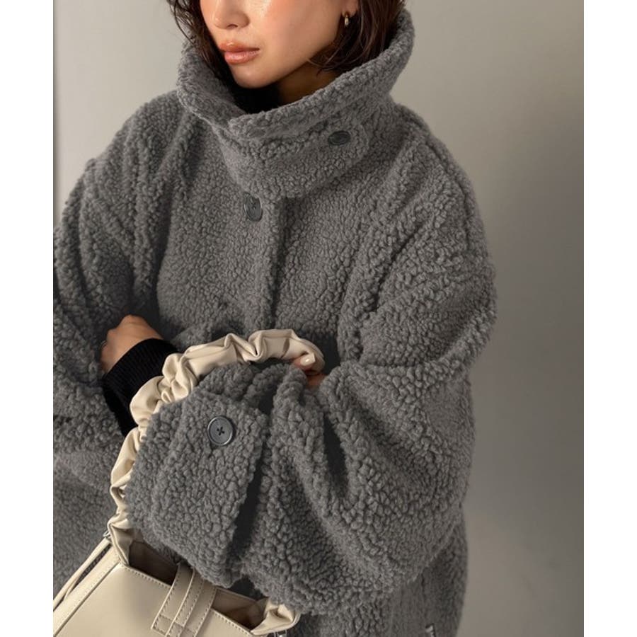 厚手の大粒ボアを使用した、大きめポケットつきショートブルゾン。