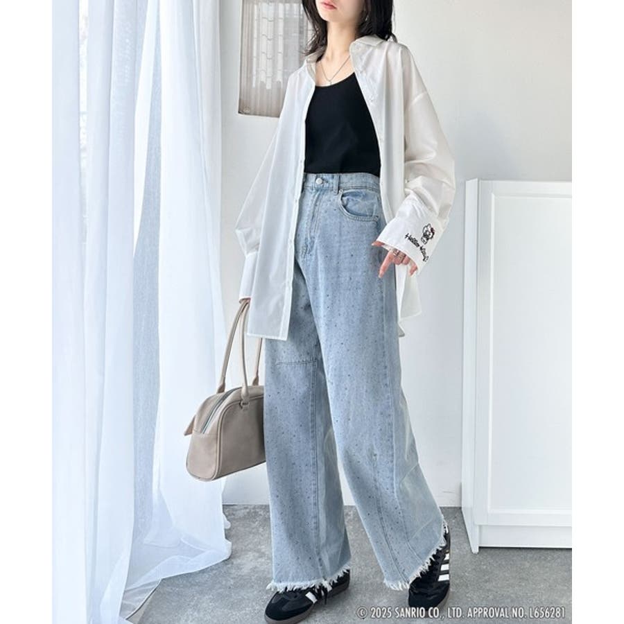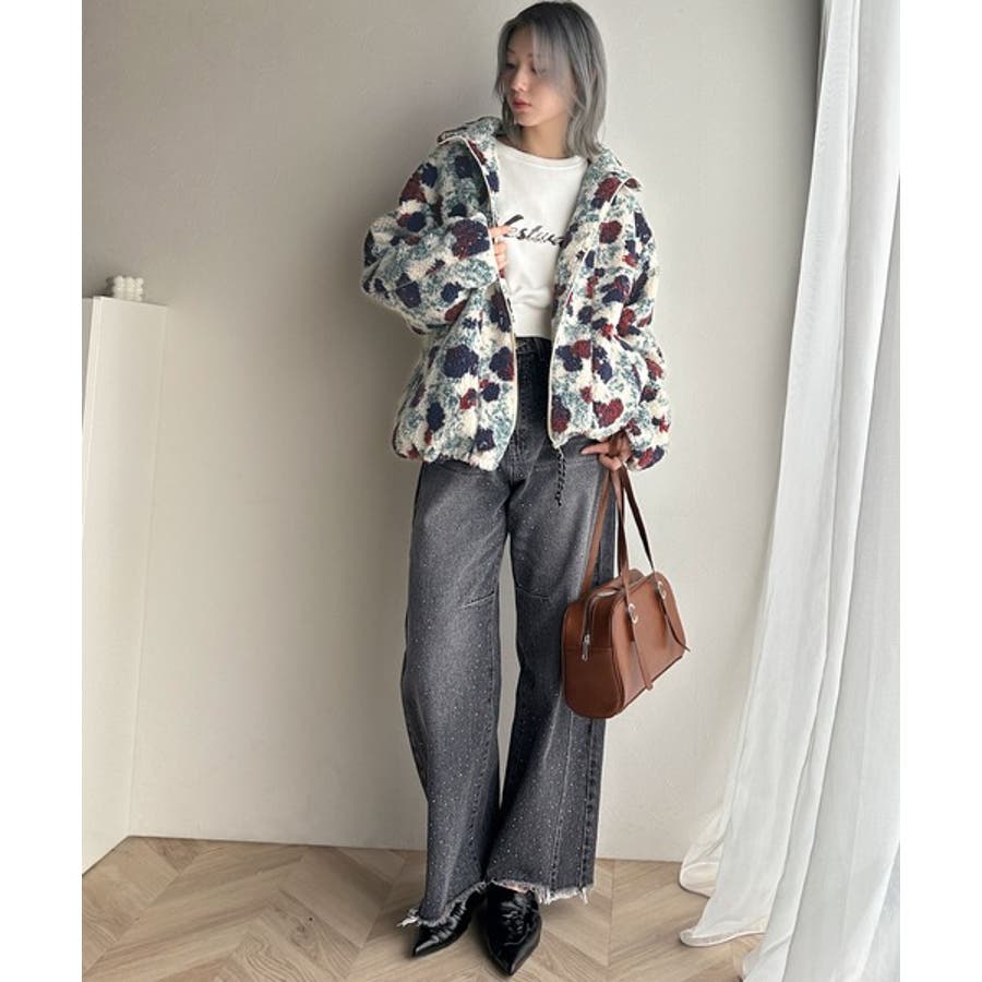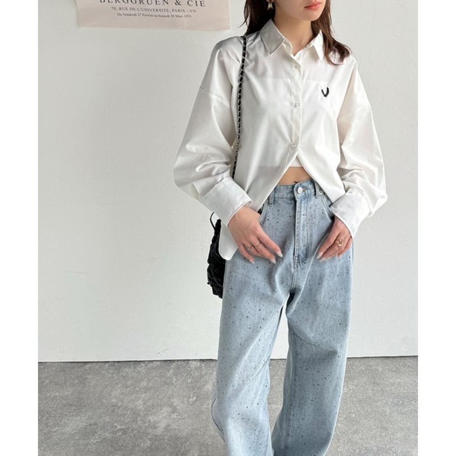メンズライクなデニムと女性らしいモチーフのバランスがお洒落度を高めます。