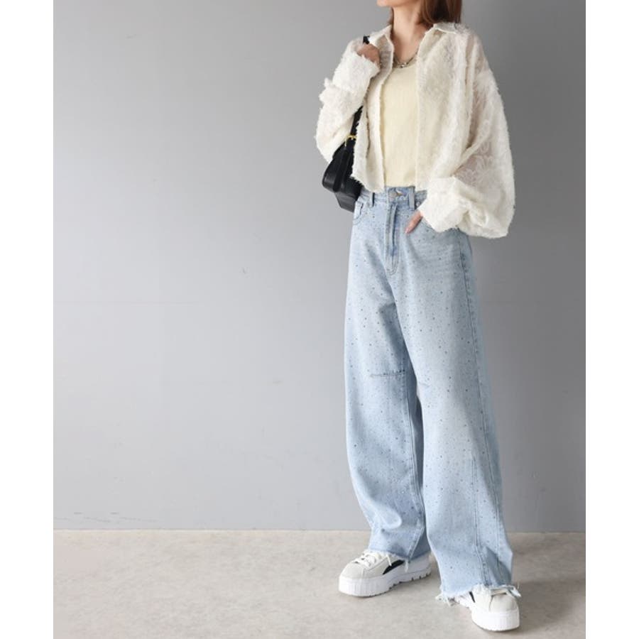 カジュアルなデニムをオーロラビジューで