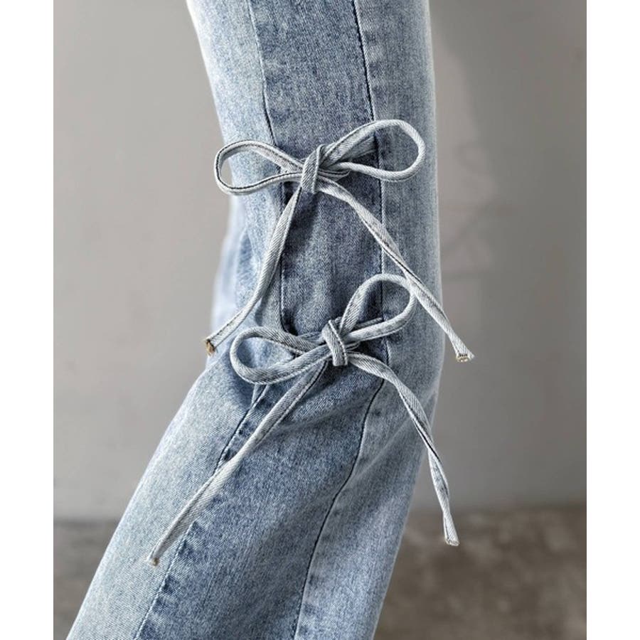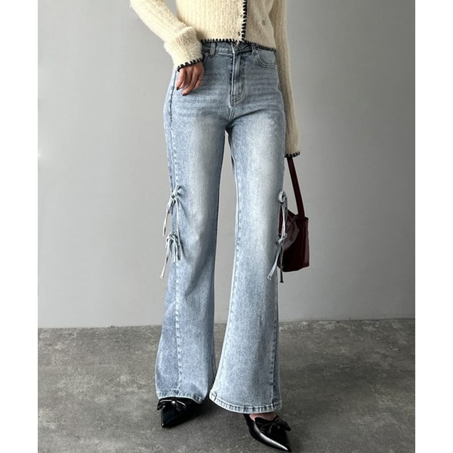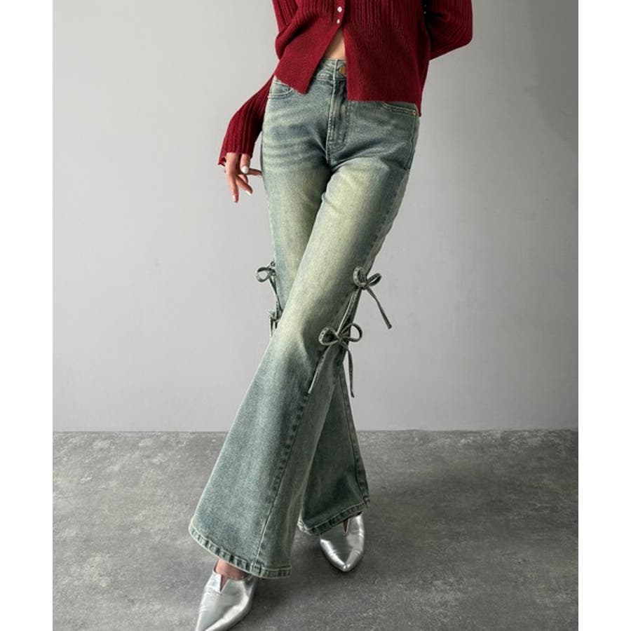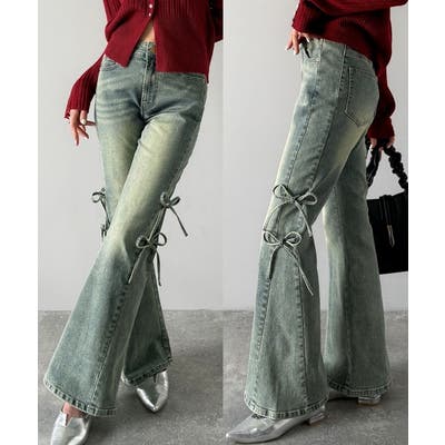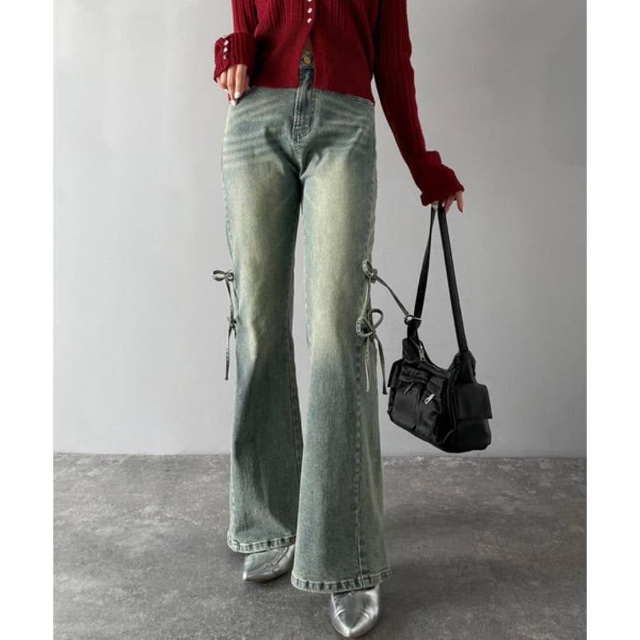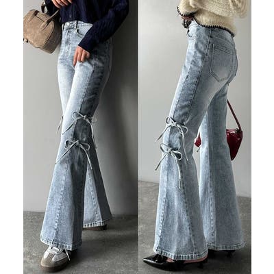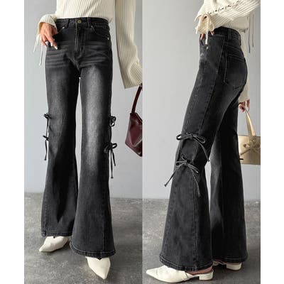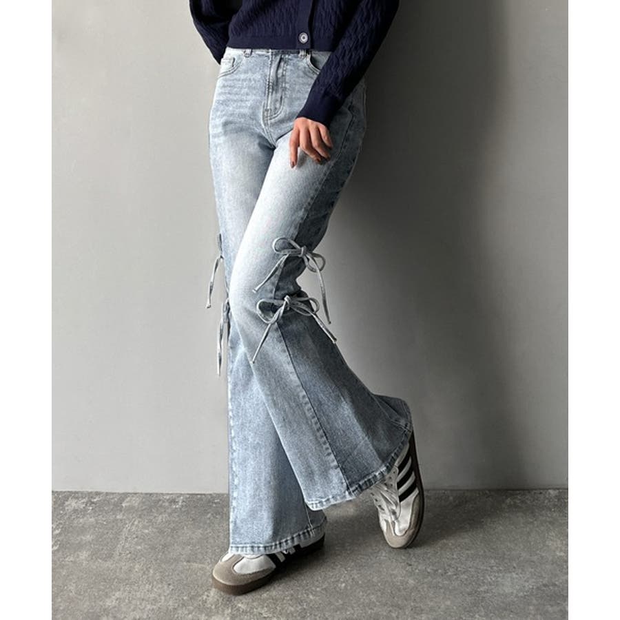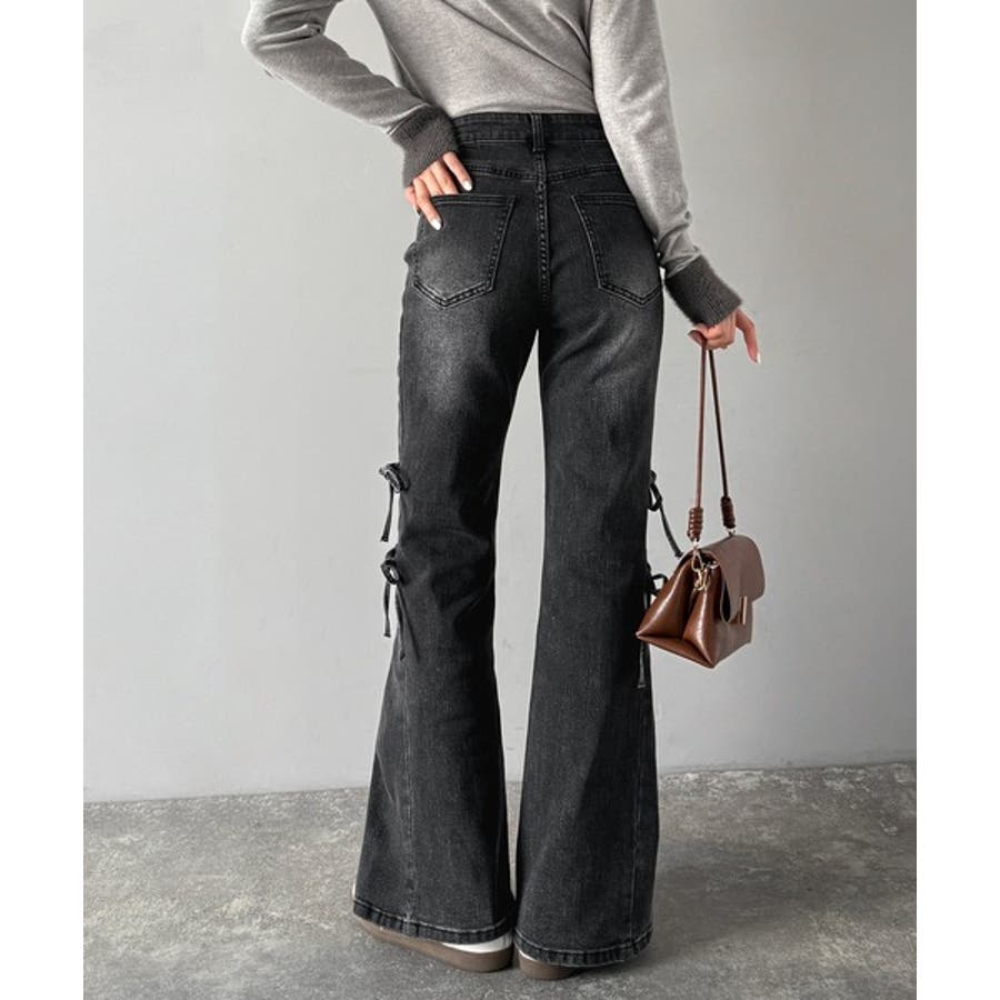 美脚を引き立てる。サイドリボンデザインストレッチフリンジフレアデニム
