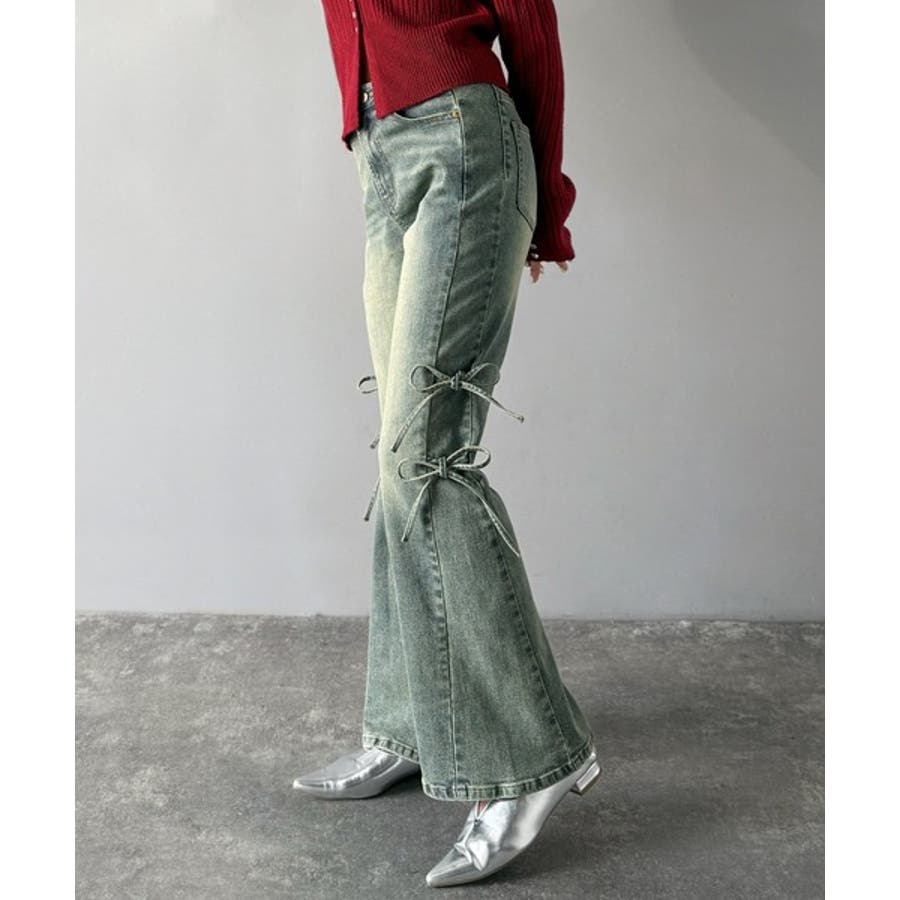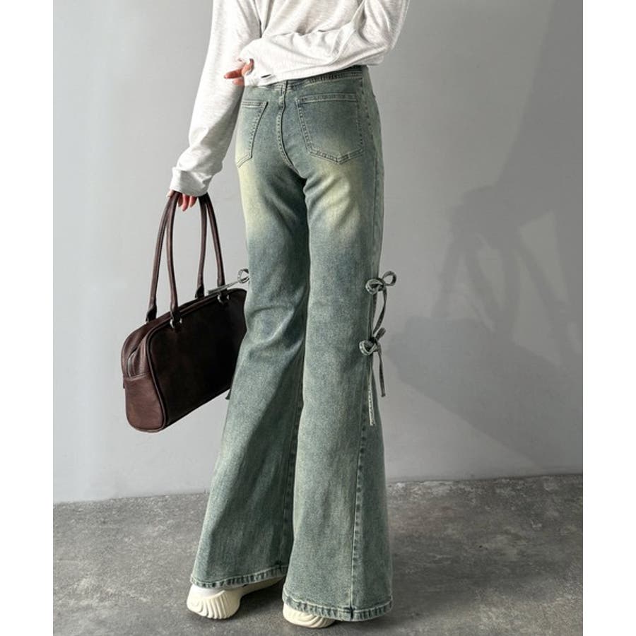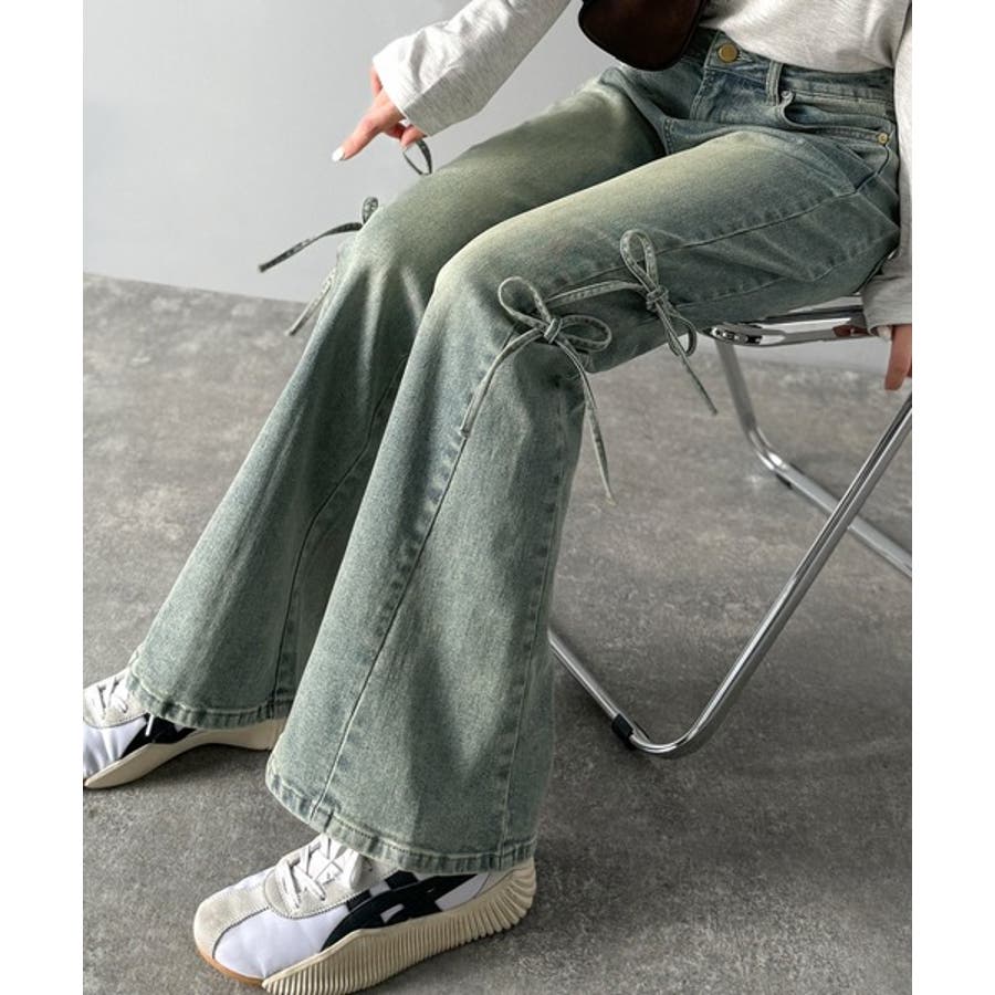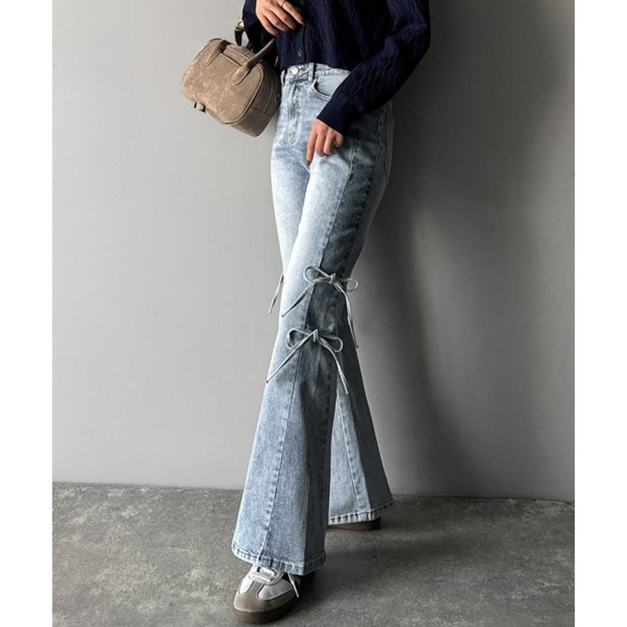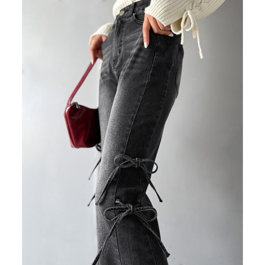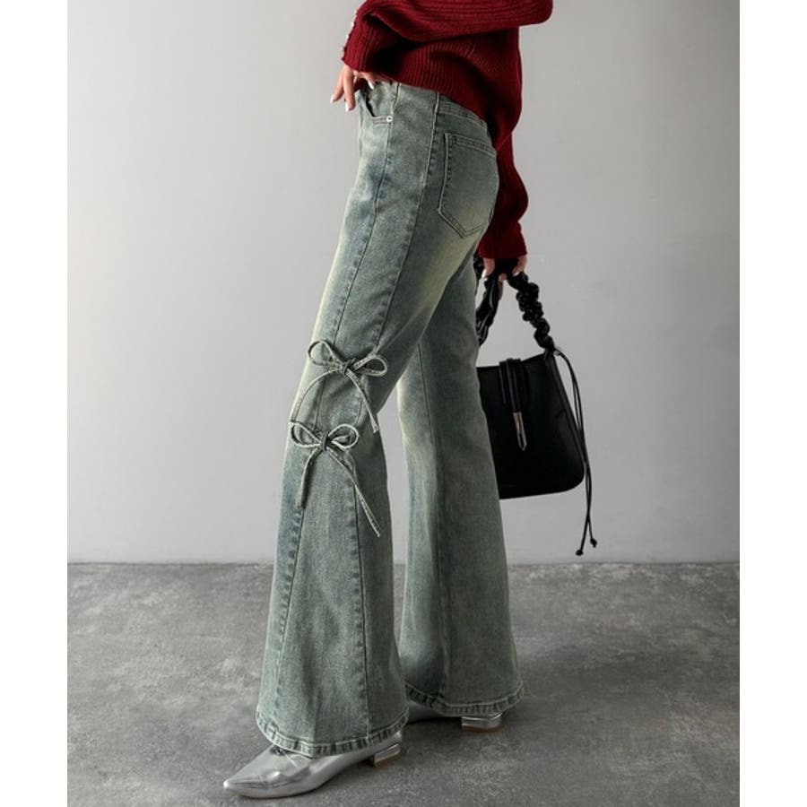 美脚を引き立てる。サイドリボンデザインストレッチフリンジフレアデニム