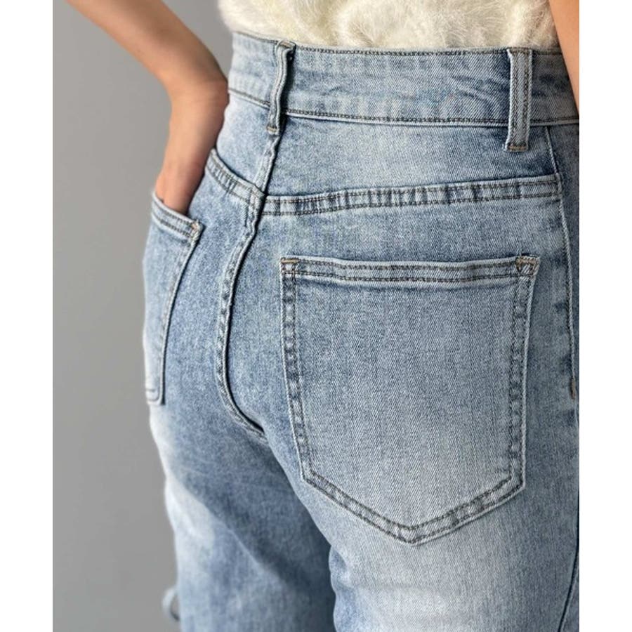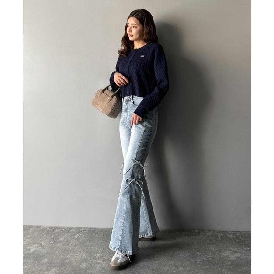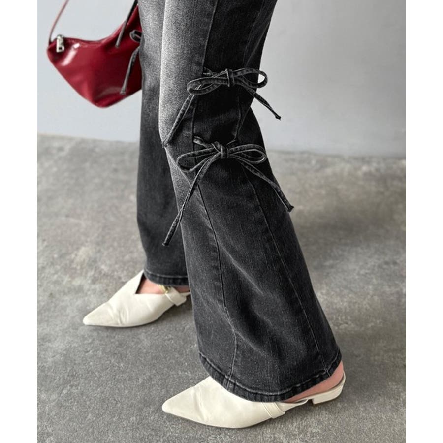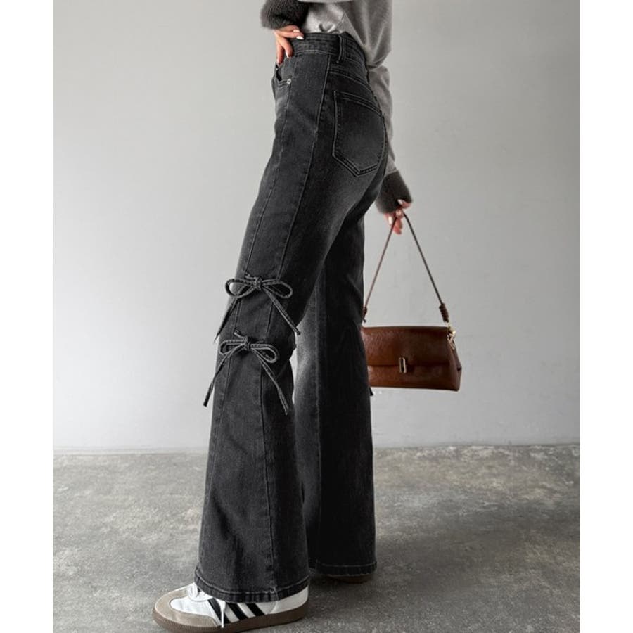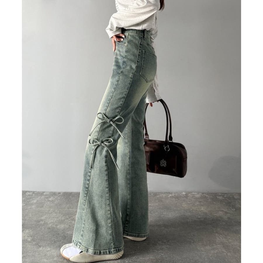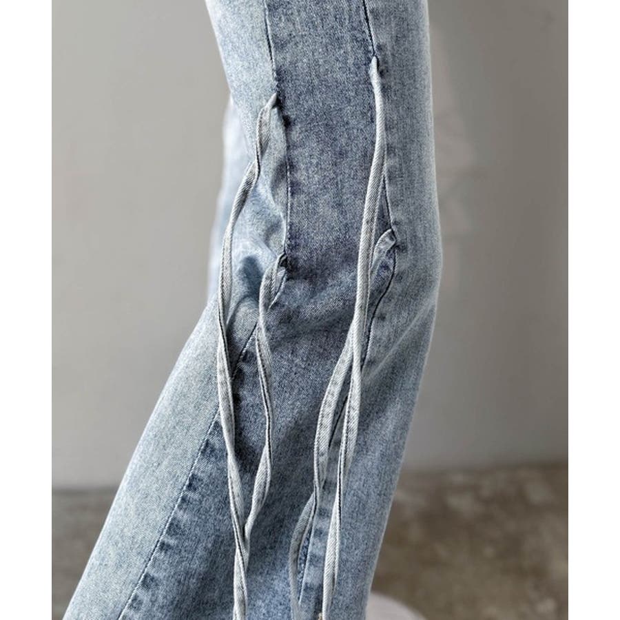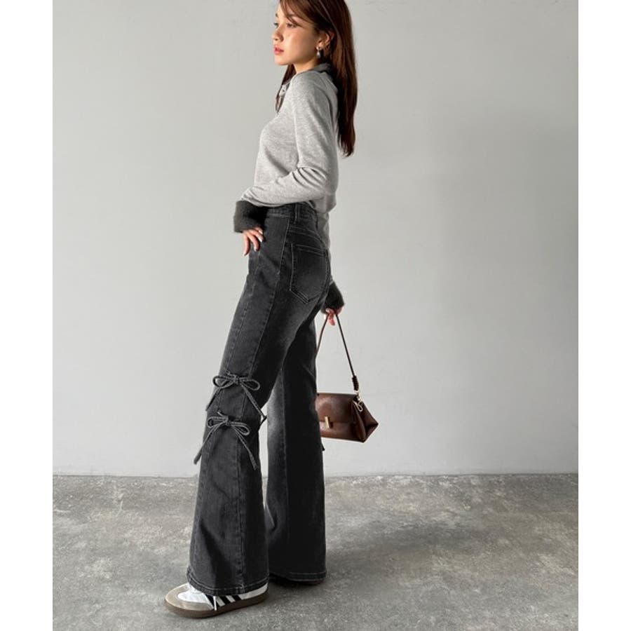 美脚を引き立てる。サイドリボンデザインストレッチフリンジフレアデニム