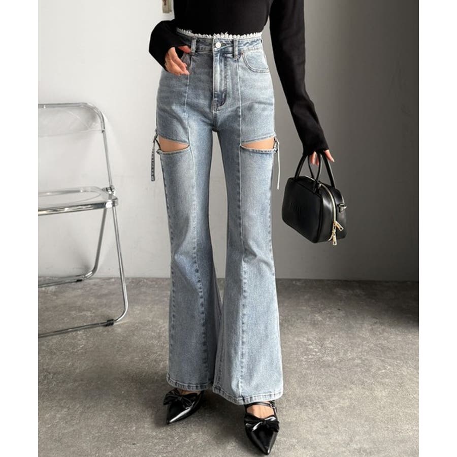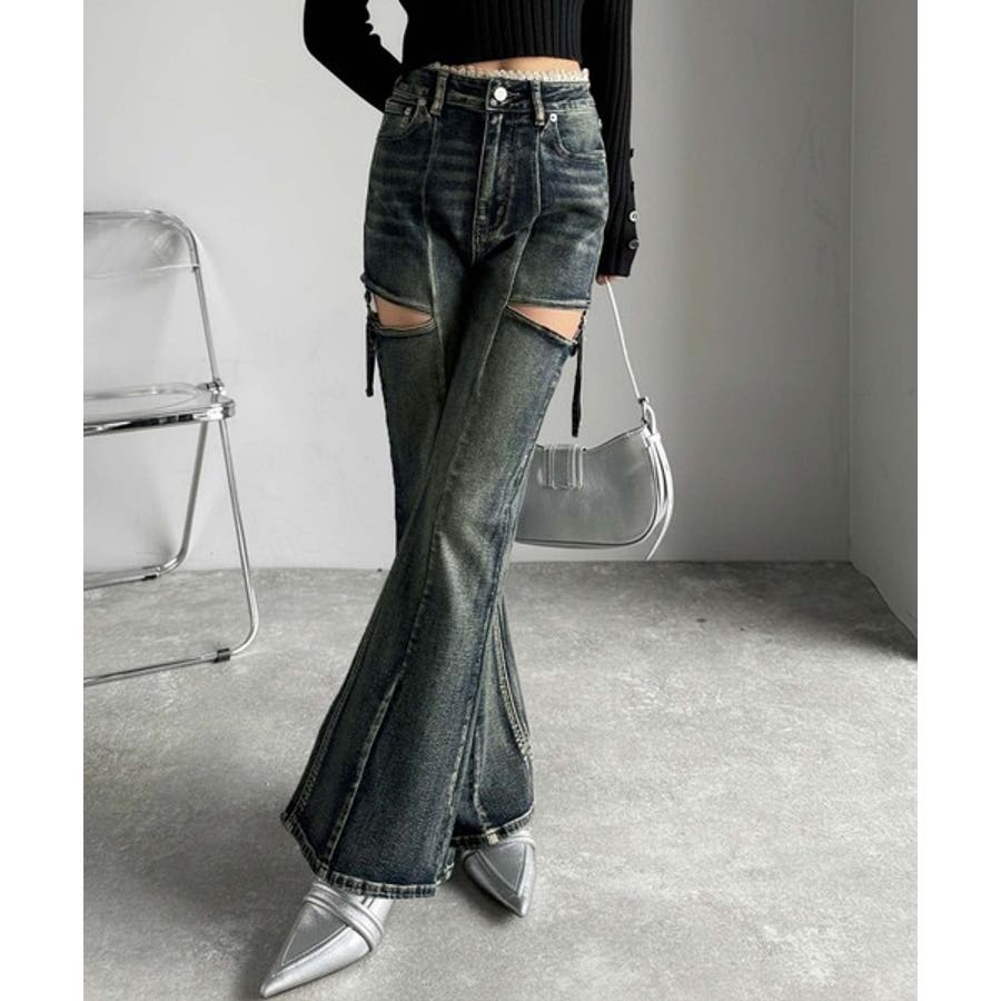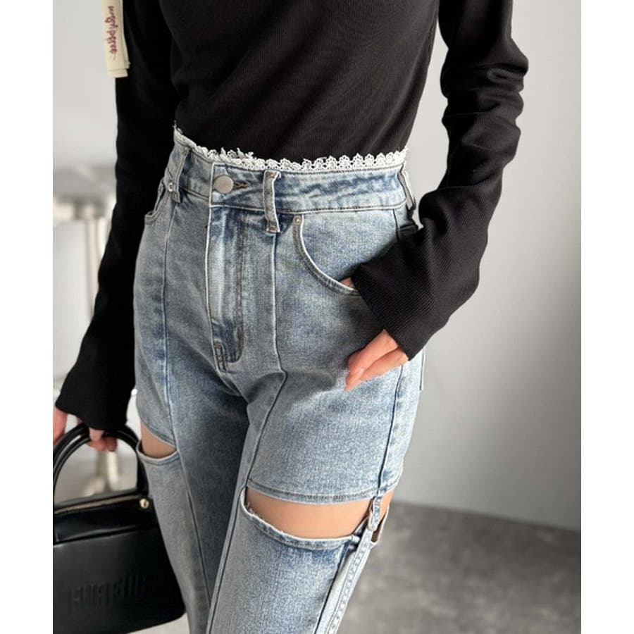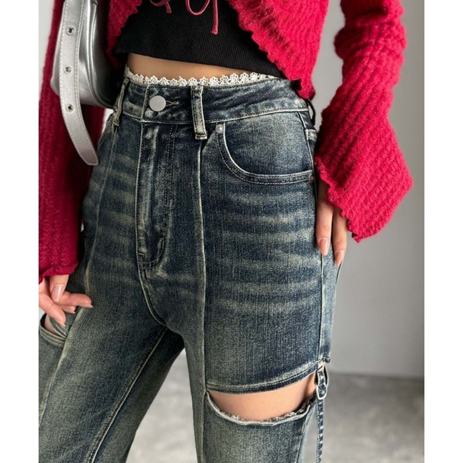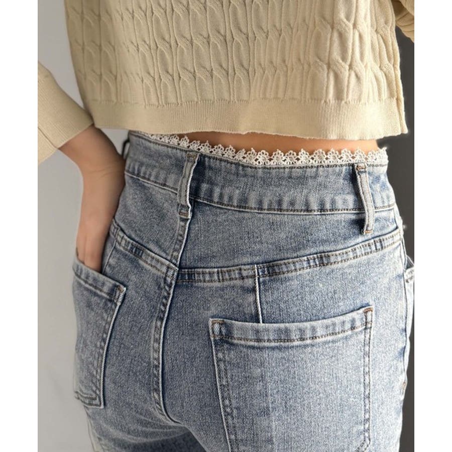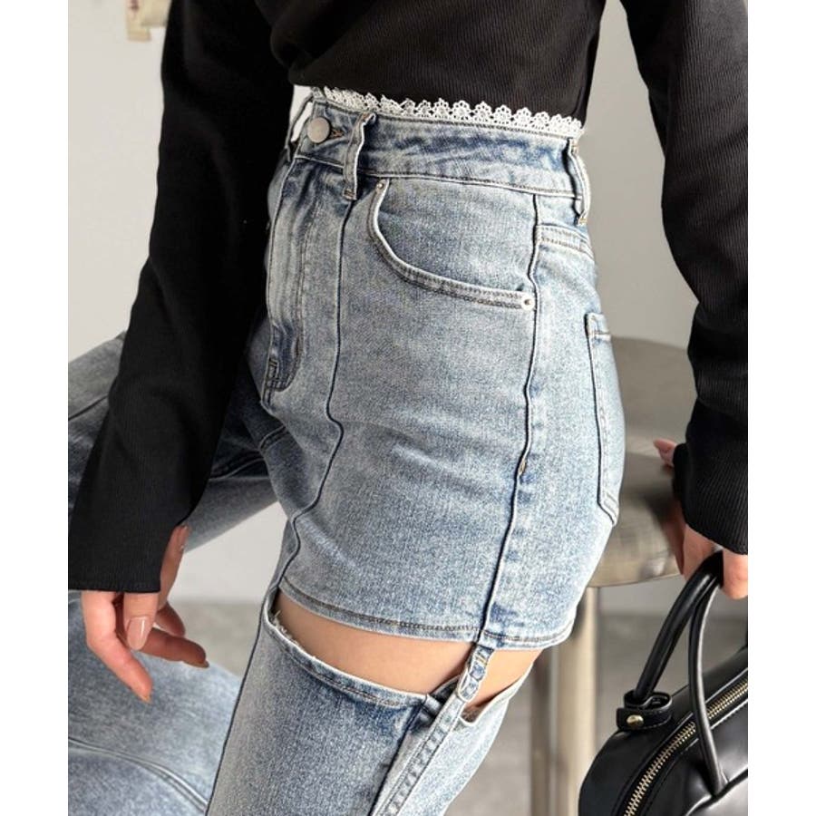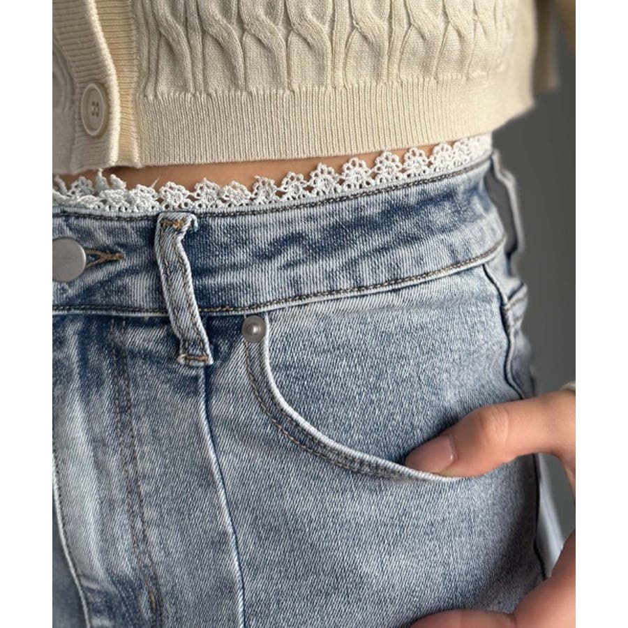 甘すぎないスリットで肌魅せ美脚。ウエストピコレースカットアウトリボン使いデニムパ…
