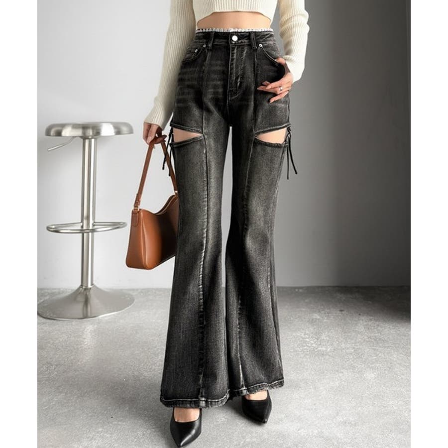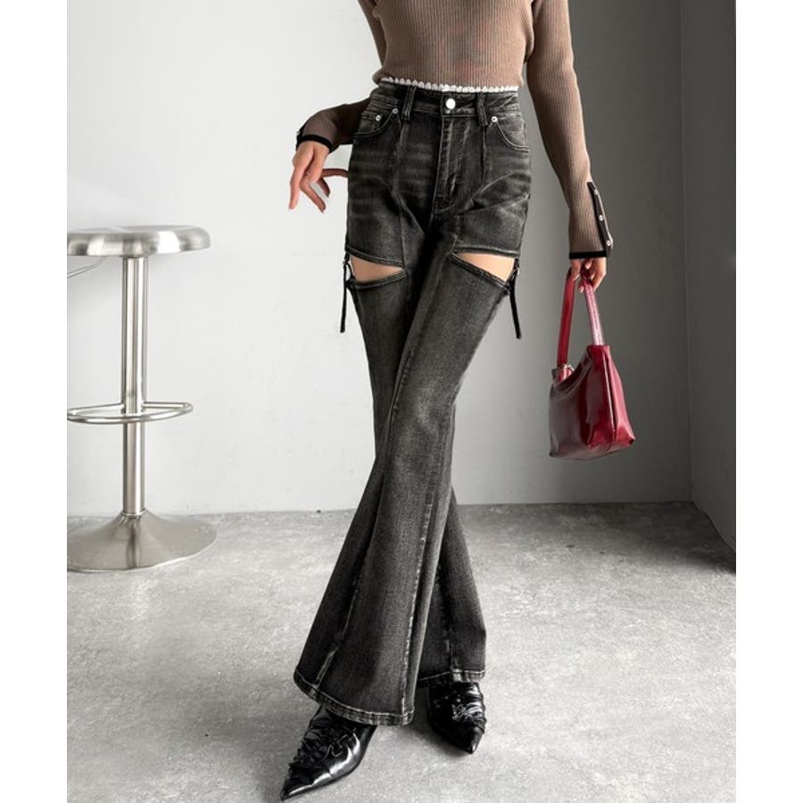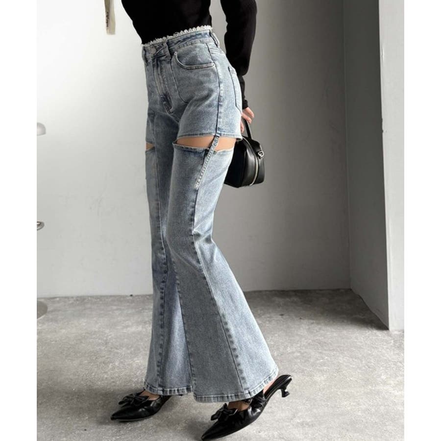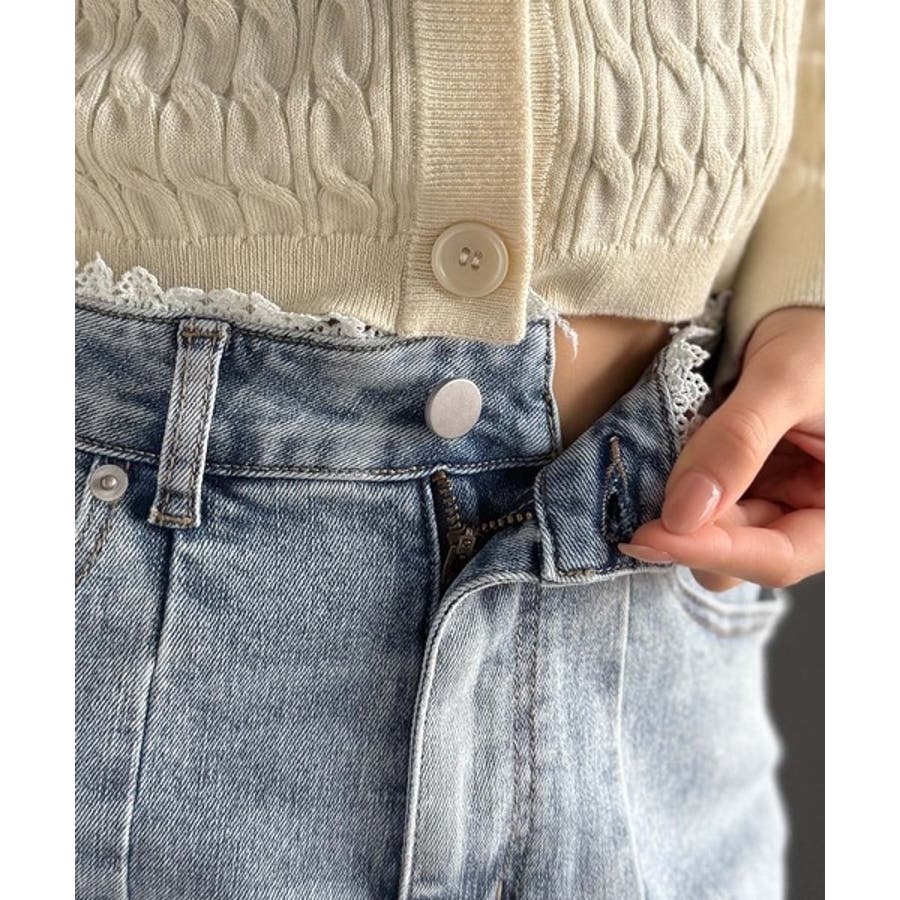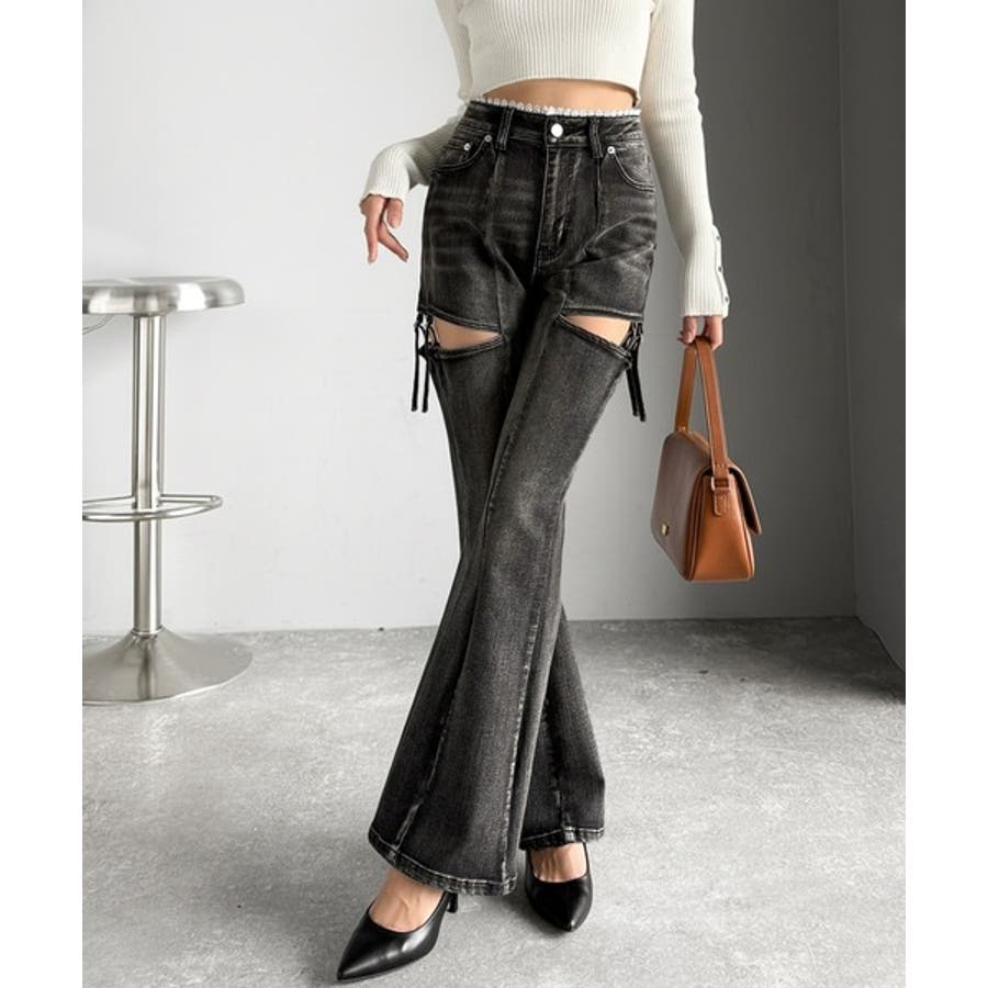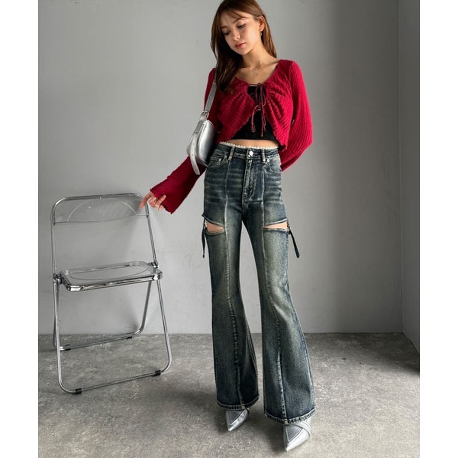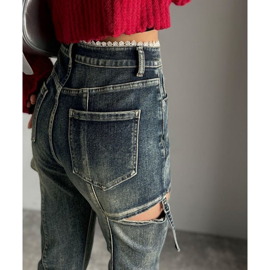 甘すぎないスリットで肌魅せ美脚。ウエストピコレースカットアウトリボン使いデニムパ…