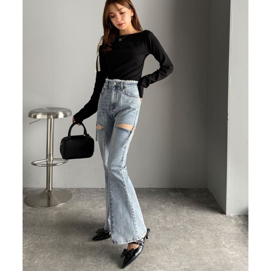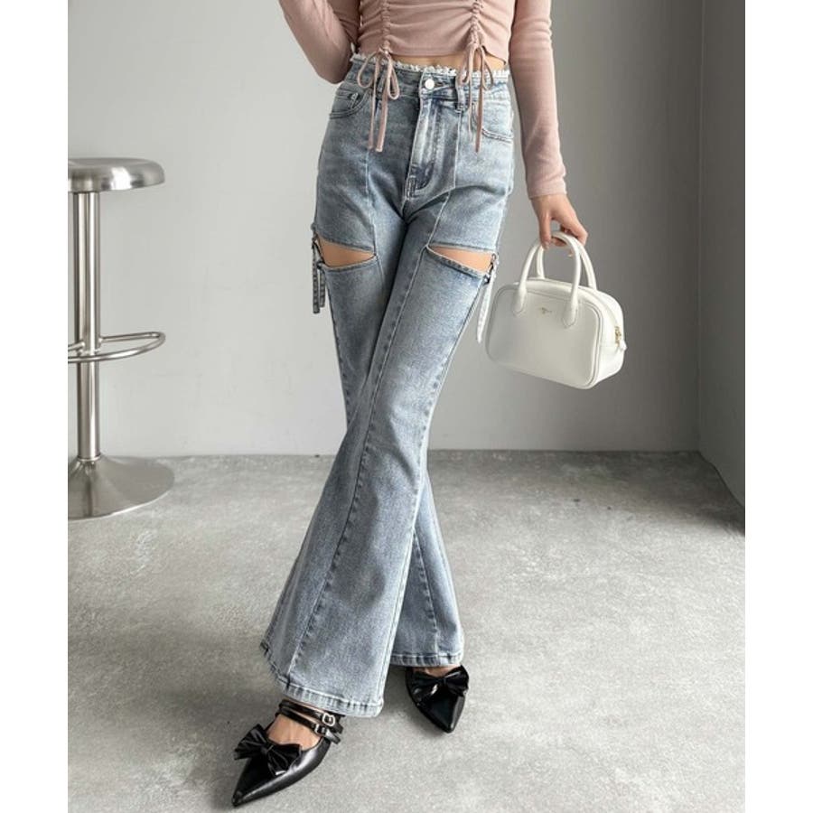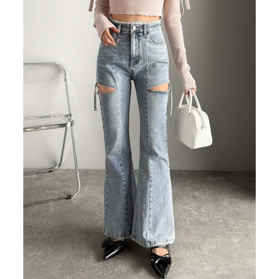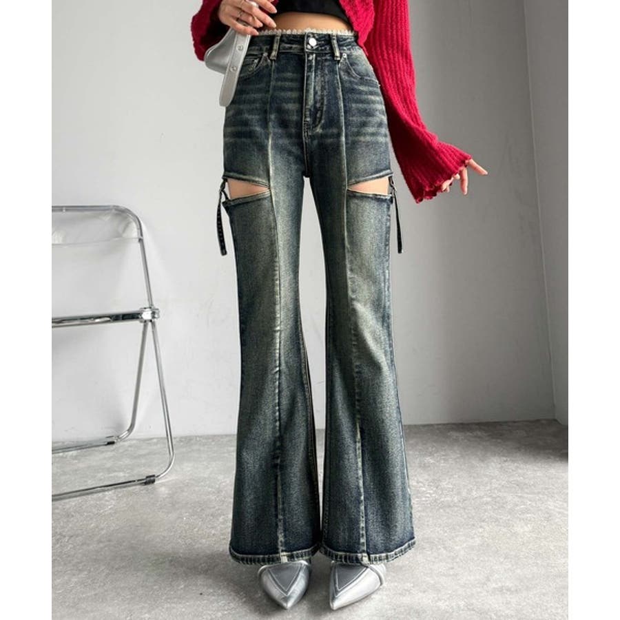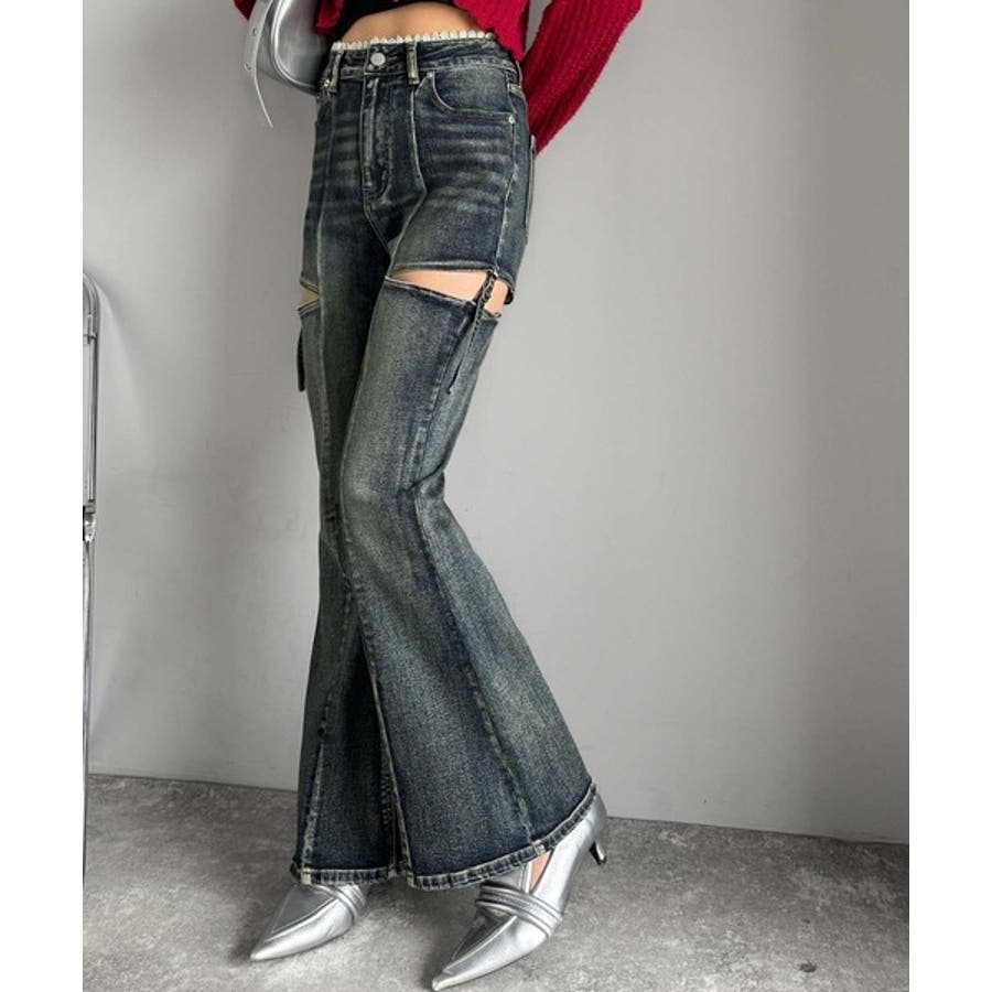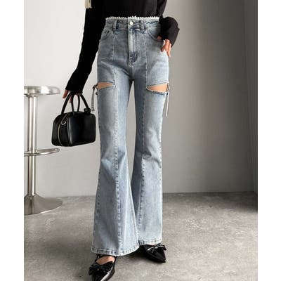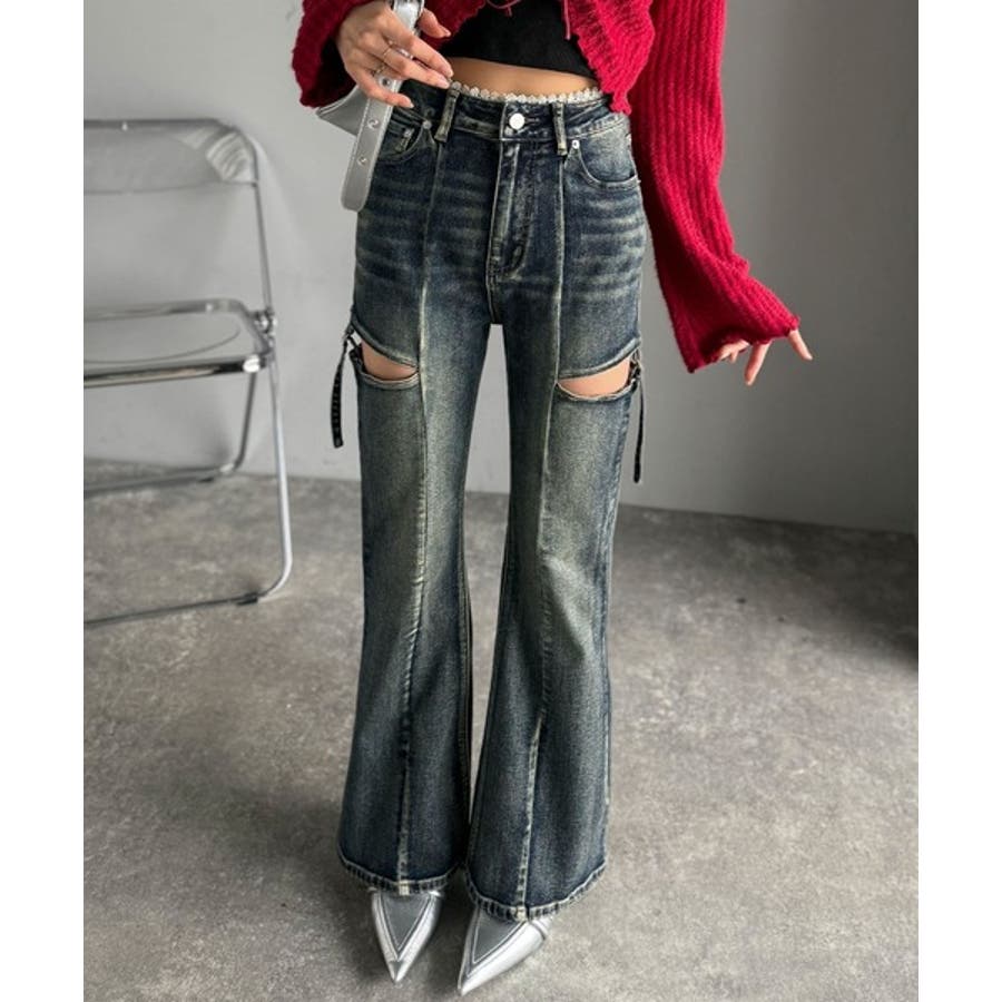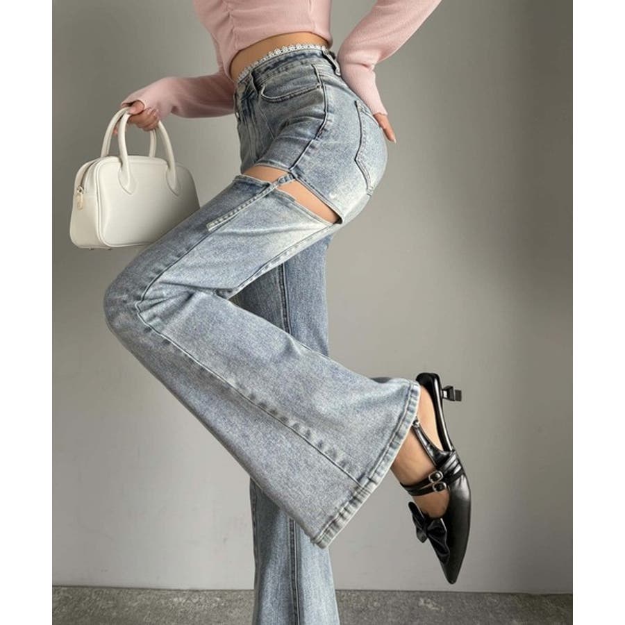 甘すぎないスリットで肌魅せ美脚。ウエストピコレースカットアウトリボン使いデニムパ…