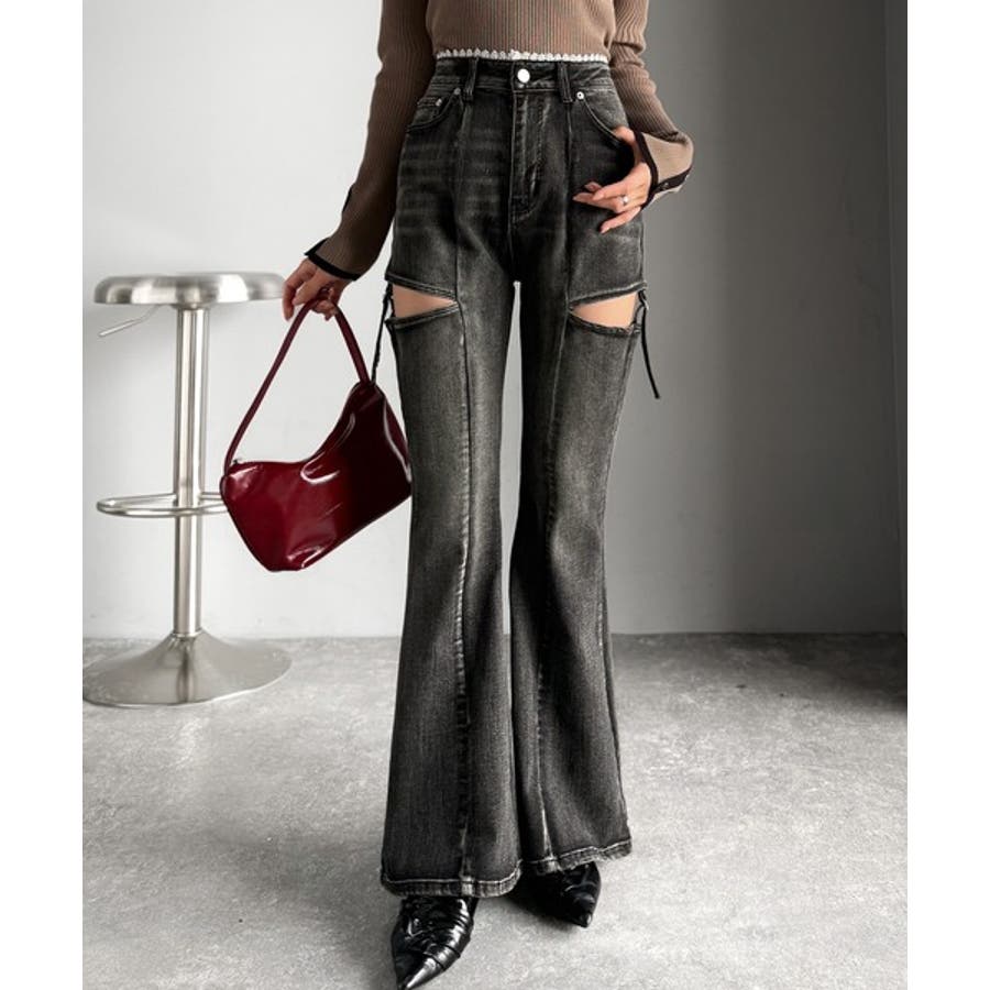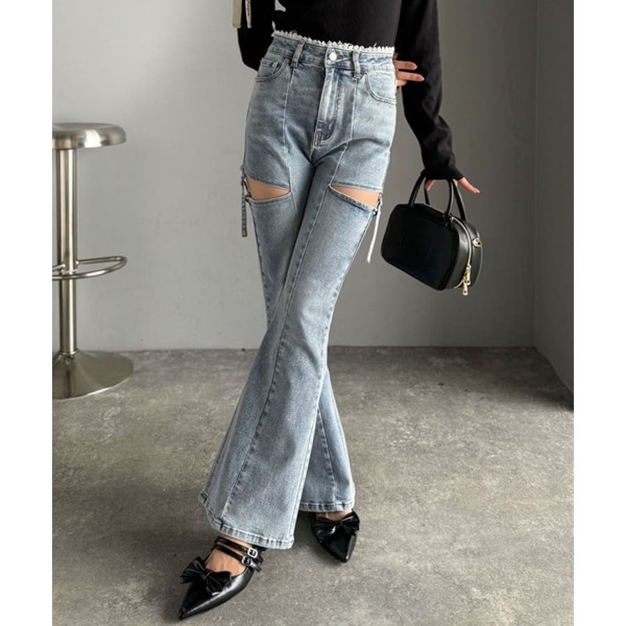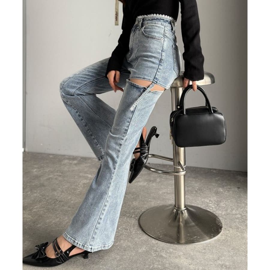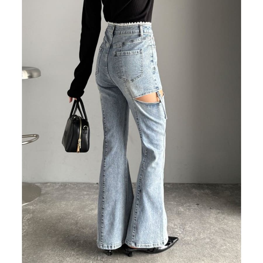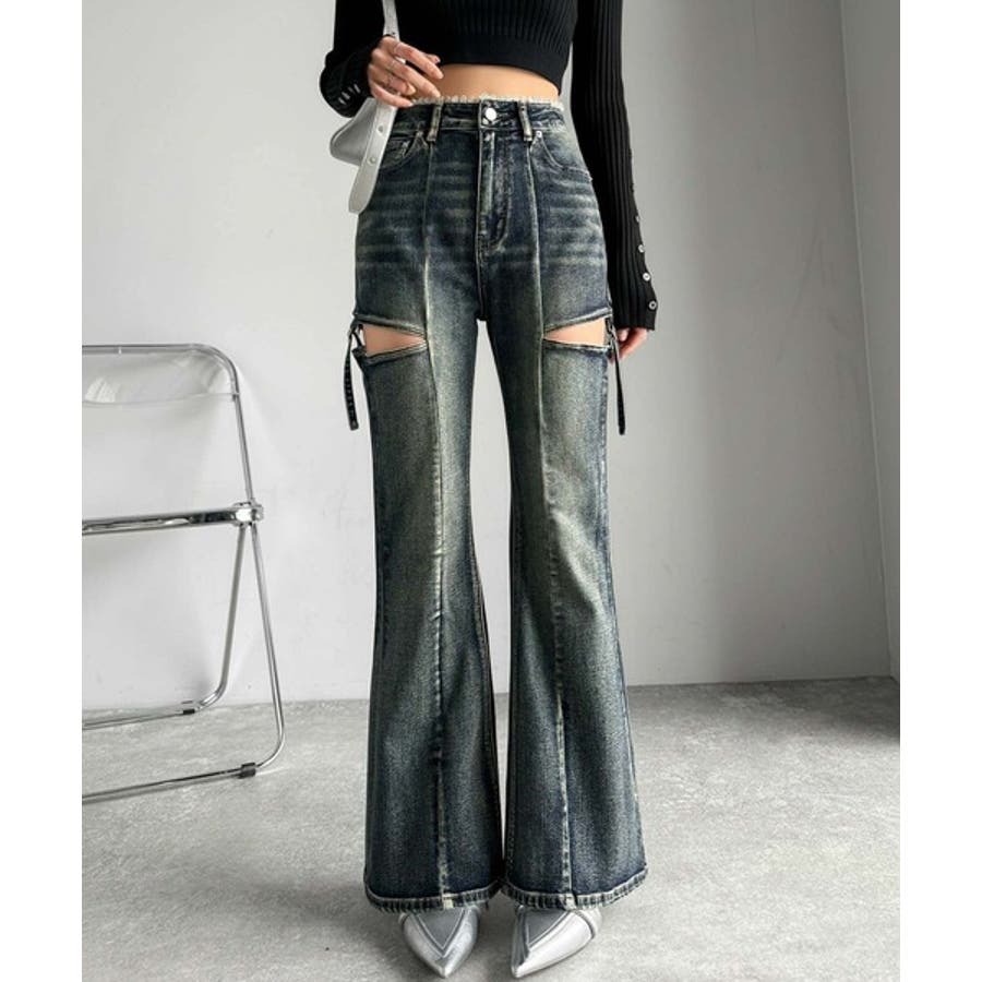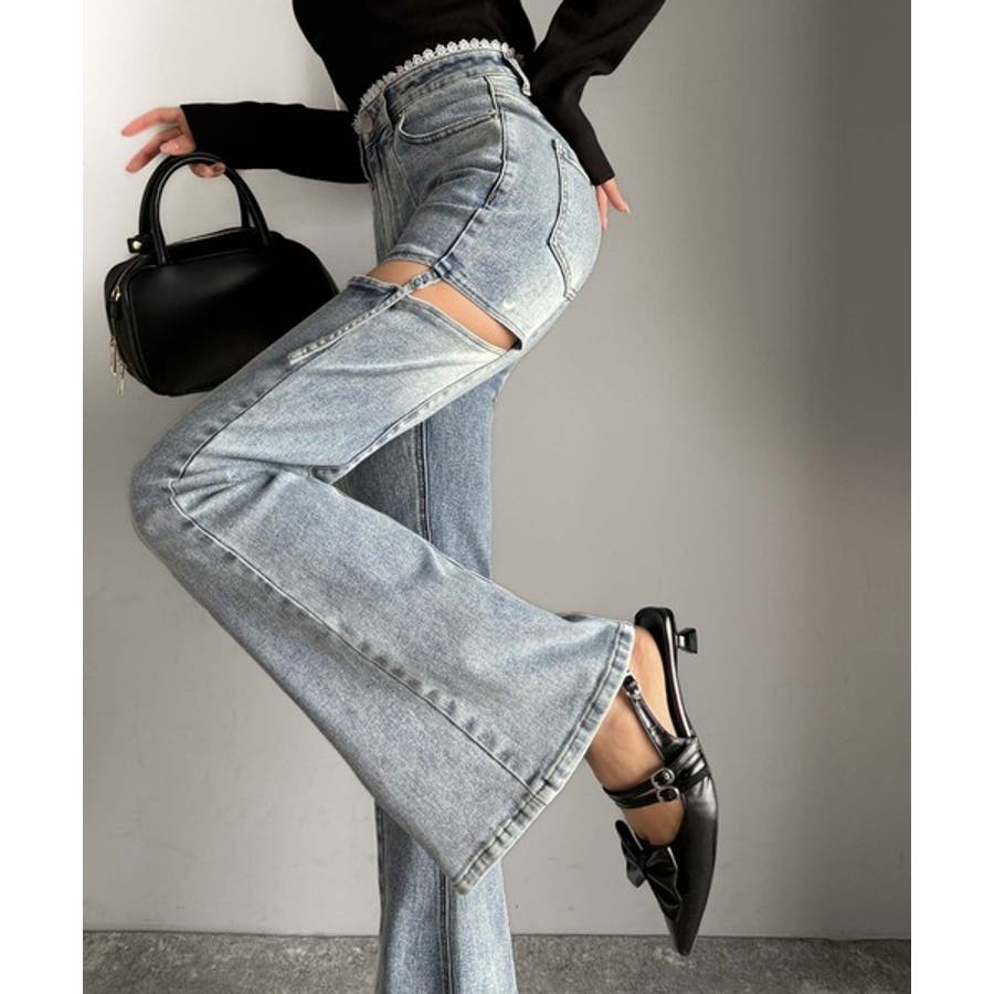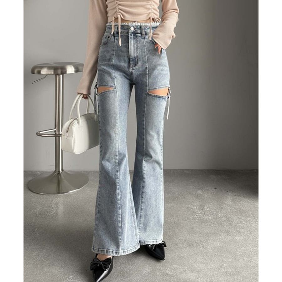 甘すぎないスリットで肌魅せ美脚。ウエストピコレースカットアウトリボン使いデニムパ…