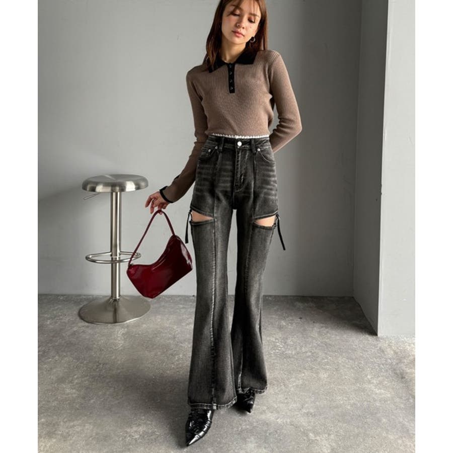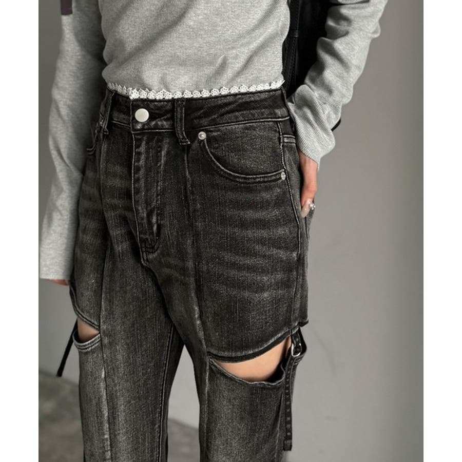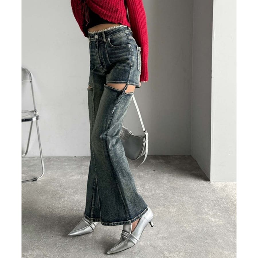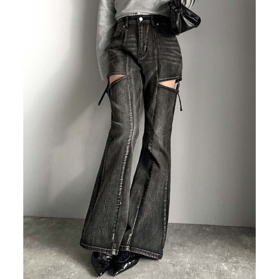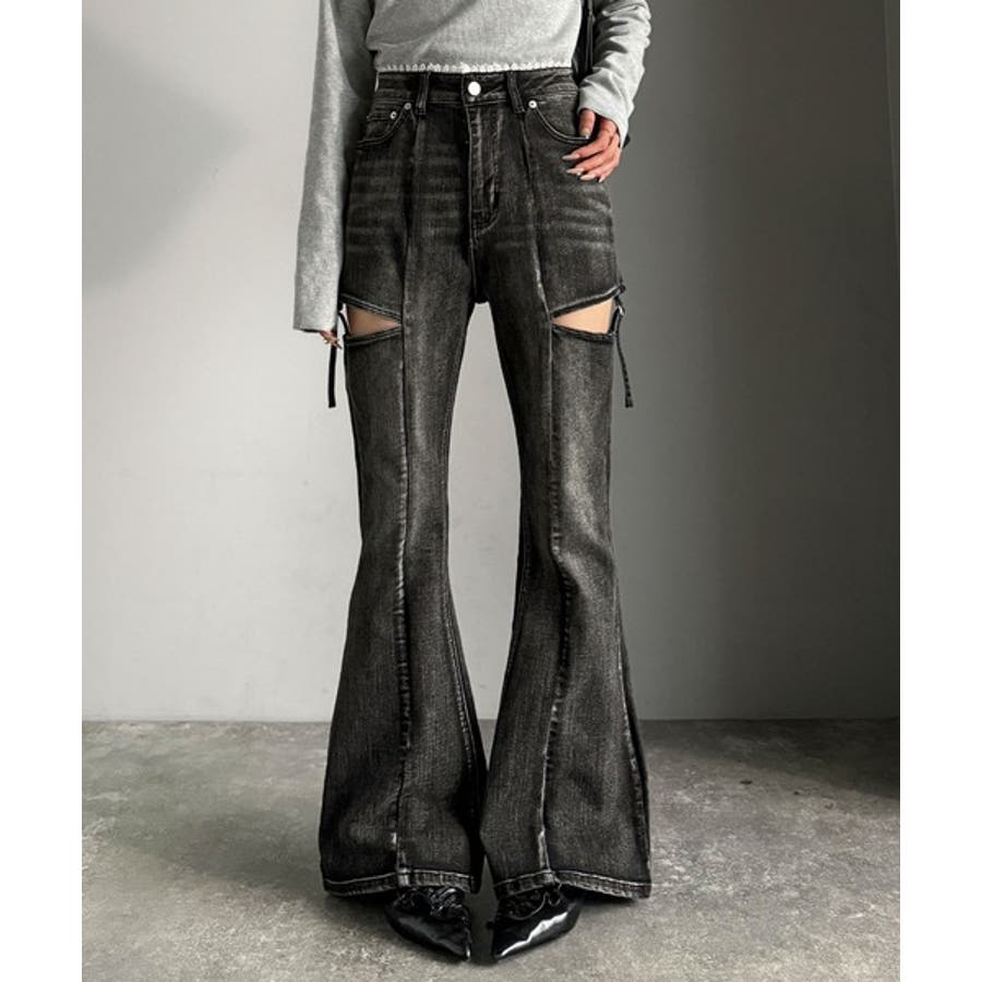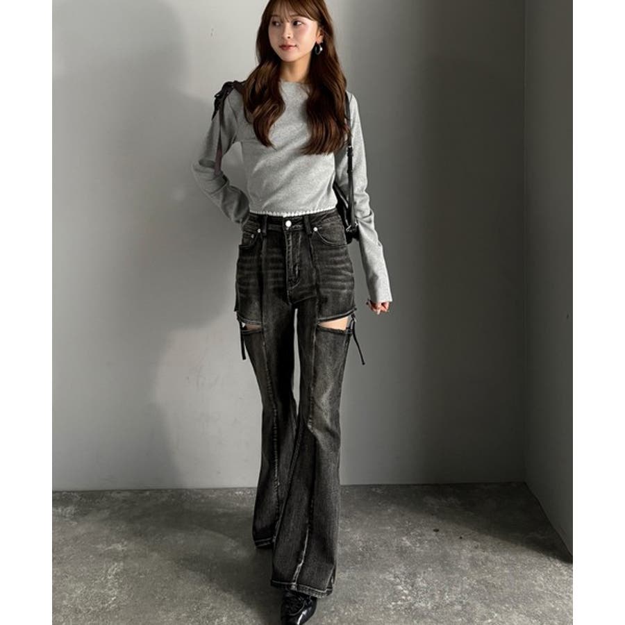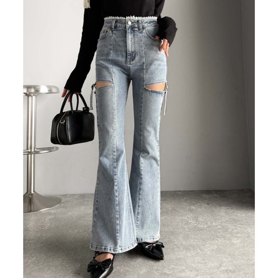 甘すぎないスリットで肌魅せ美脚。ウエストピコレースカットアウトリボン使いデニムパ…