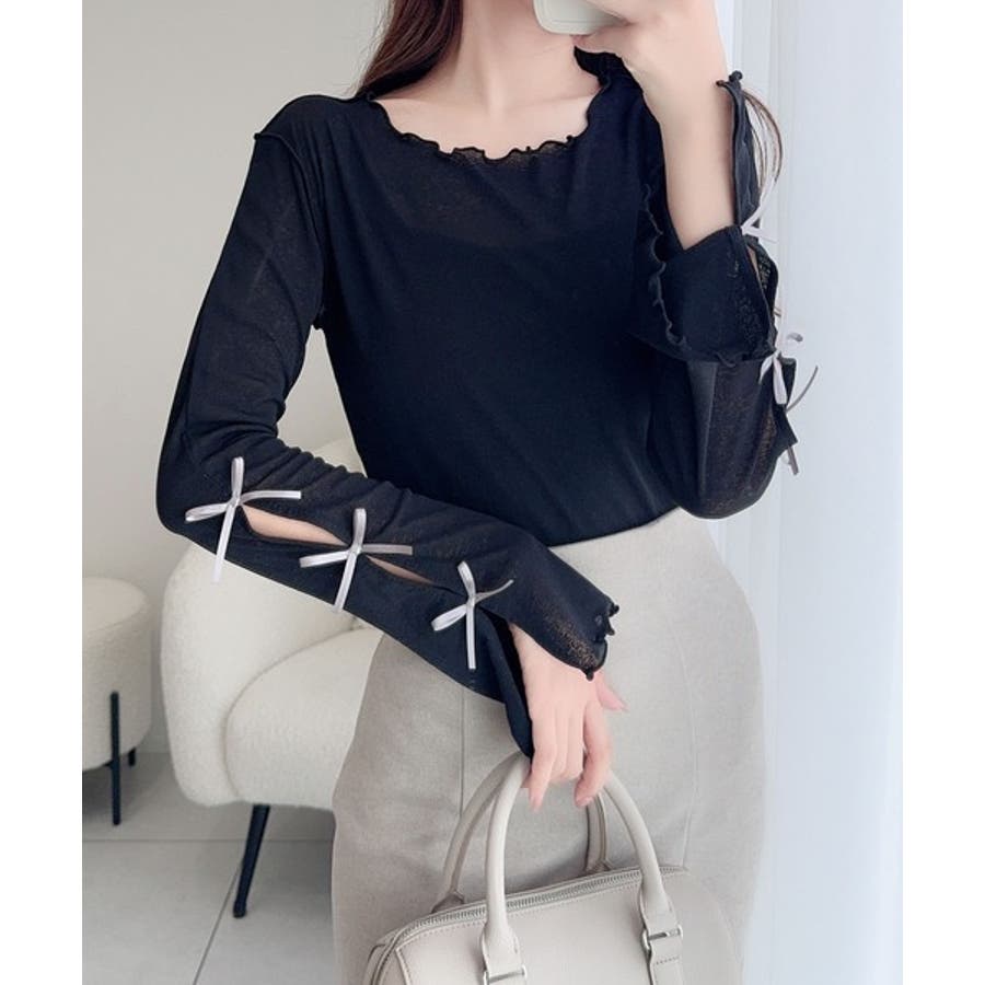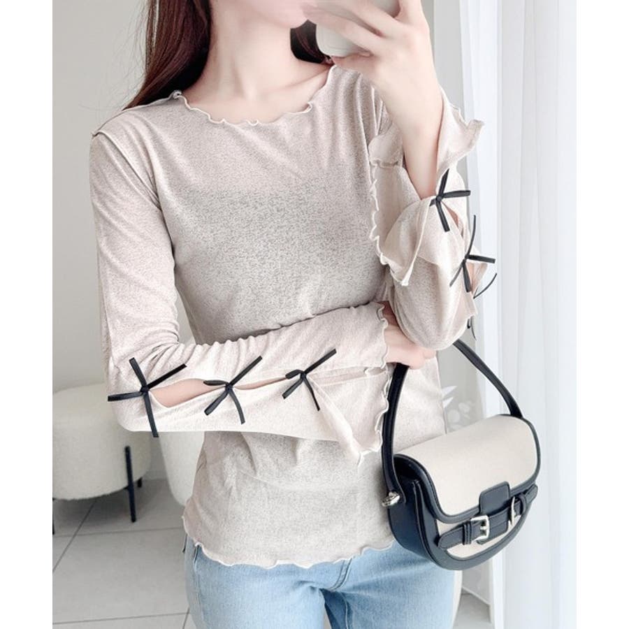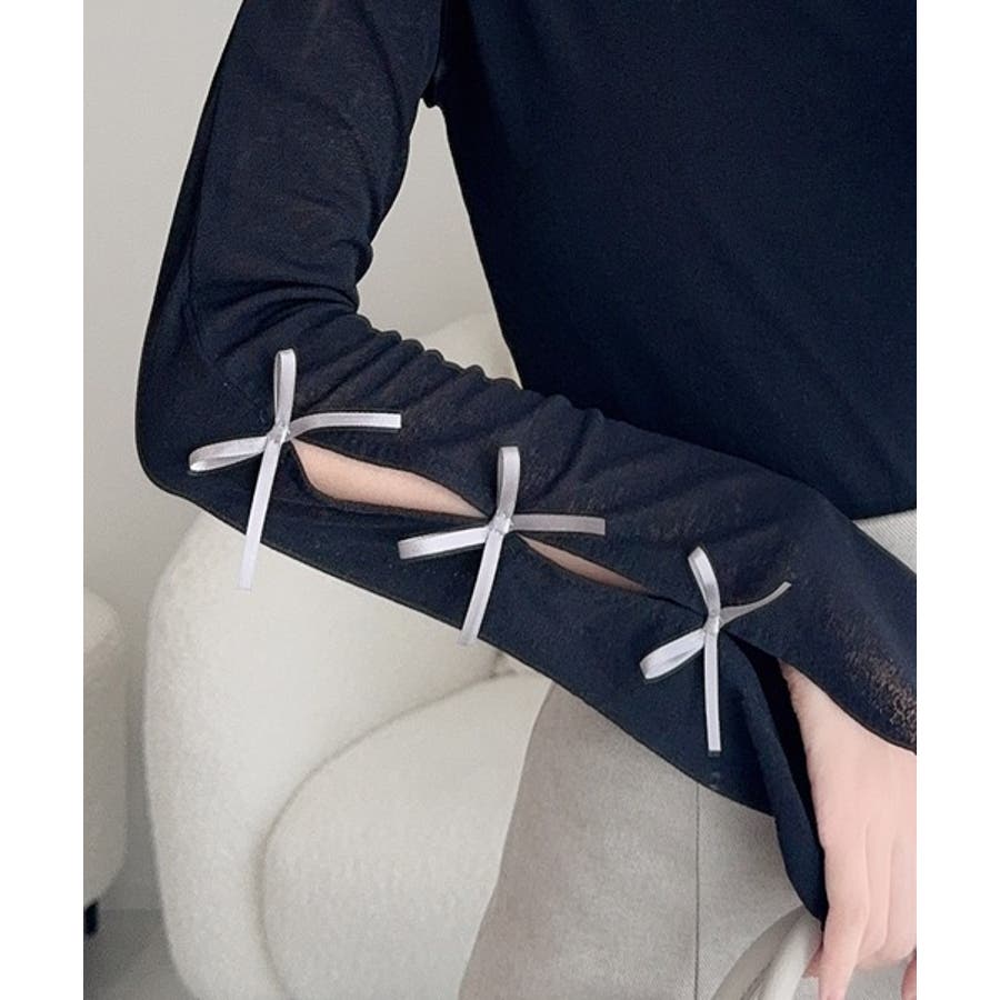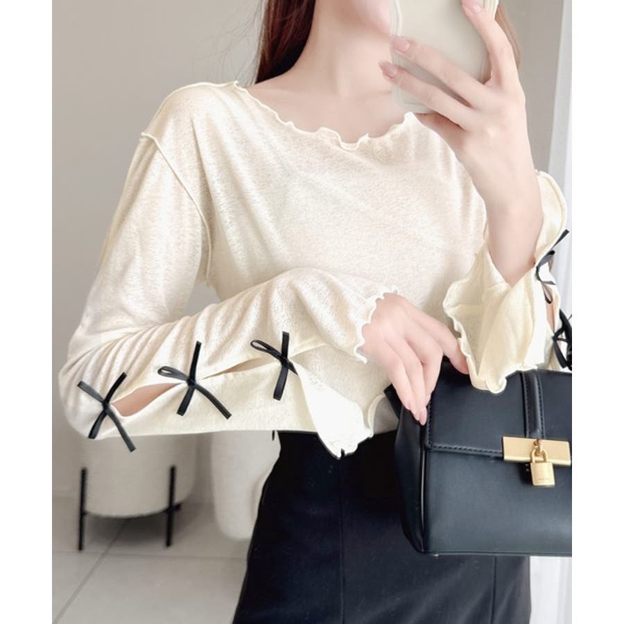 袖にトレンドのリボンをあしらったクルーネックインナー。