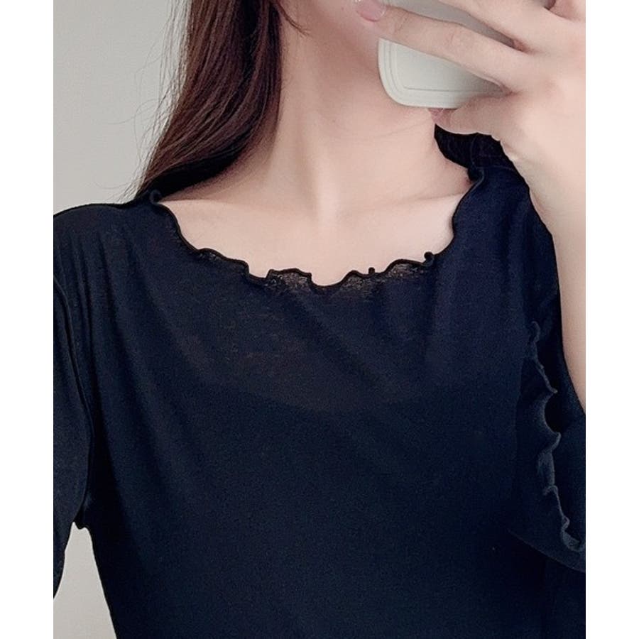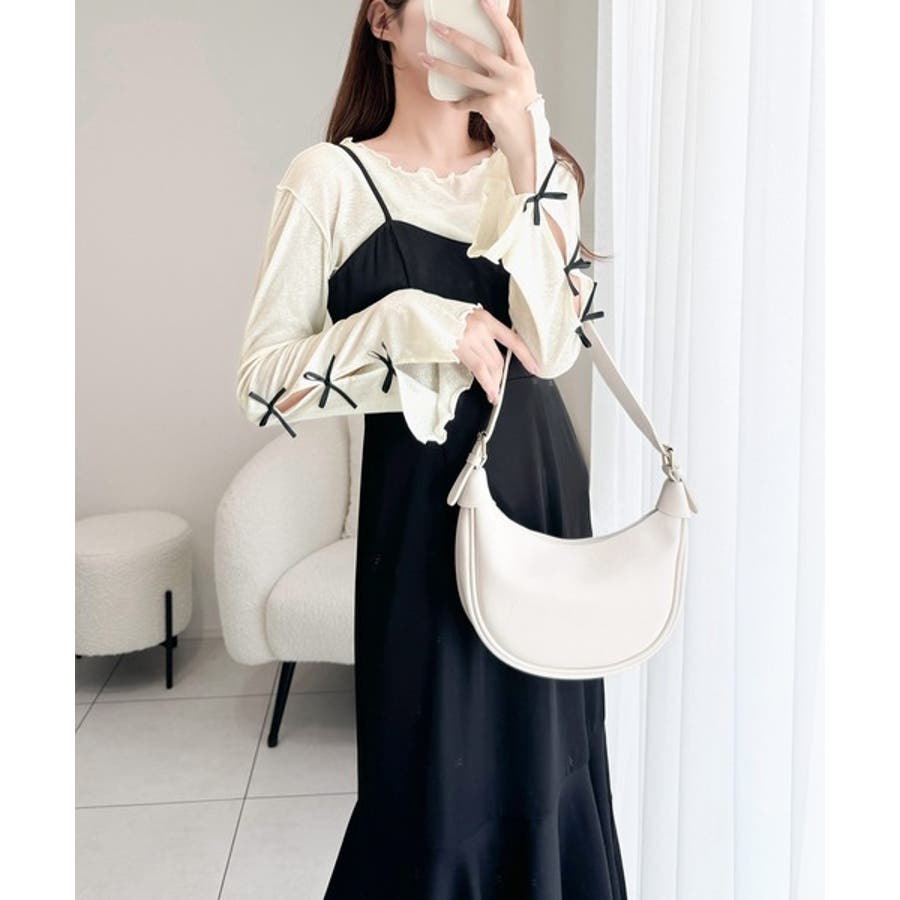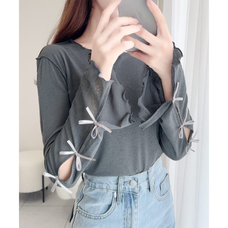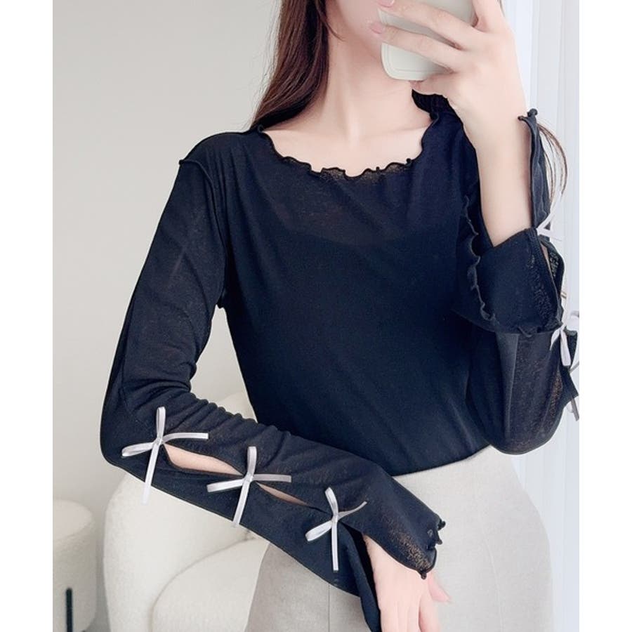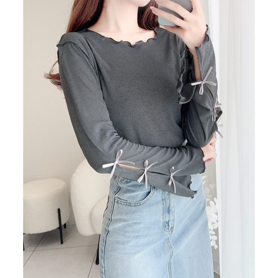 袖にトレンドのリボンをあしらったクルーネックインナー。