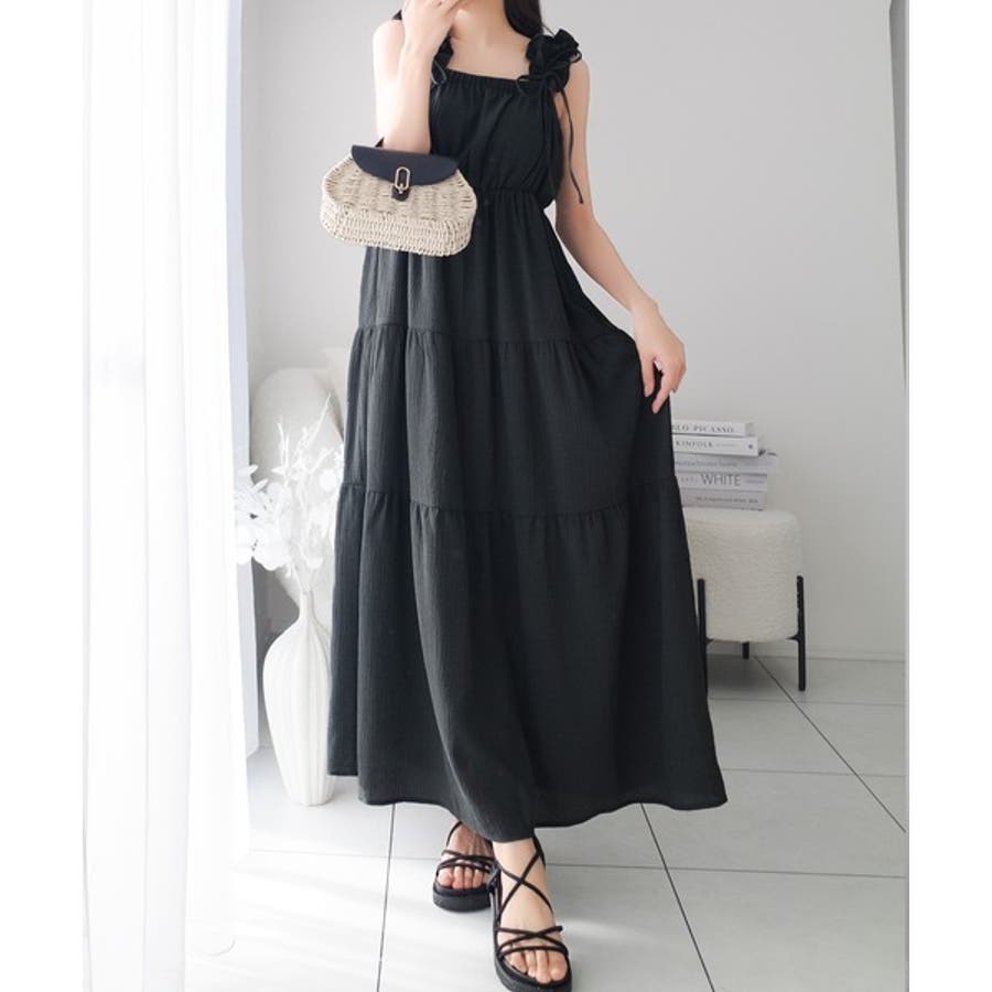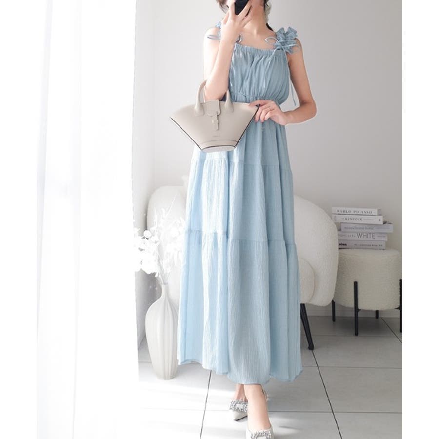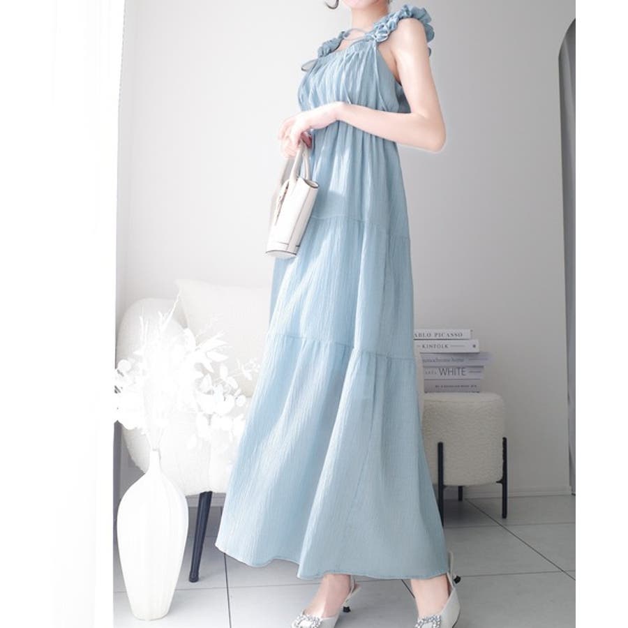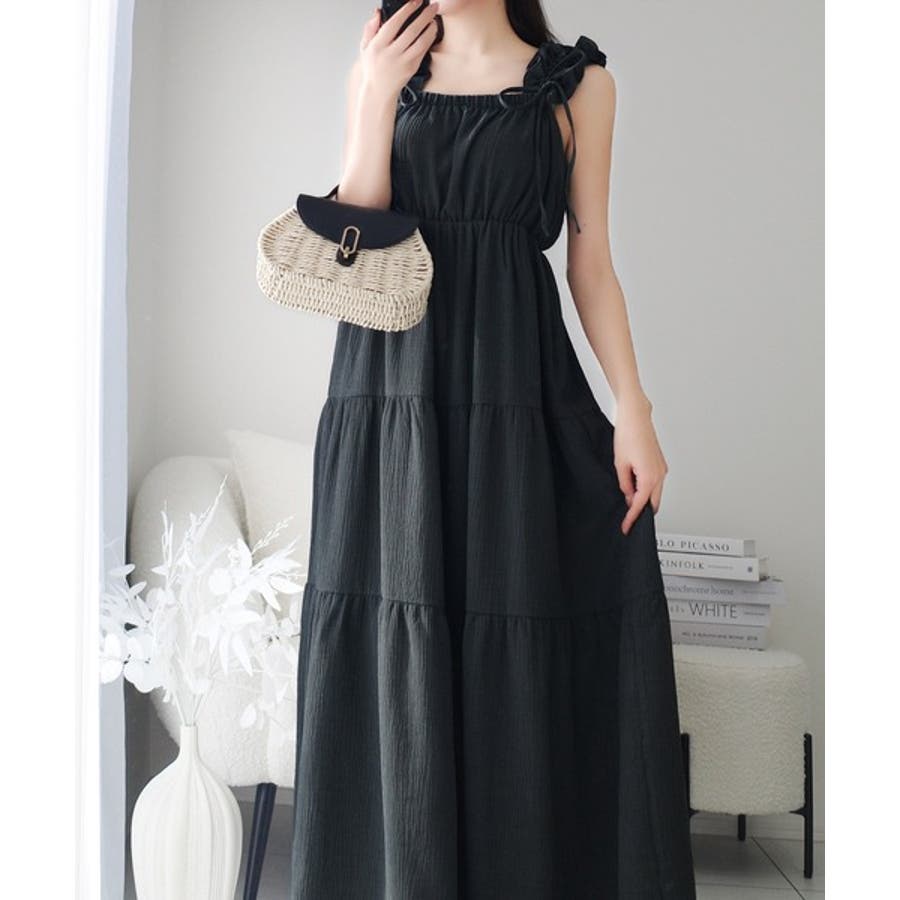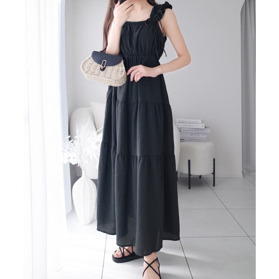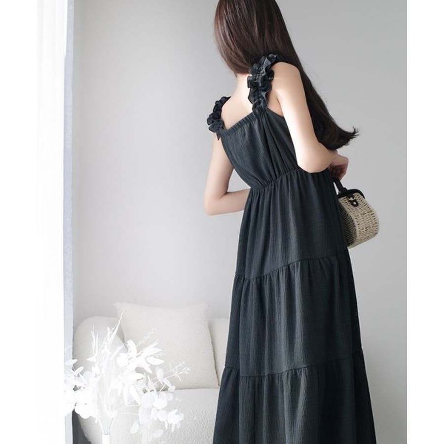 フリルデザインの肩紐が印象的な、エレガントなティアードワンピースです。