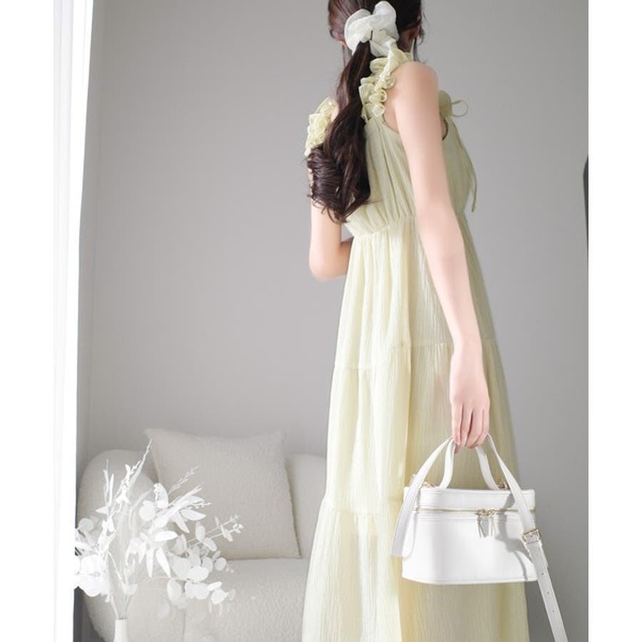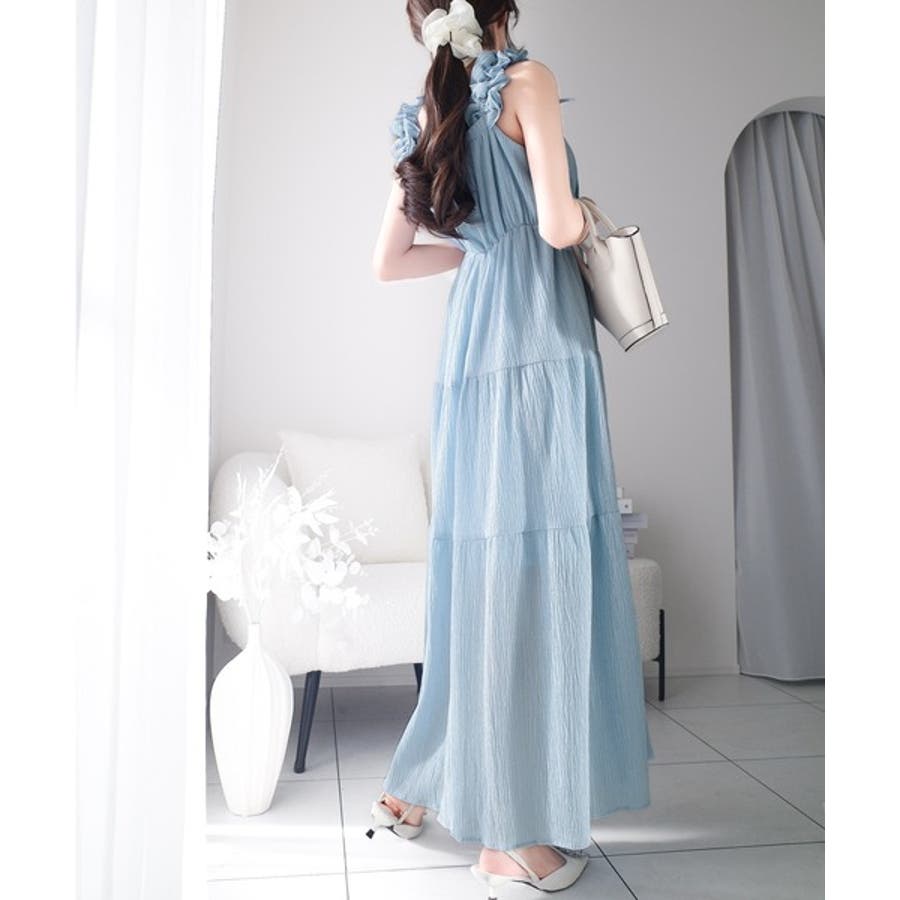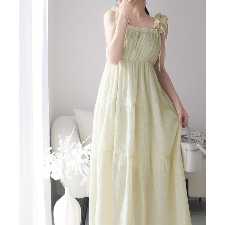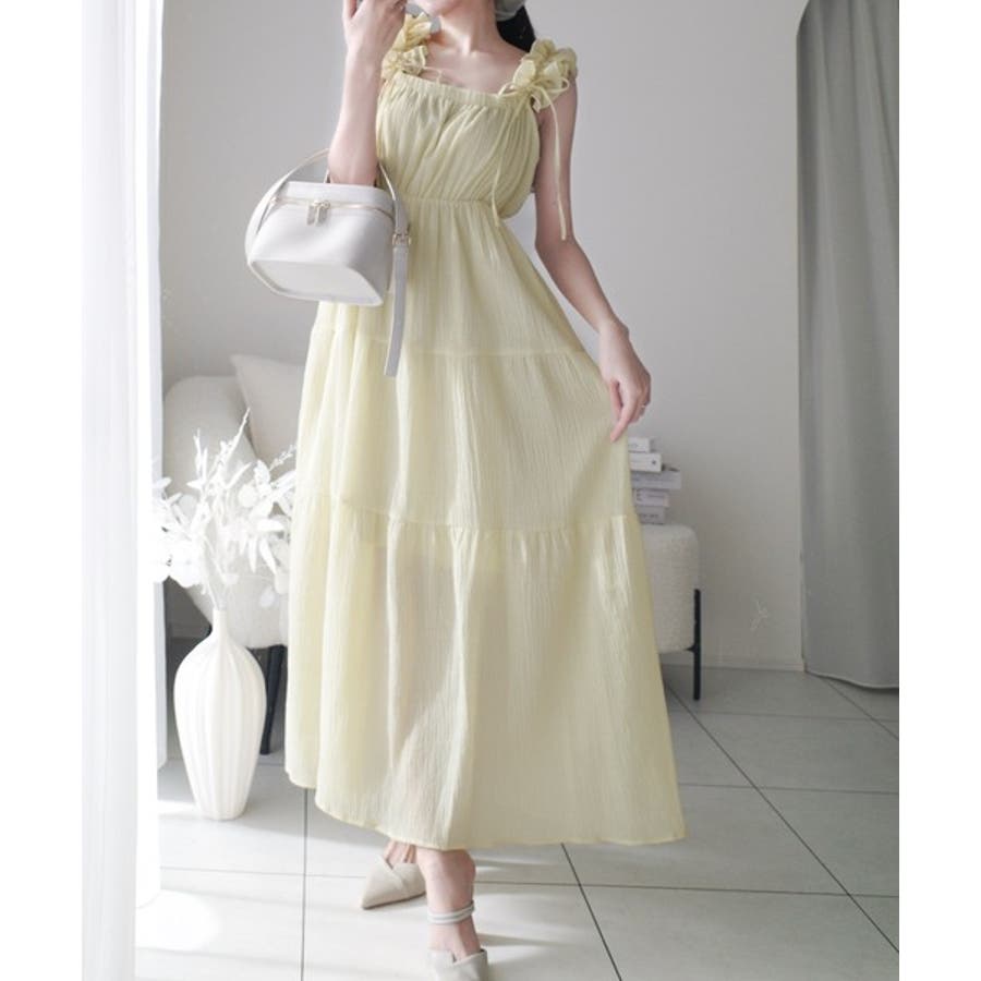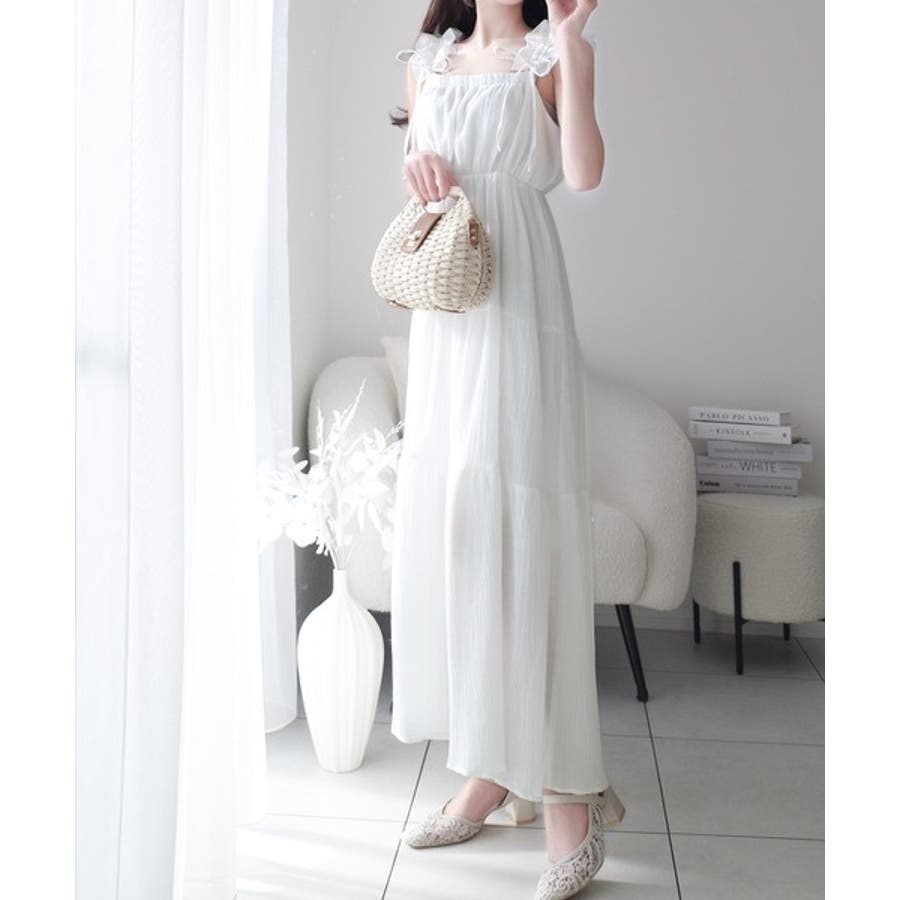 フリルデザインの肩紐が印象的な、エレガントなティアードワンピースです。