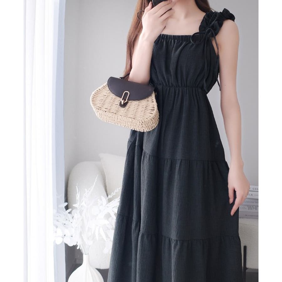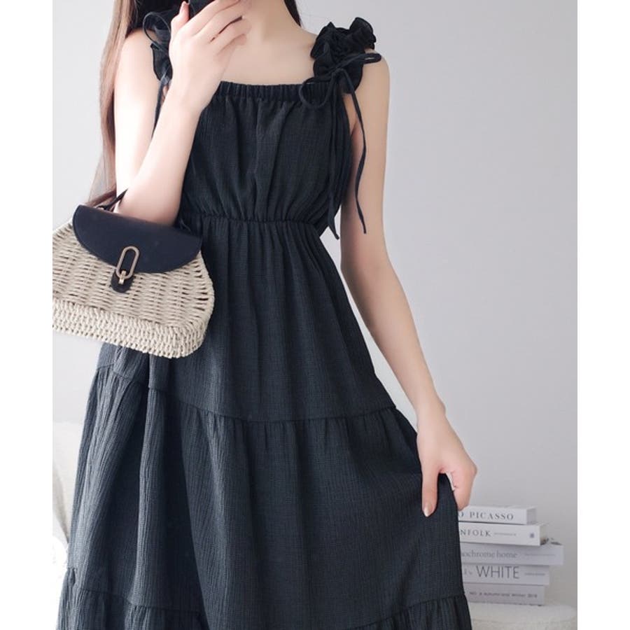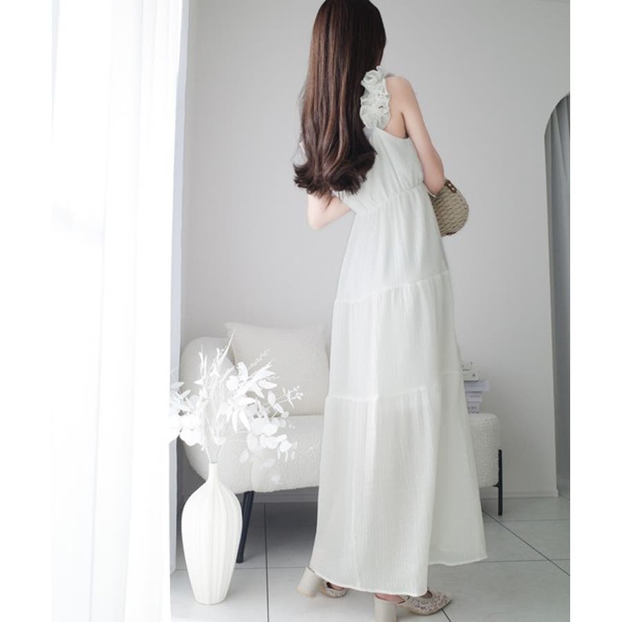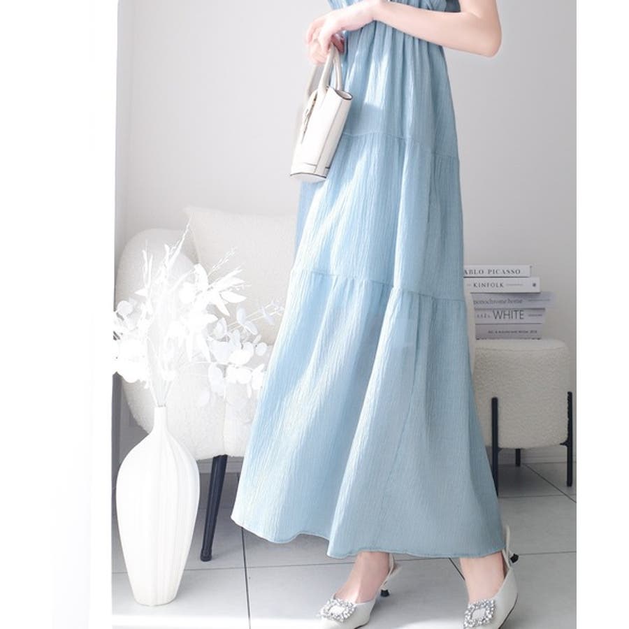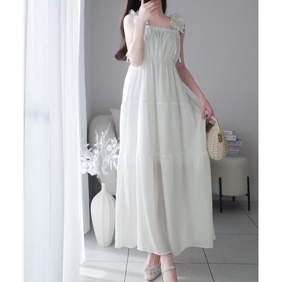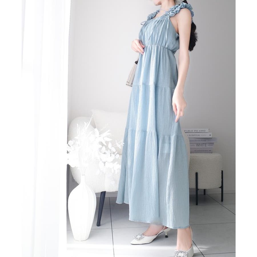フリルデザインの肩紐が印象的な、エレガントなティアードワンピースです。