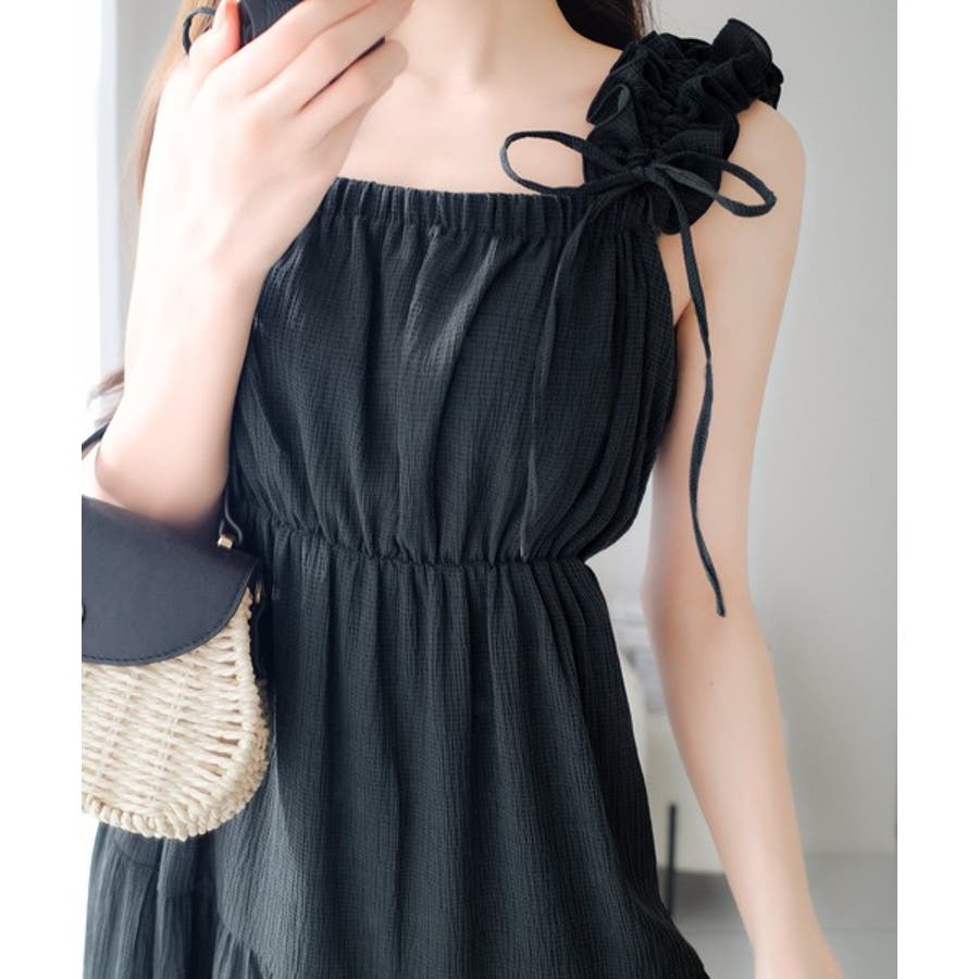 ワイドな肩紐のフリルデザインが目を引くティアードワンピースです。