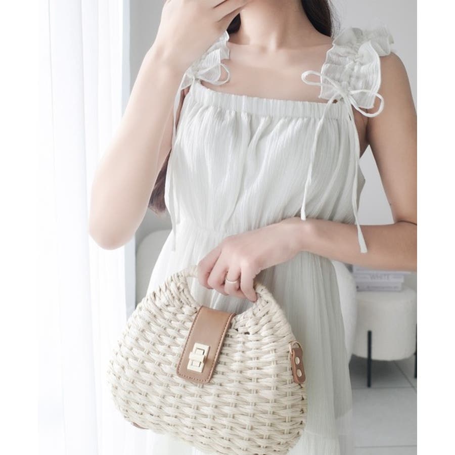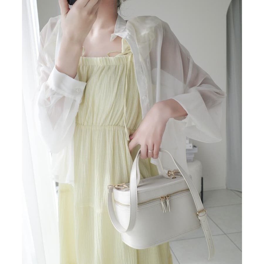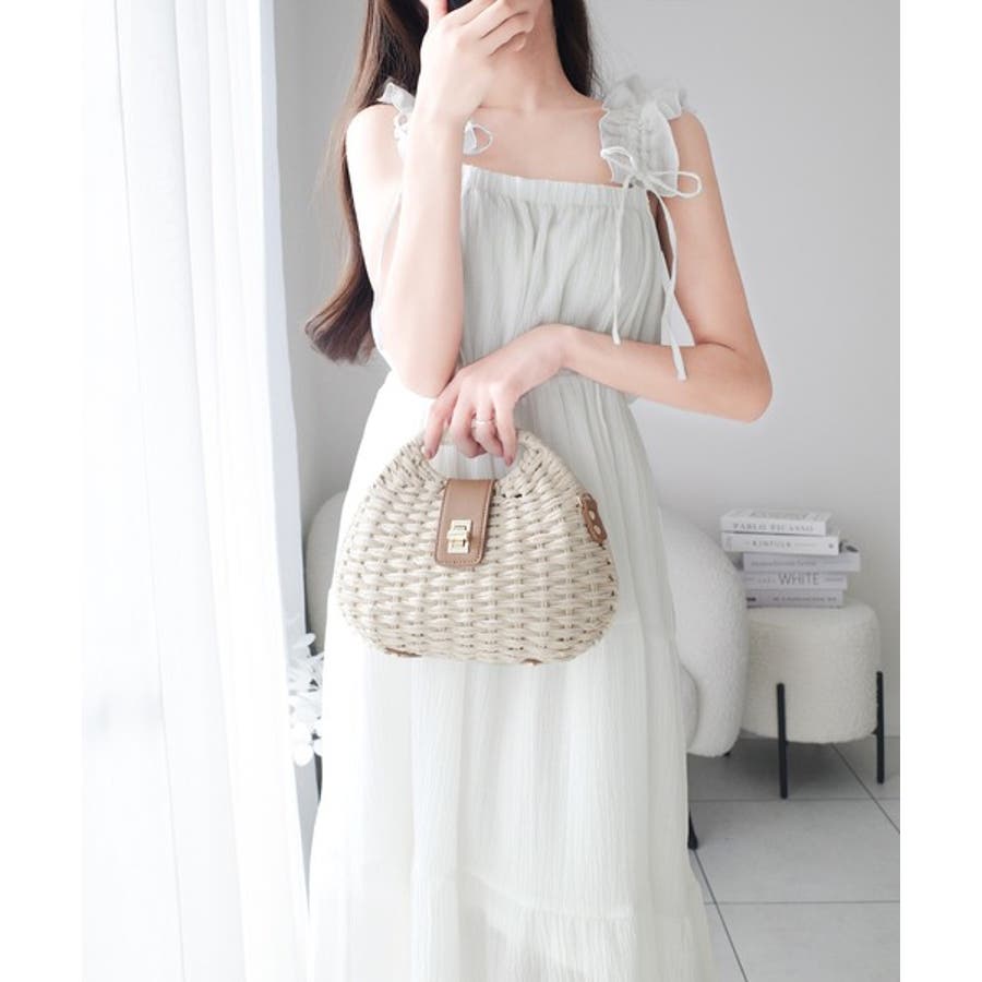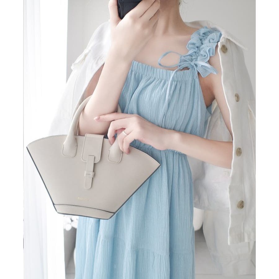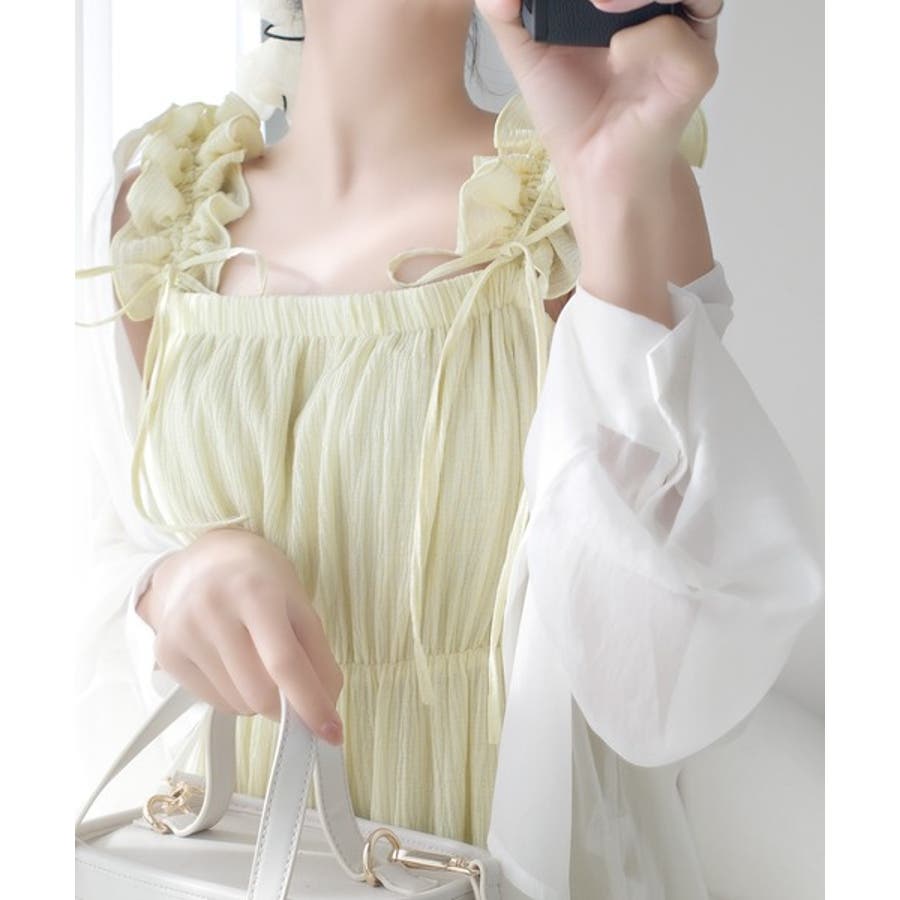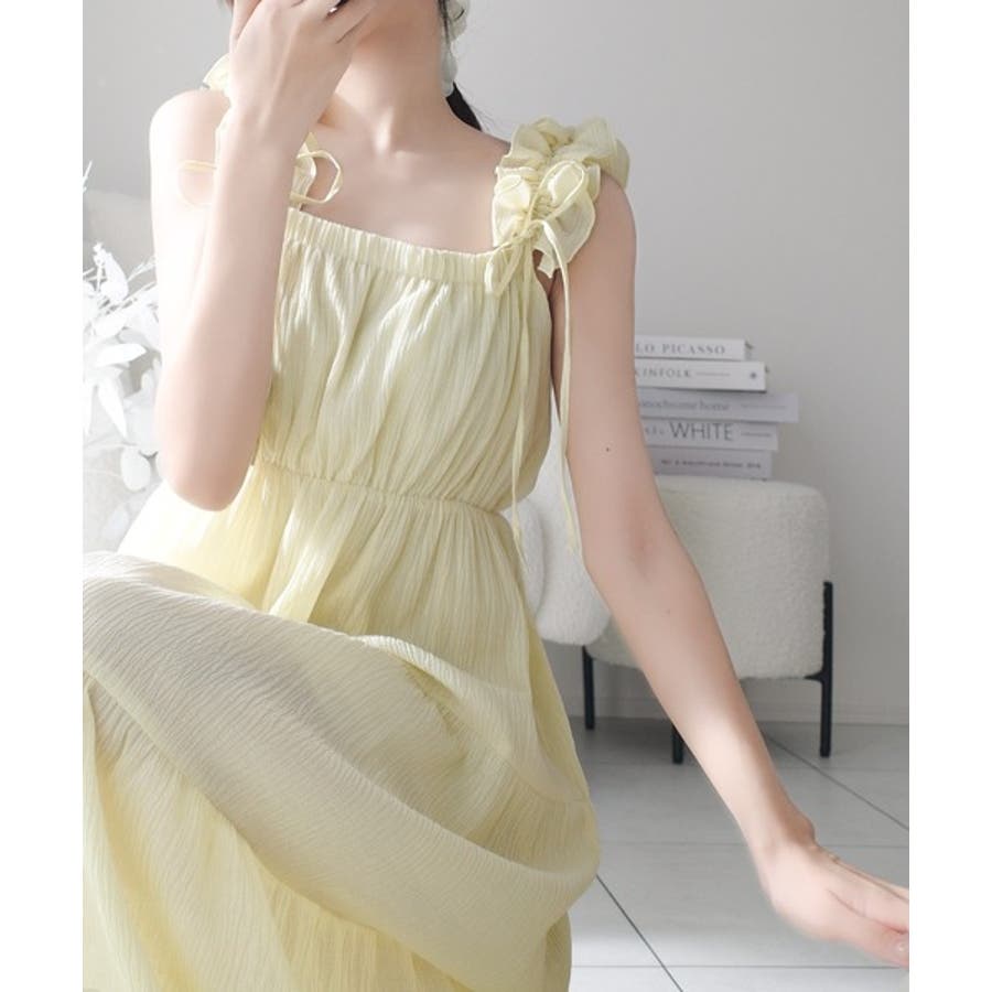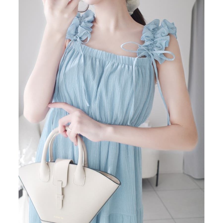 柔らかな素材感と、肩紐のフリルが大人の女性にぴったりの高級感を演出。