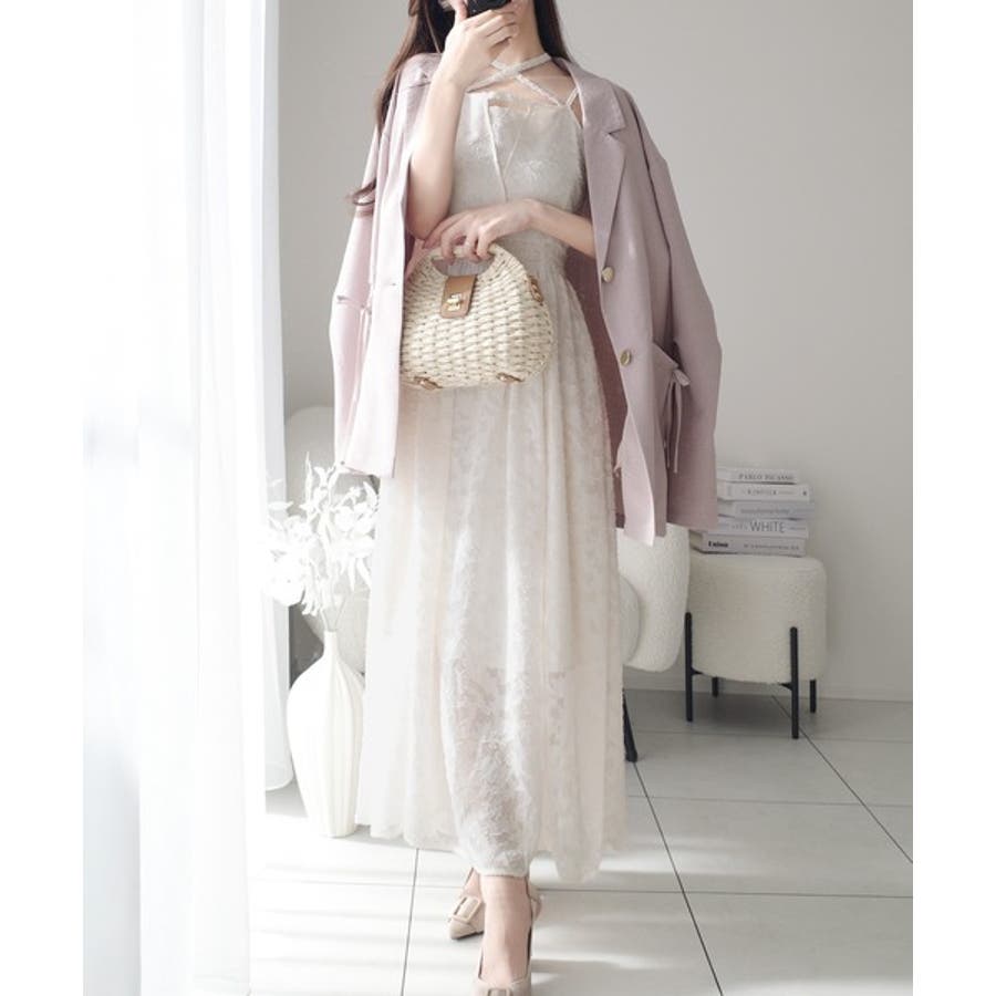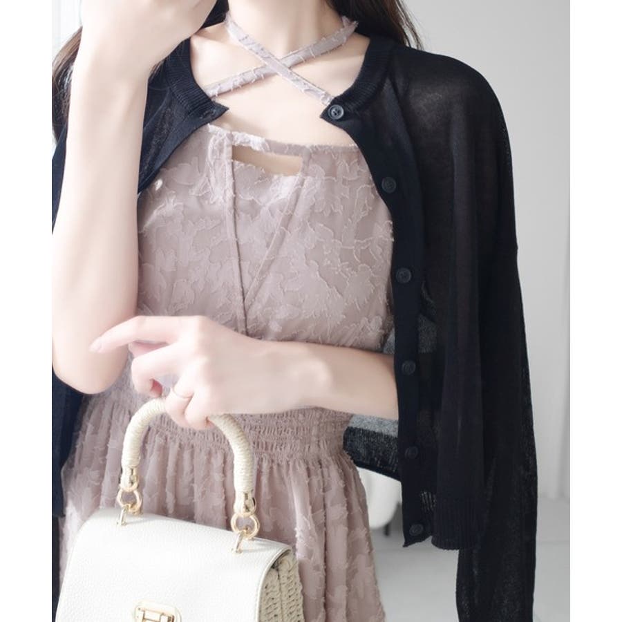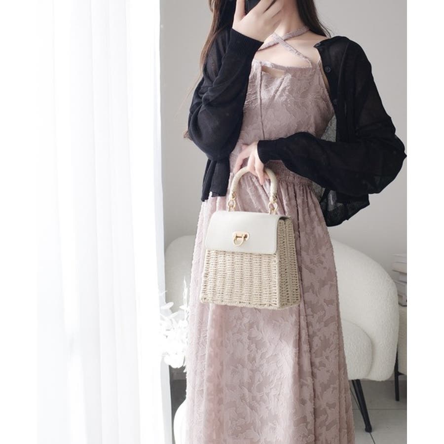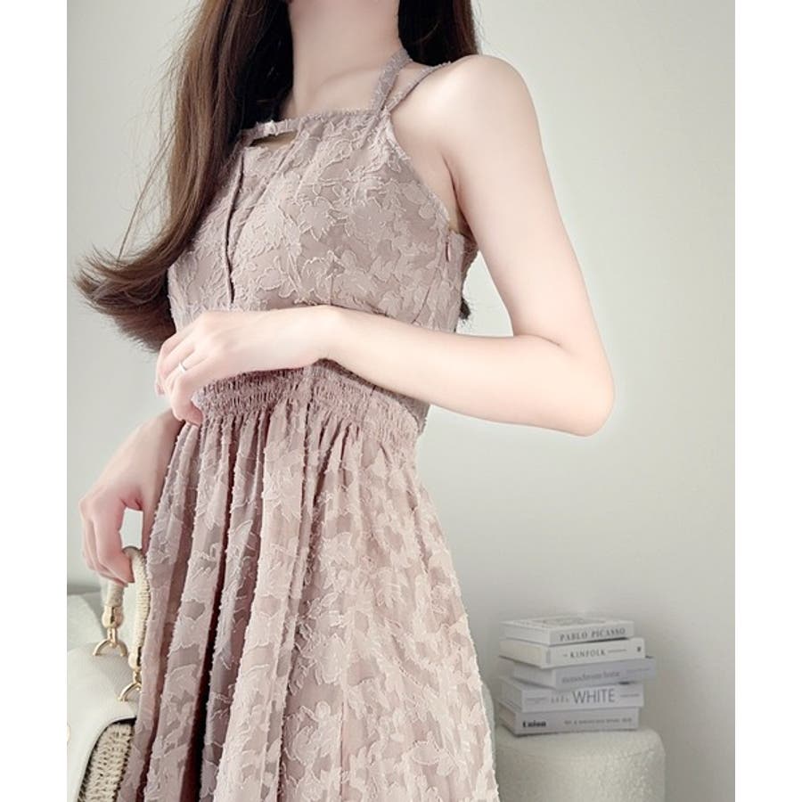 フリンジ見えのするジャガード素材で華やかさを演出するキャミワンピ。