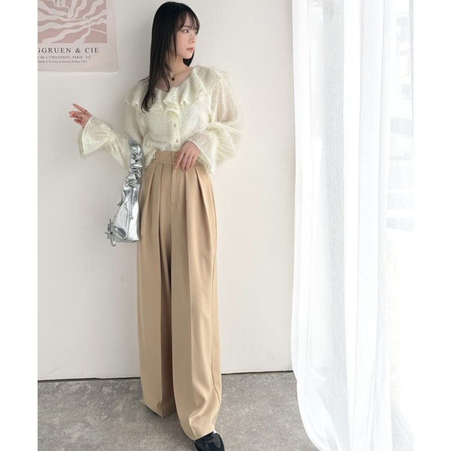 フリル襟を活かすために、ブラウスをタイトなスカートやハイウエストのパンツにイン。