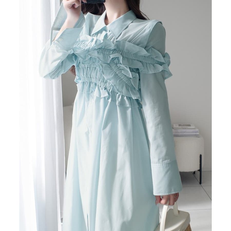 大人可愛いシャツワンピースに、トレンドのビスチェをドッキング。