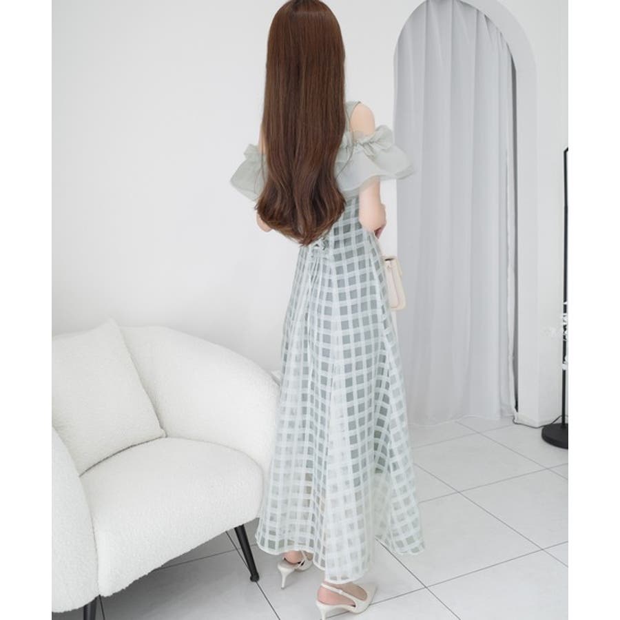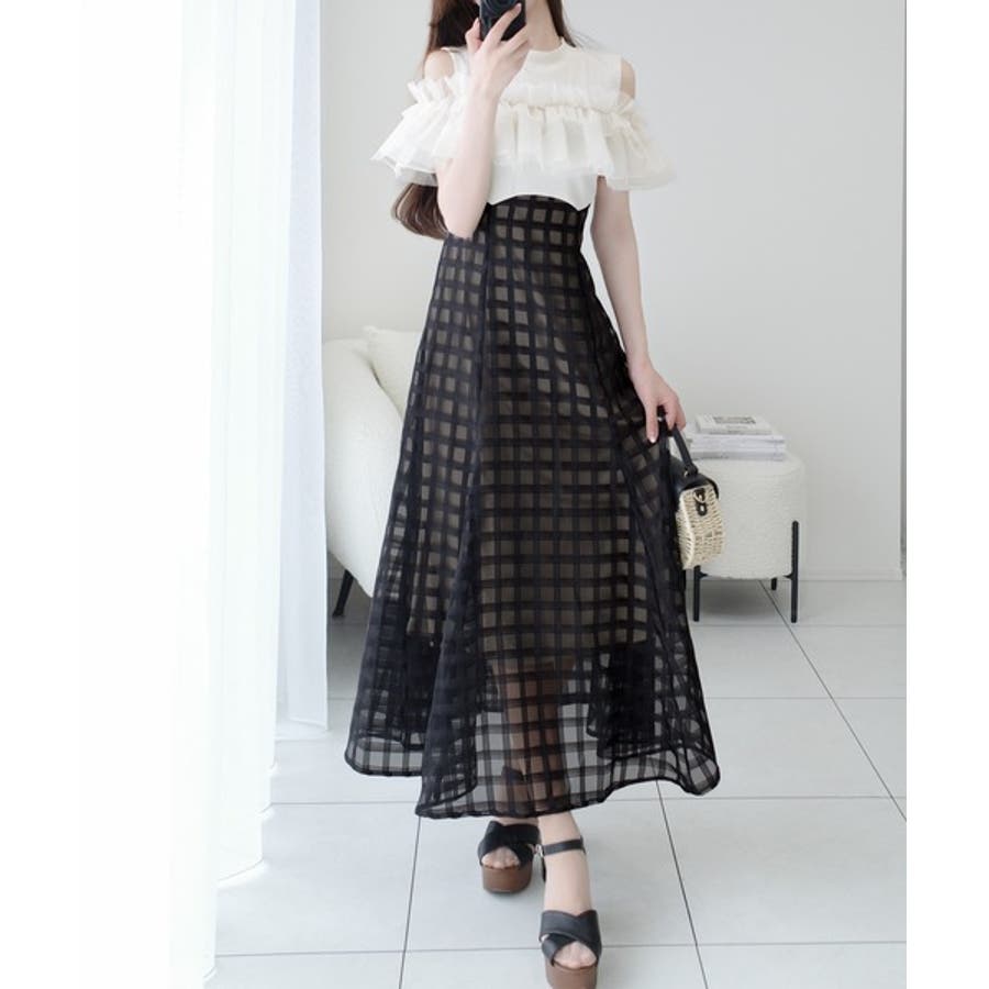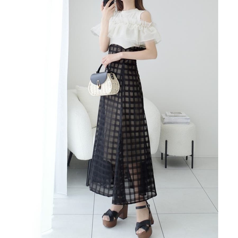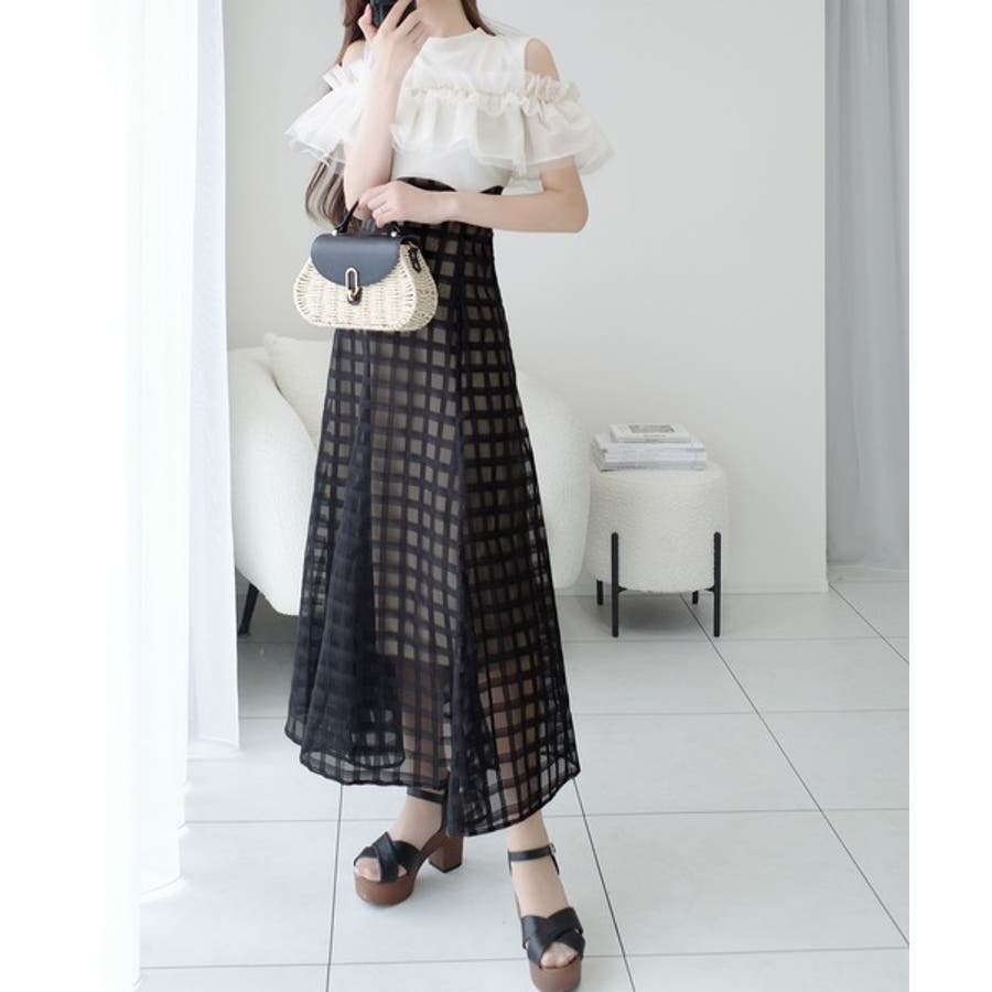 シアーチェックのスカートとハイウエスト切り替えで、脚長効果もバッチリ!