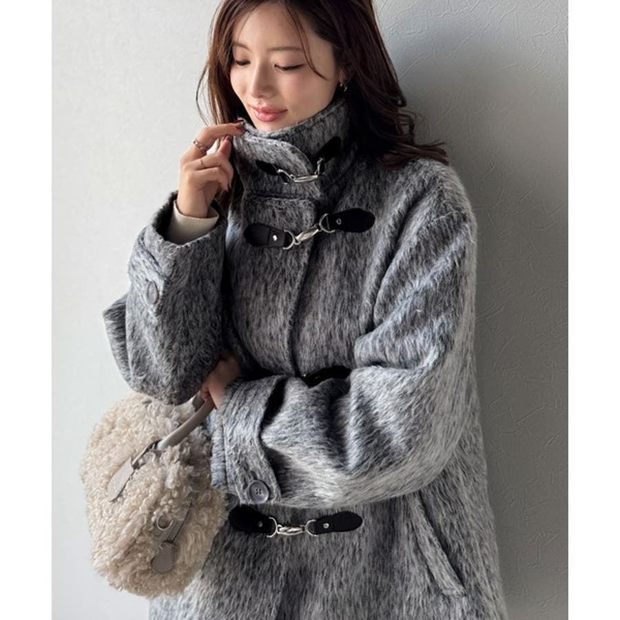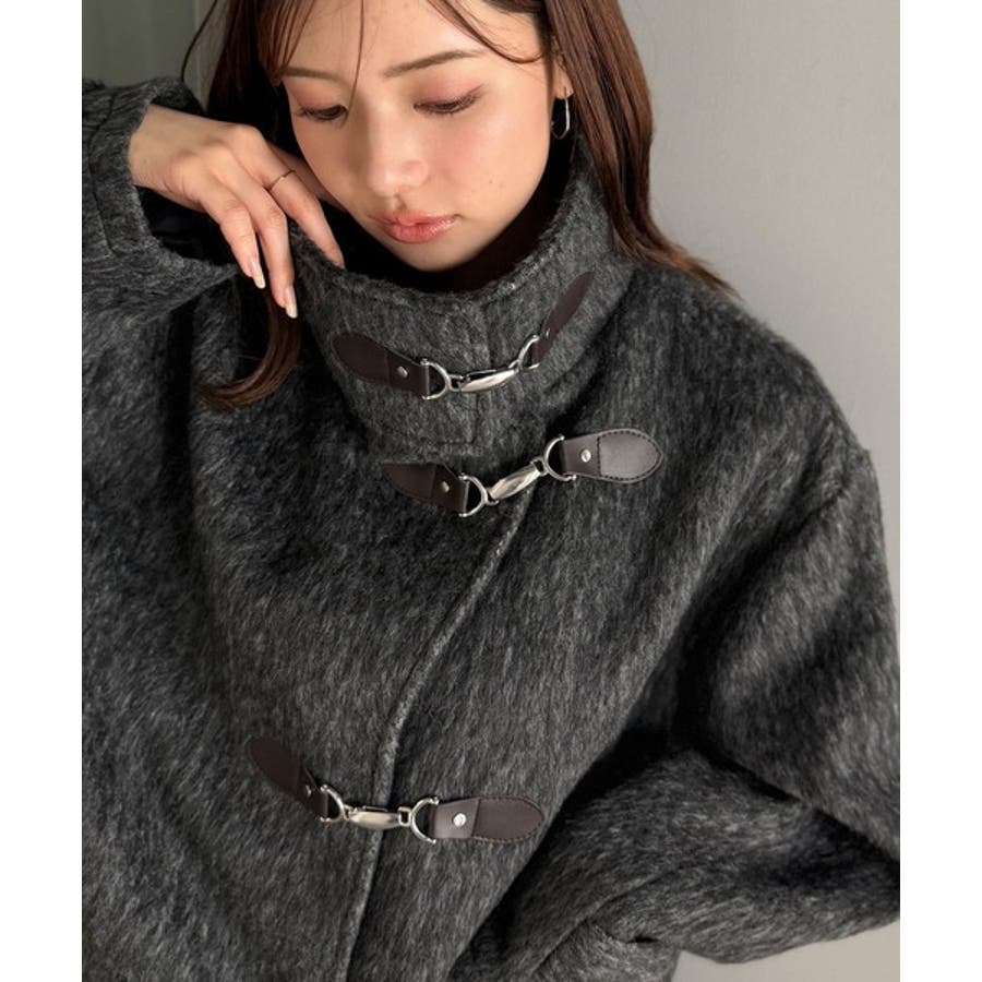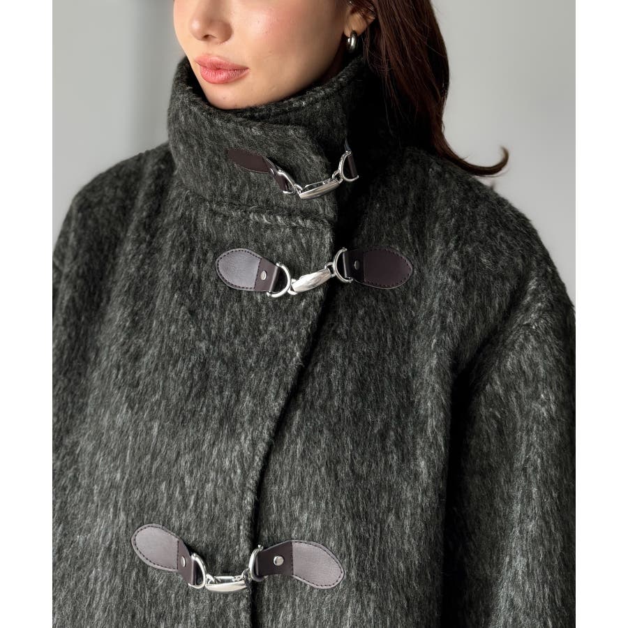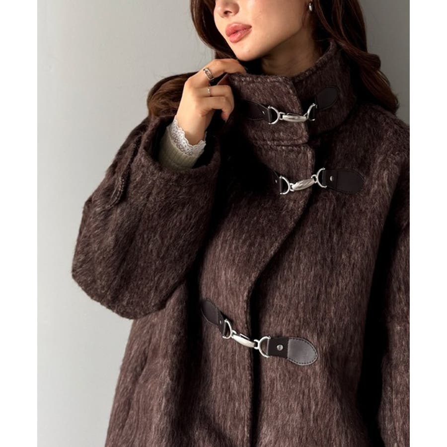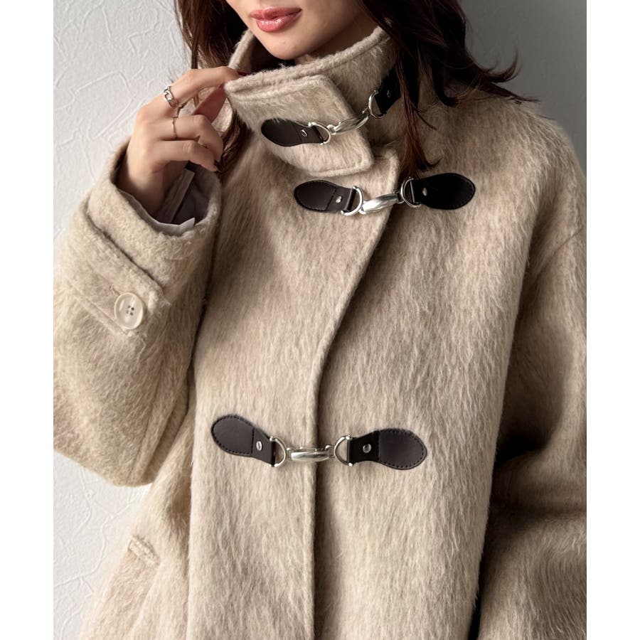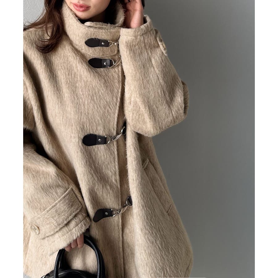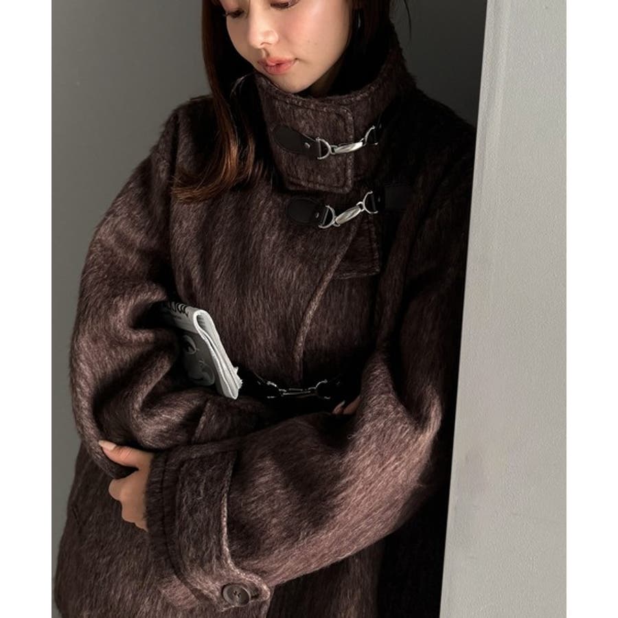 華やかさと暖かさを両立したフェザーシャギーバックル使いコート。