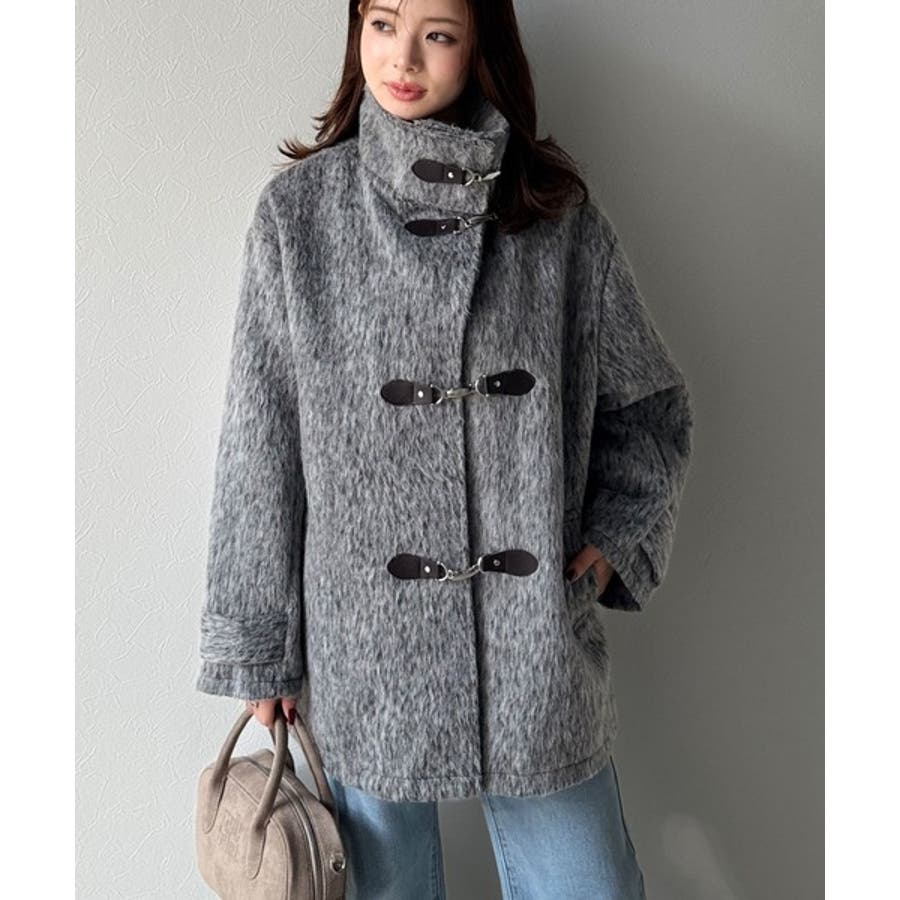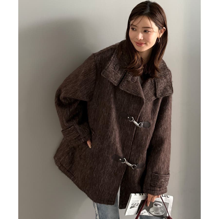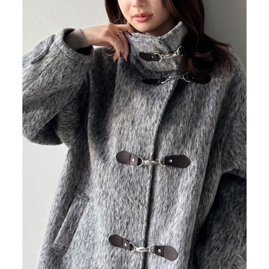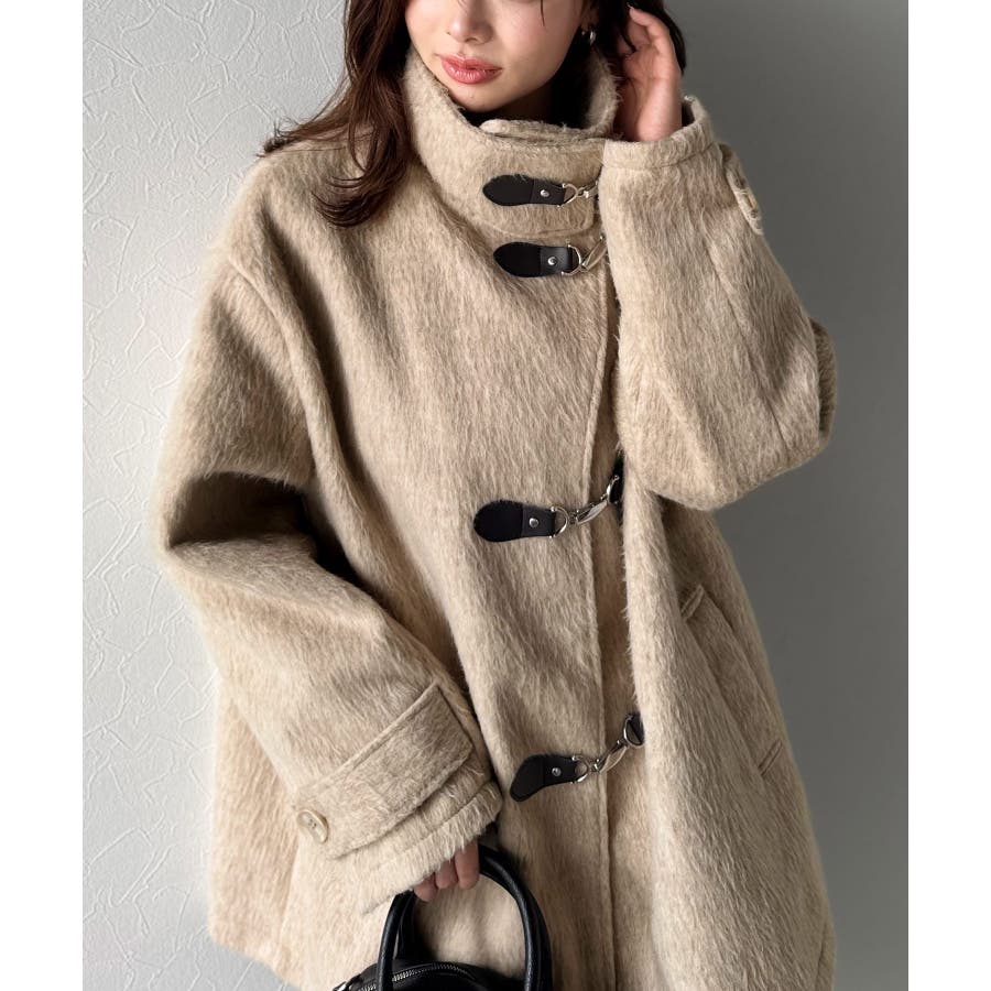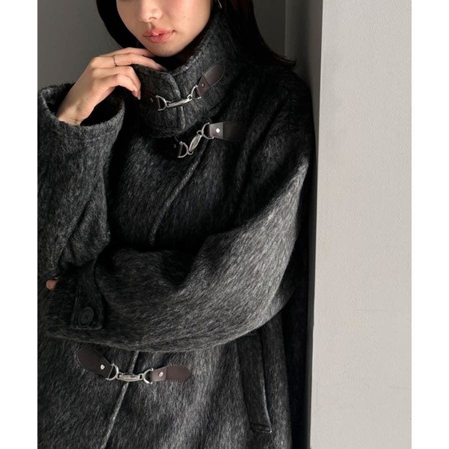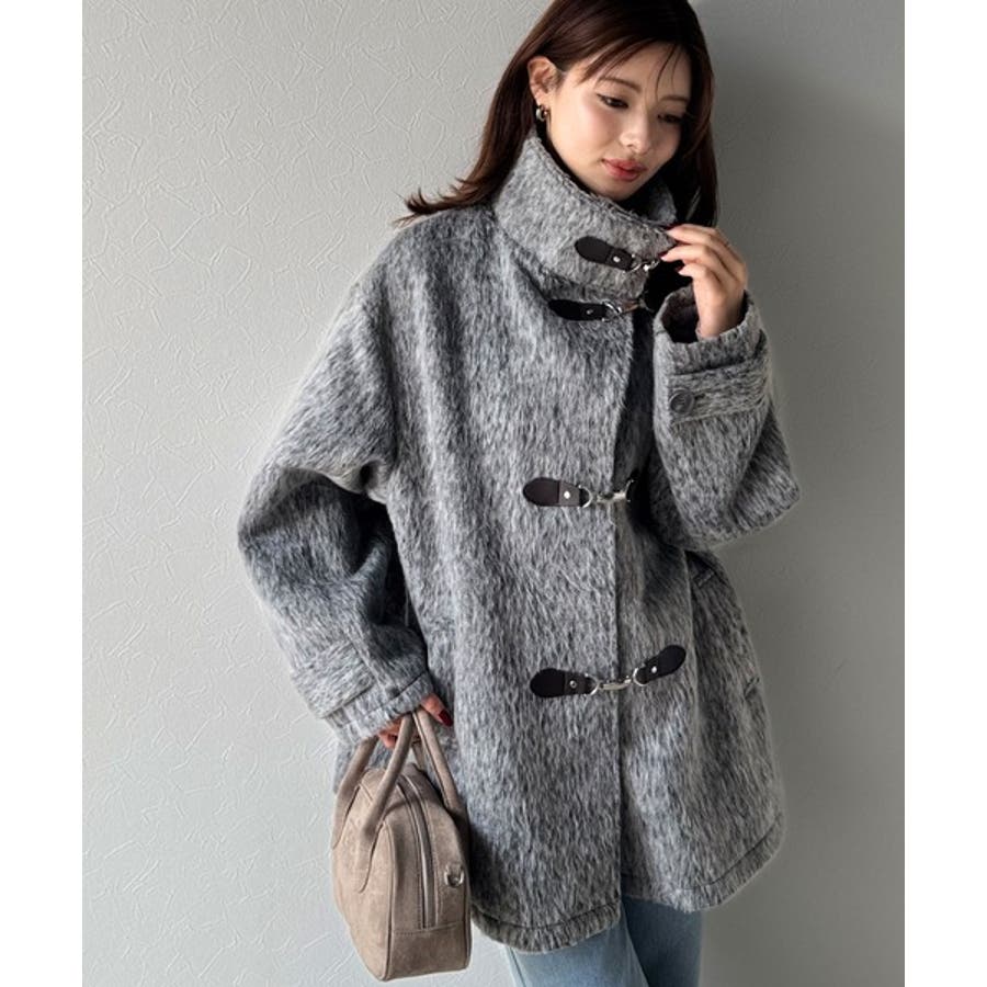 華やかさと暖かさを両立したフェザーシャギーバックル使いコート。