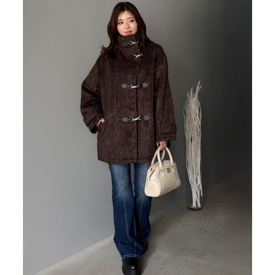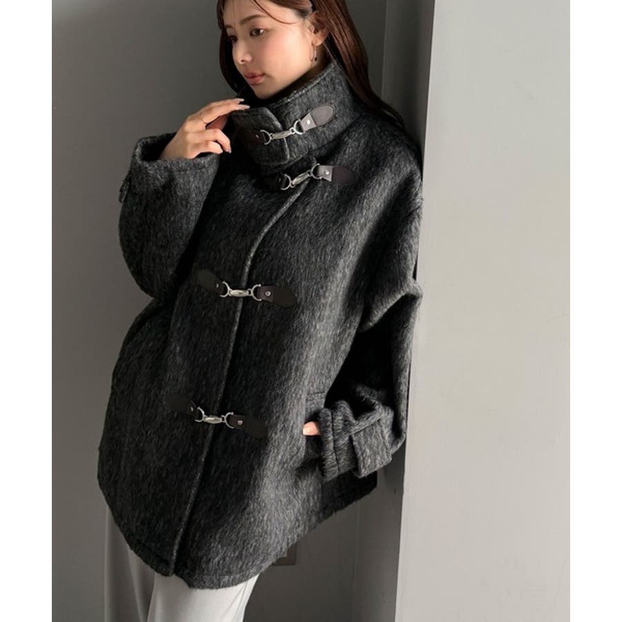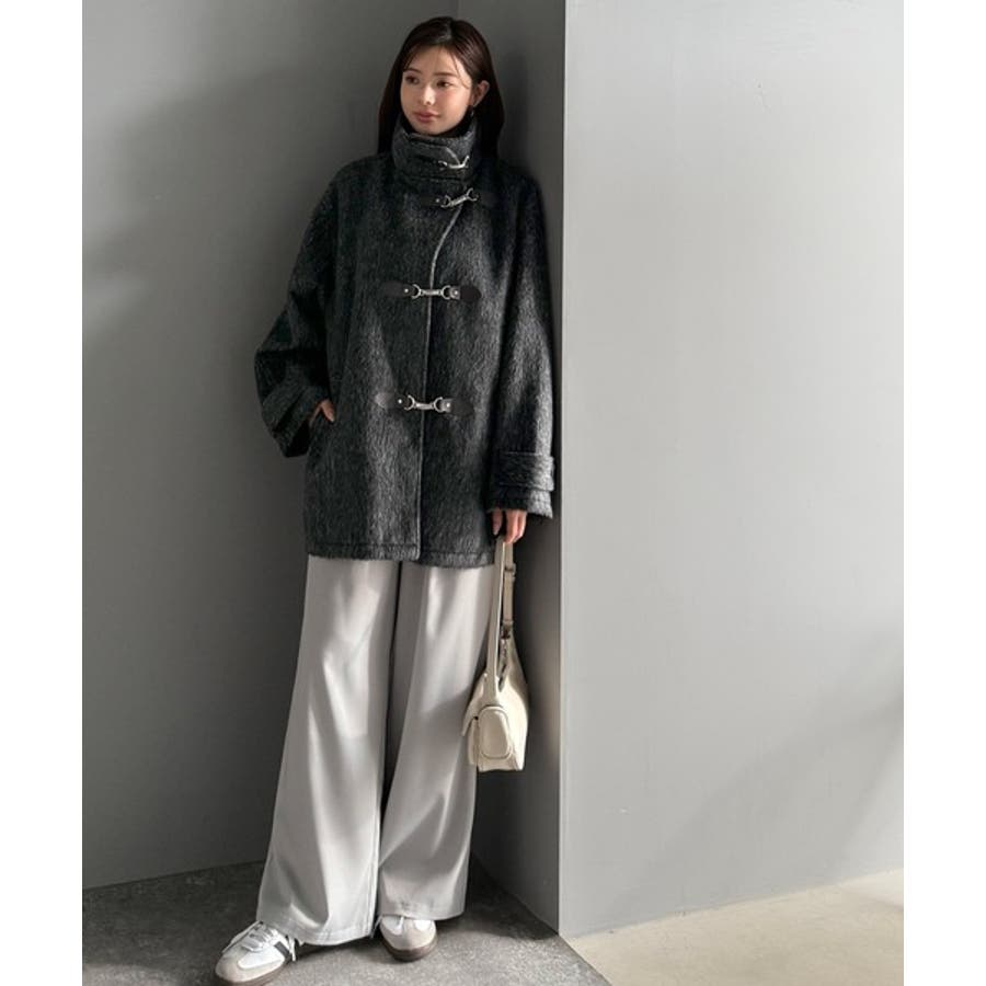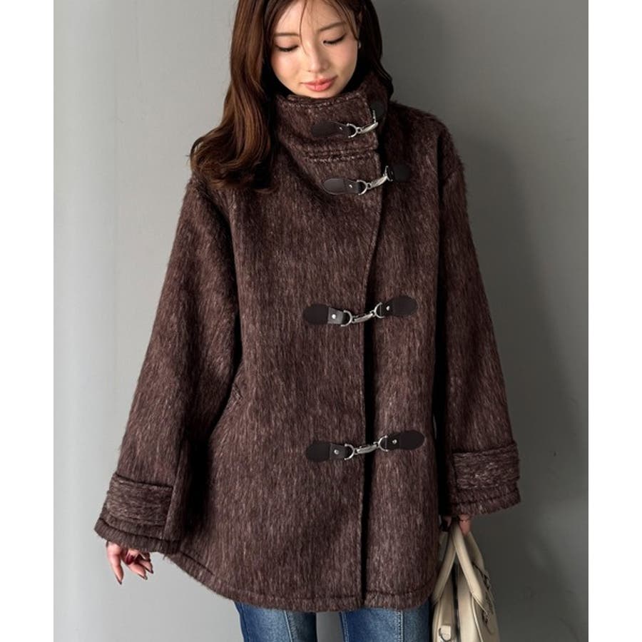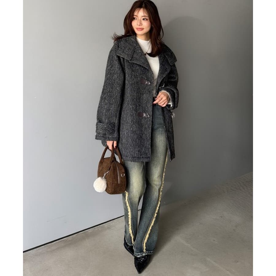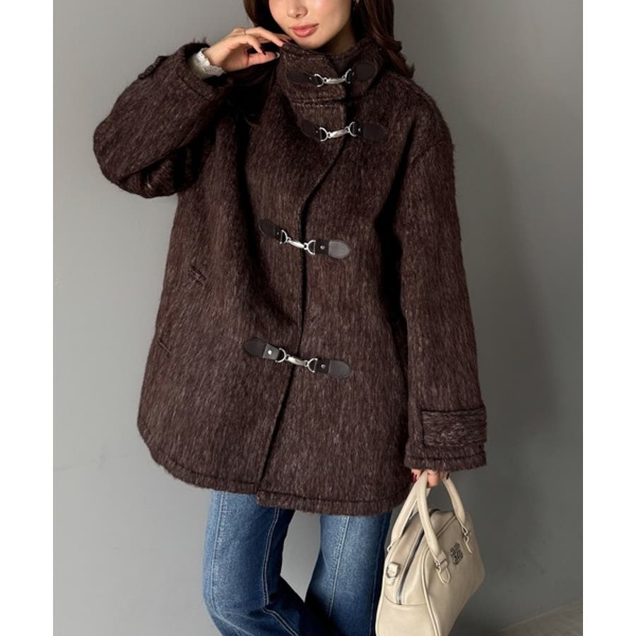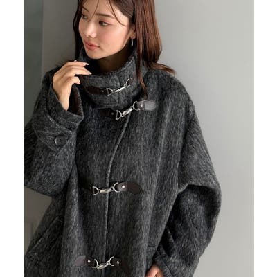 華やかさと暖かさを両立したフェザーシャギーバックル使いコート。