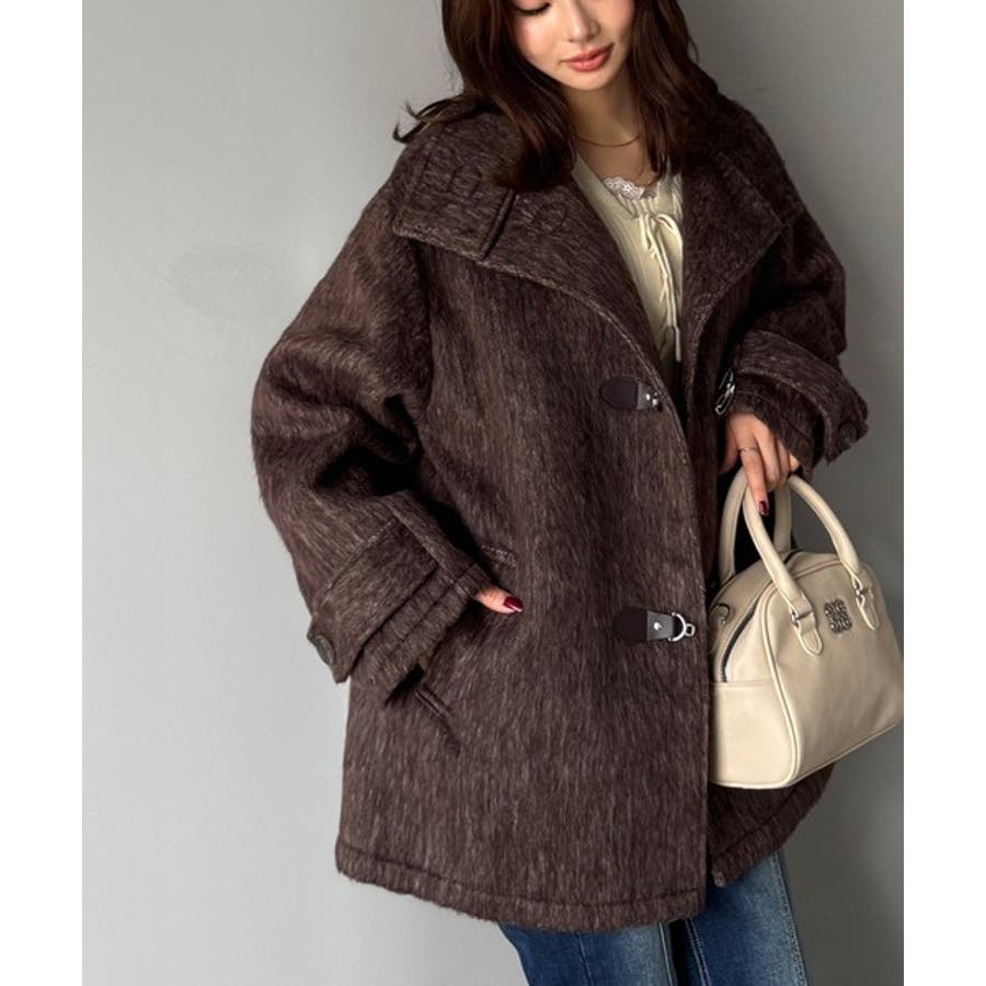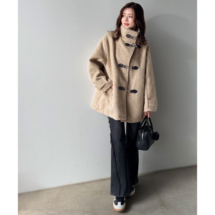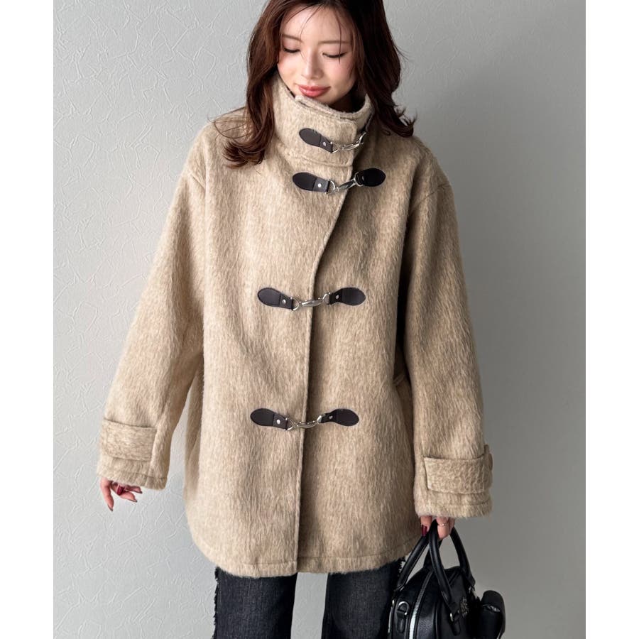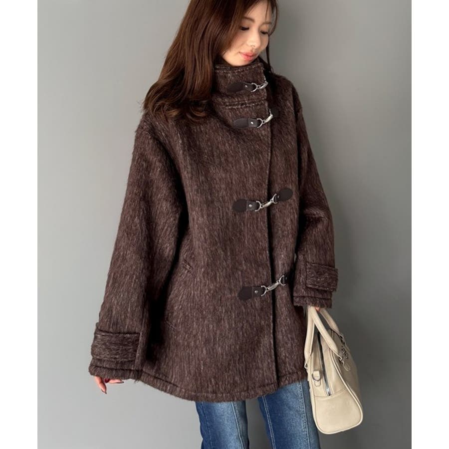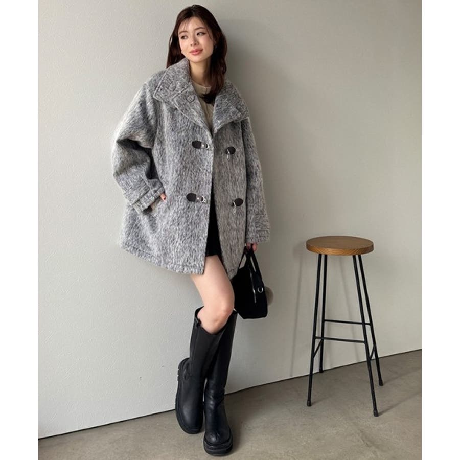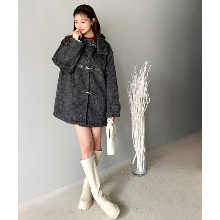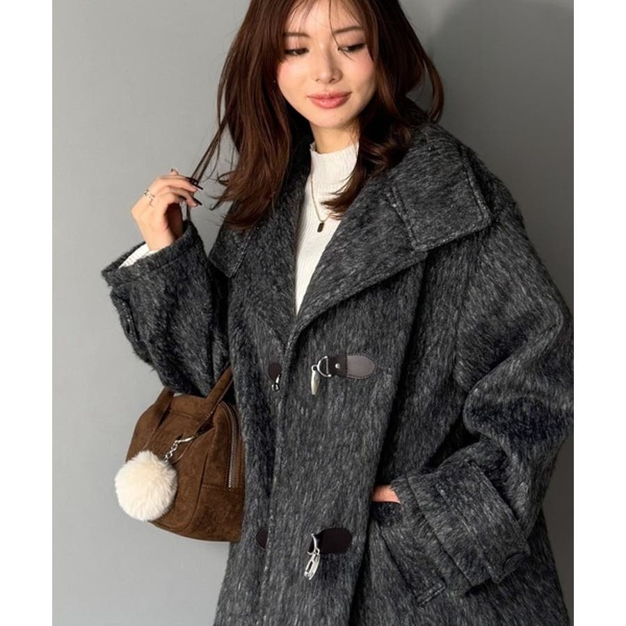 華やかさと暖かさを両立したフェザーシャギーバックル使いコート。