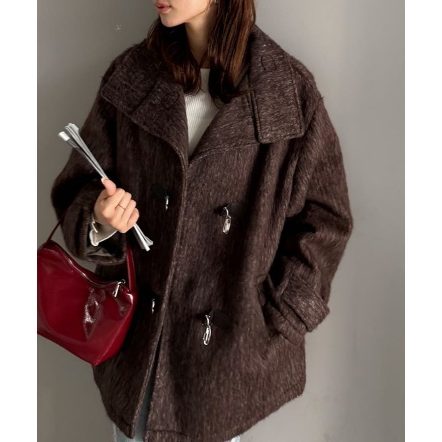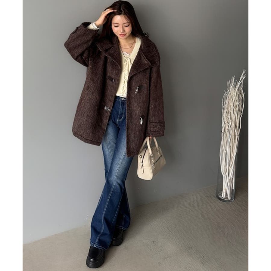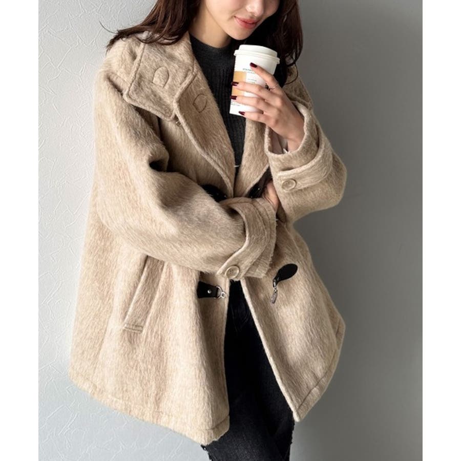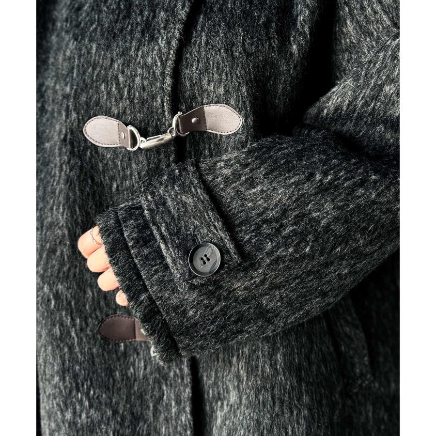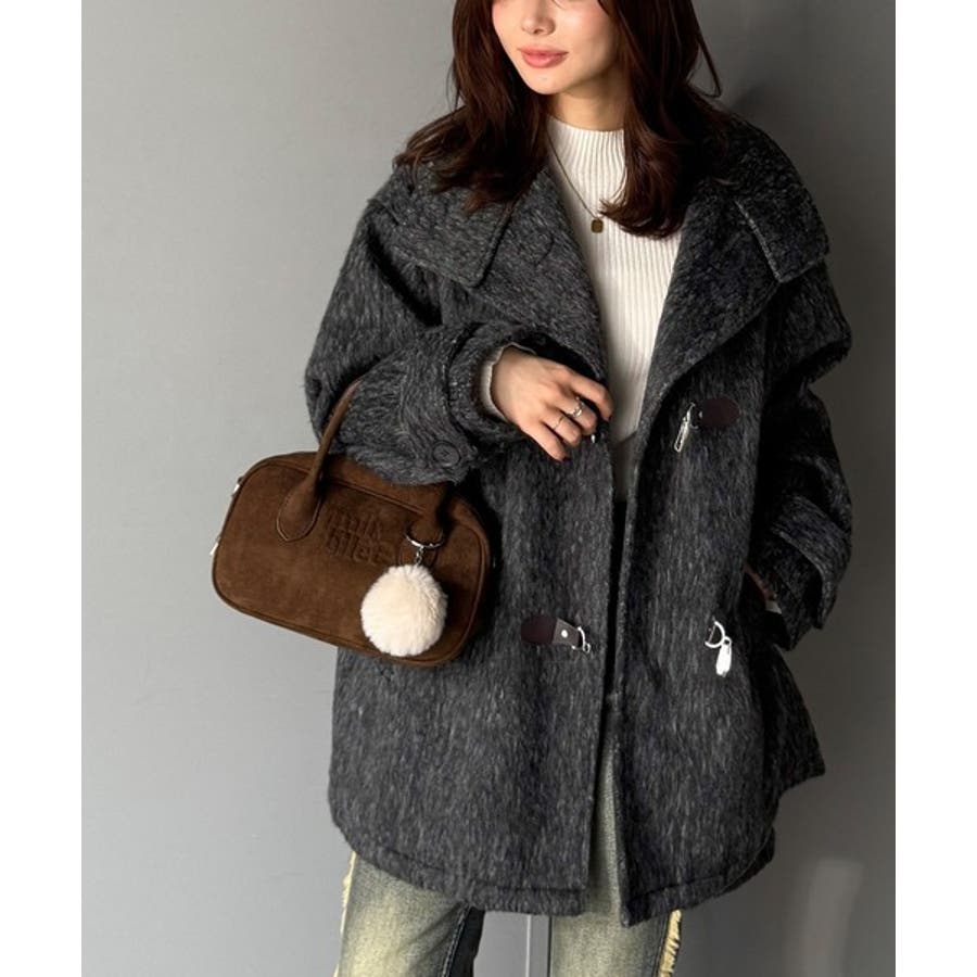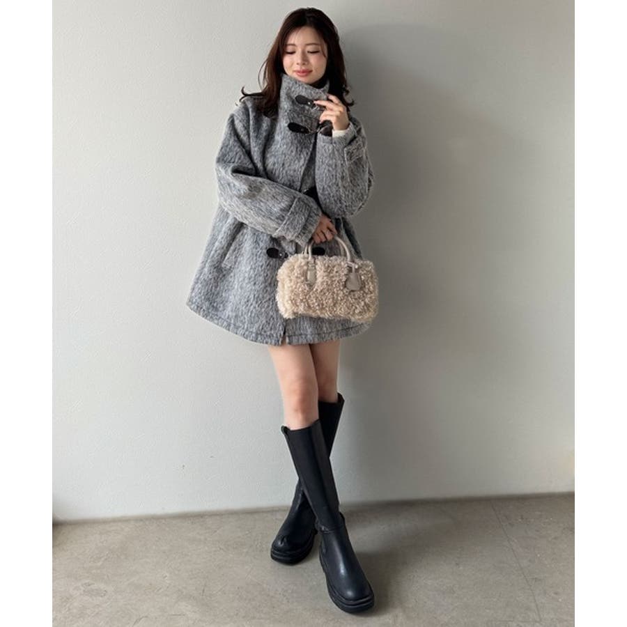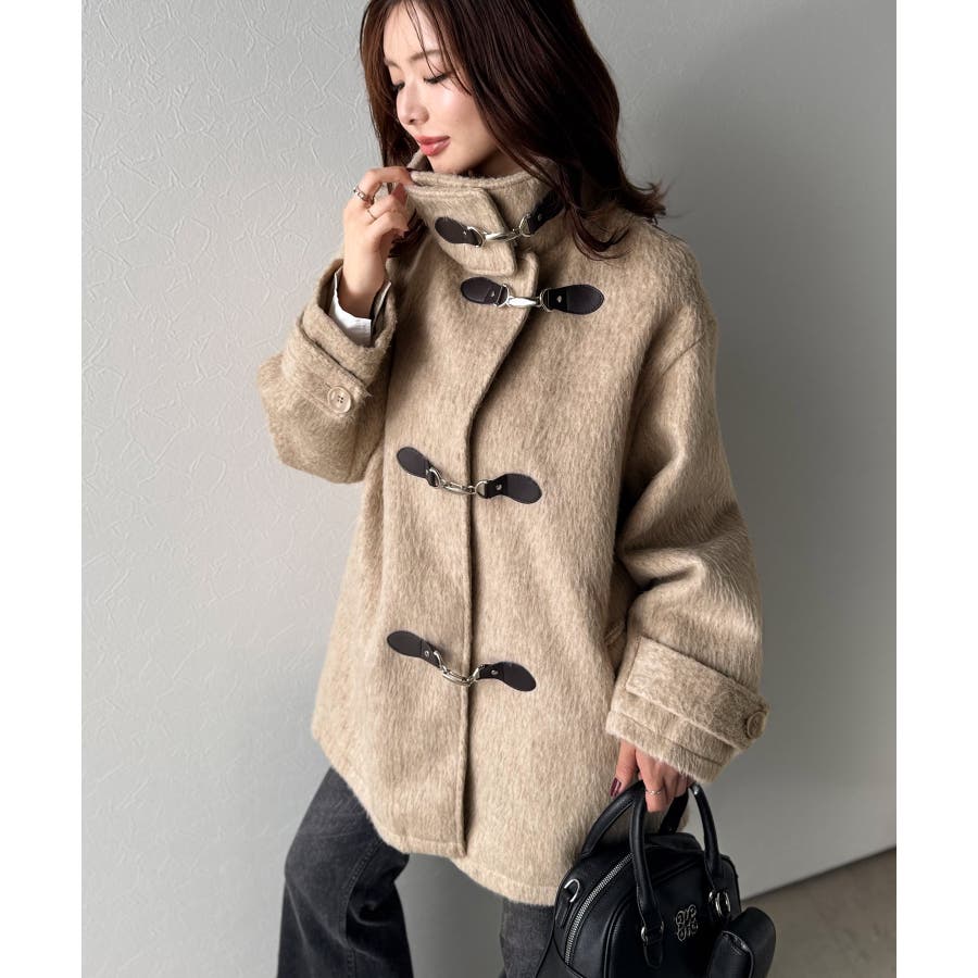 華やかさと暖かさを両立したフェザーシャギーバックル使いコート。